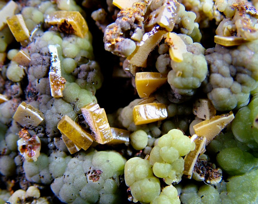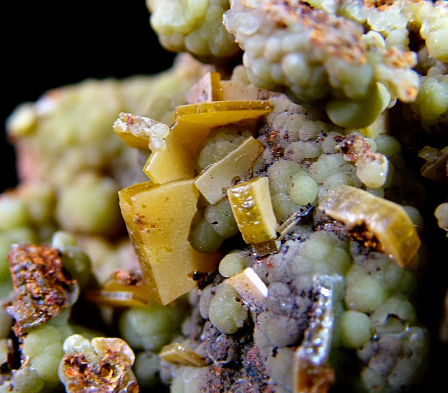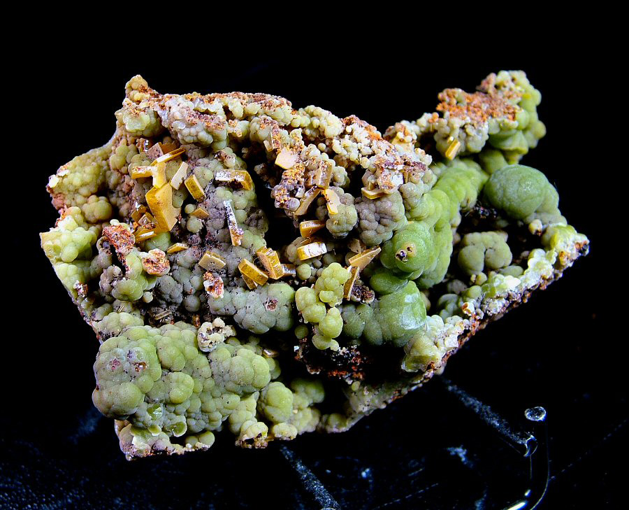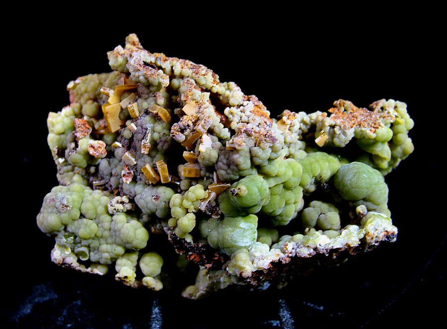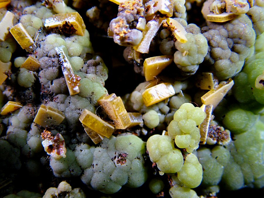 Lustrous yellow Wulfenite's crystals are scattered on a noce green colored mammellonar Mimetite, with a good chromatic contrast.