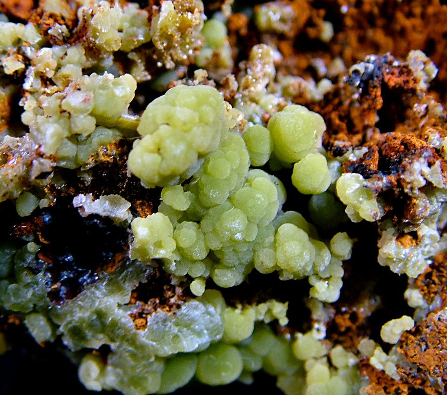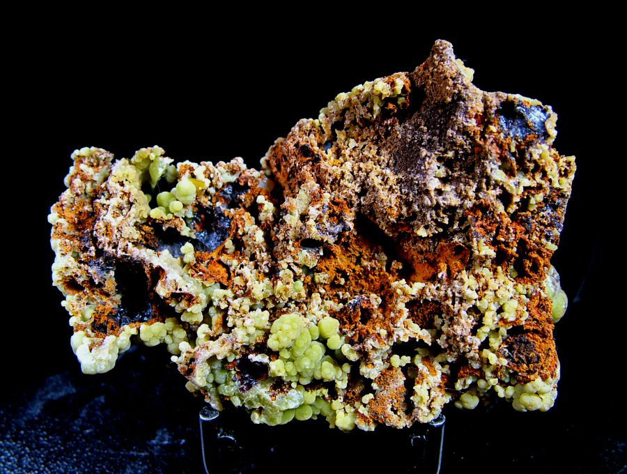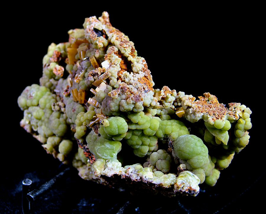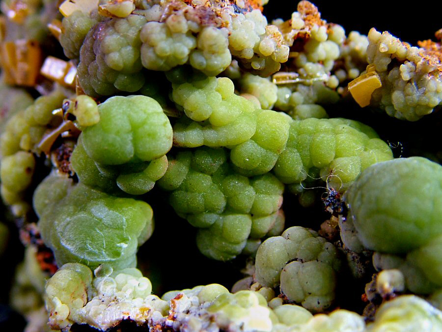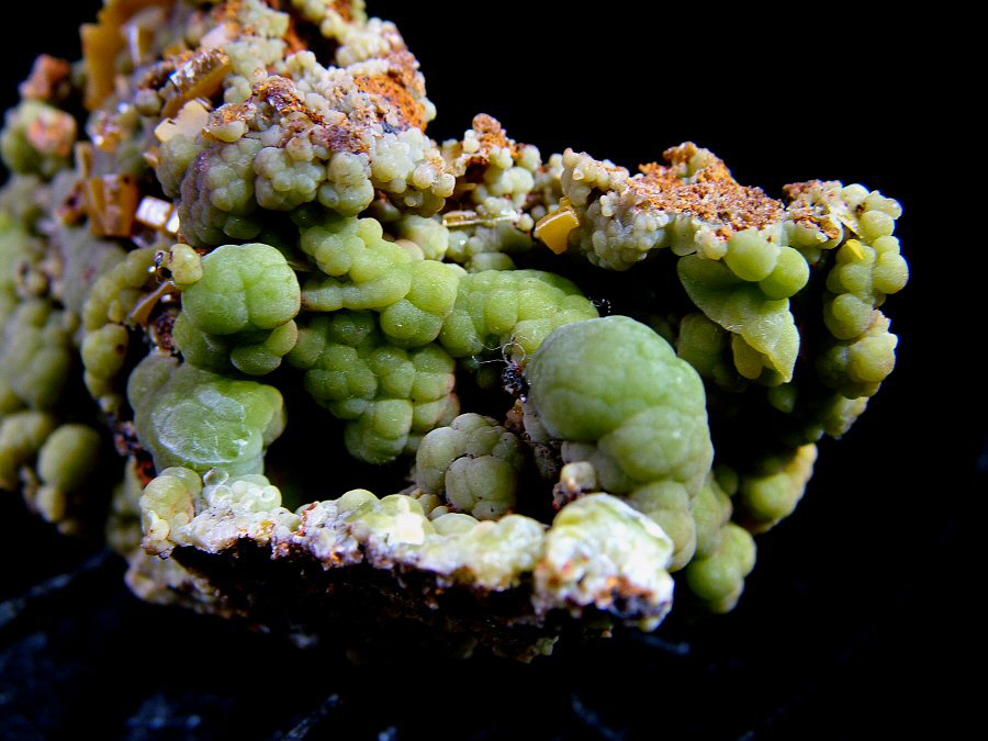 Lustrous yellow Wulfenite's crystals are scattered on a noce green colored mammellonar Mimetite, with a good chromatic contrast.
