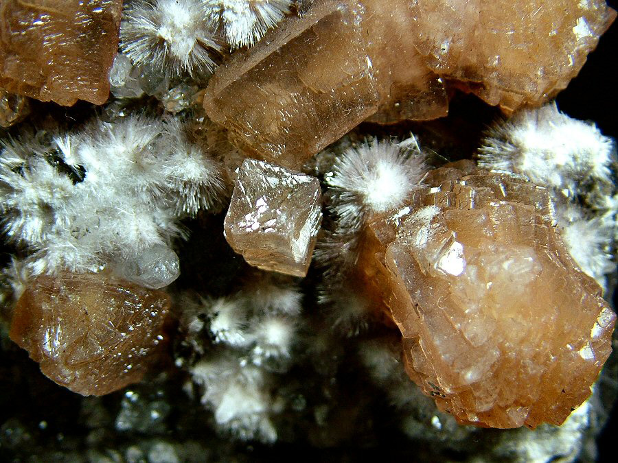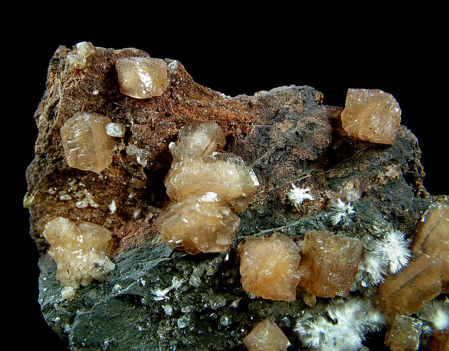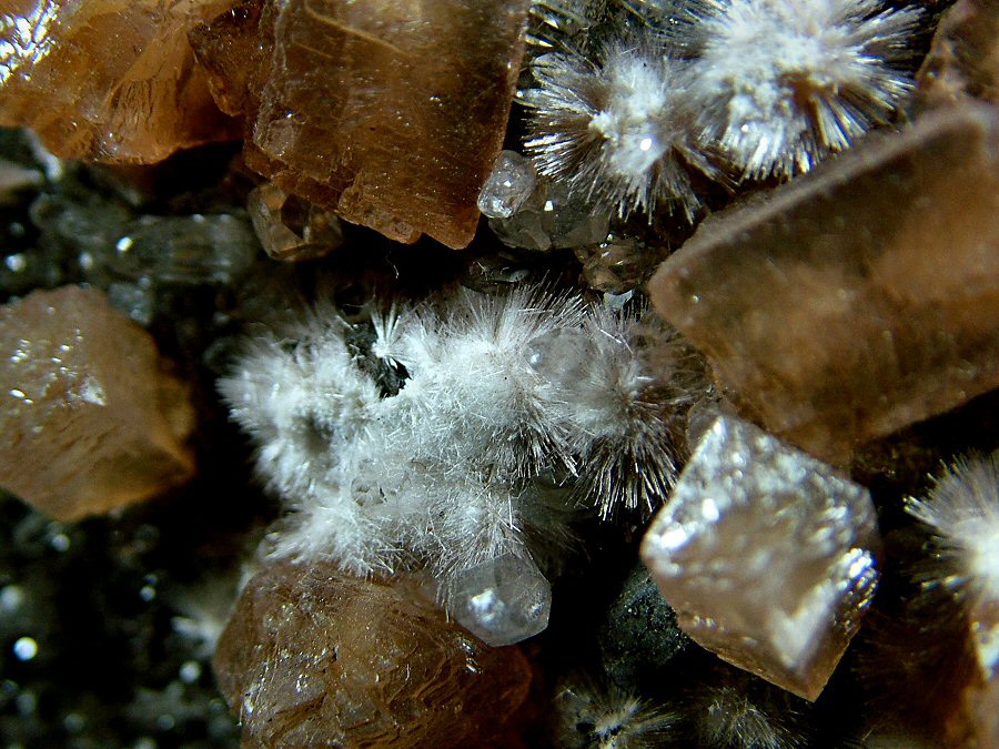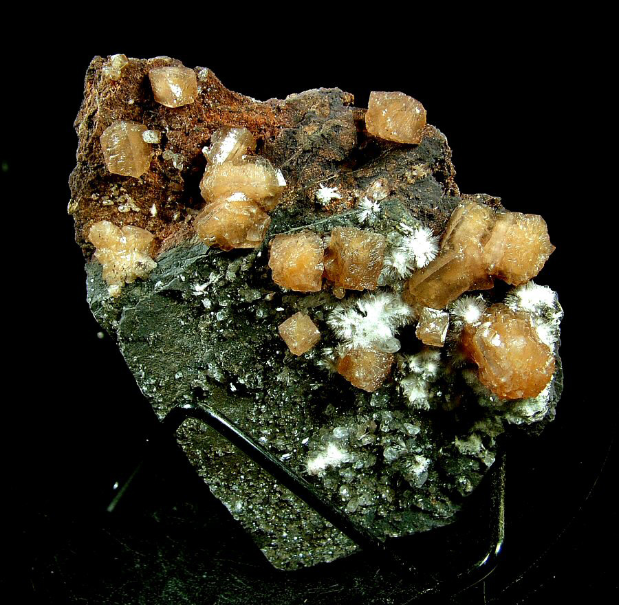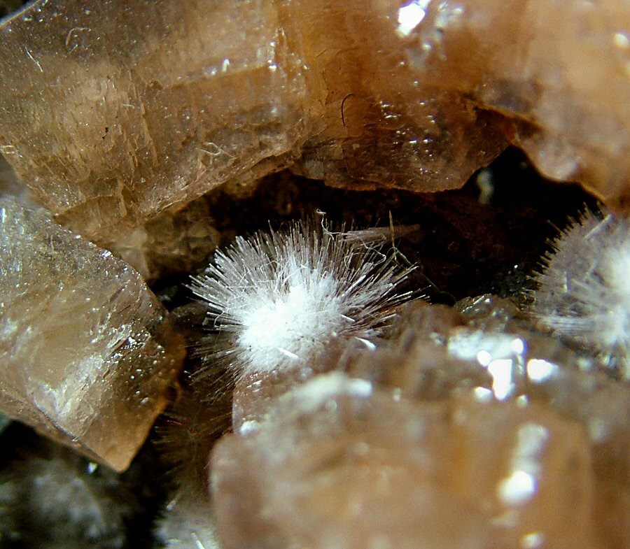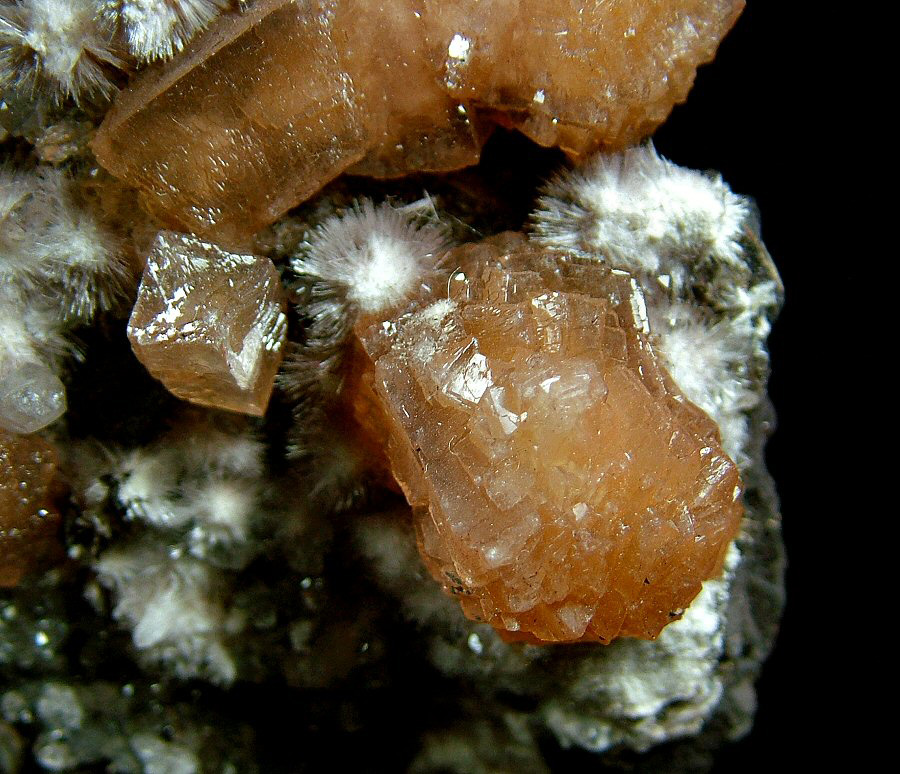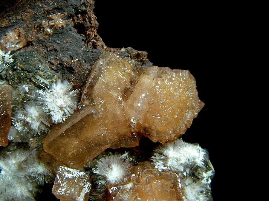Gorgeous Olmiite's crystals up to 16 mm, with a nice amber color, well formed and glossy, are accompanied by sprays of acicular, pure white Bultfonteinite's crystals, with a nice aesthetic effect. Very aesthetic sample.
