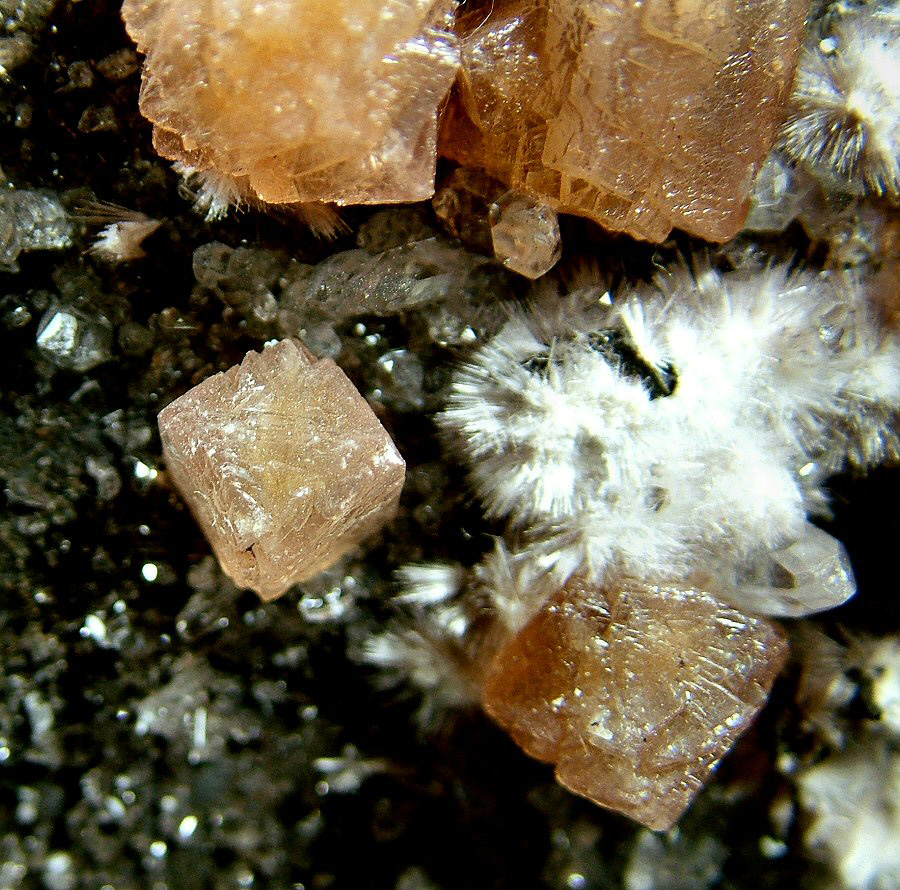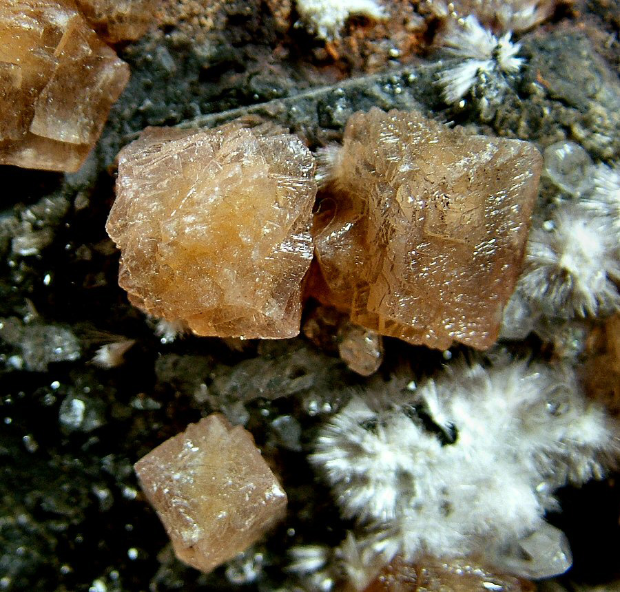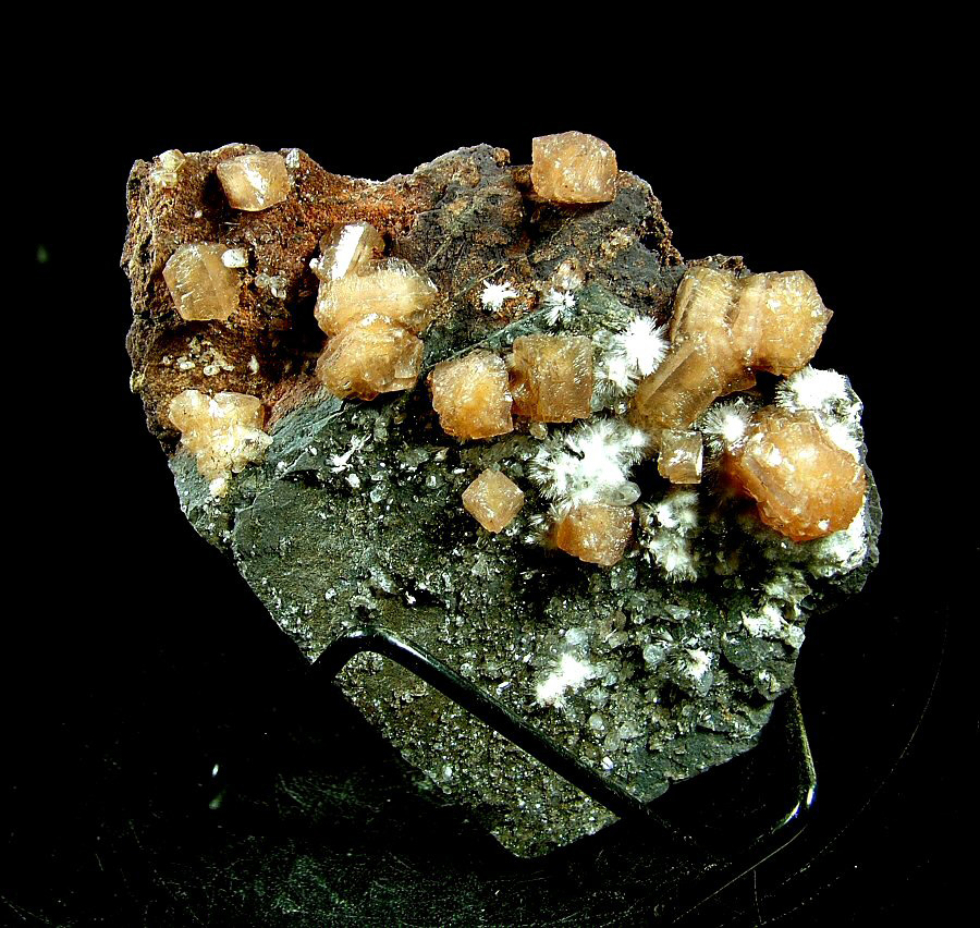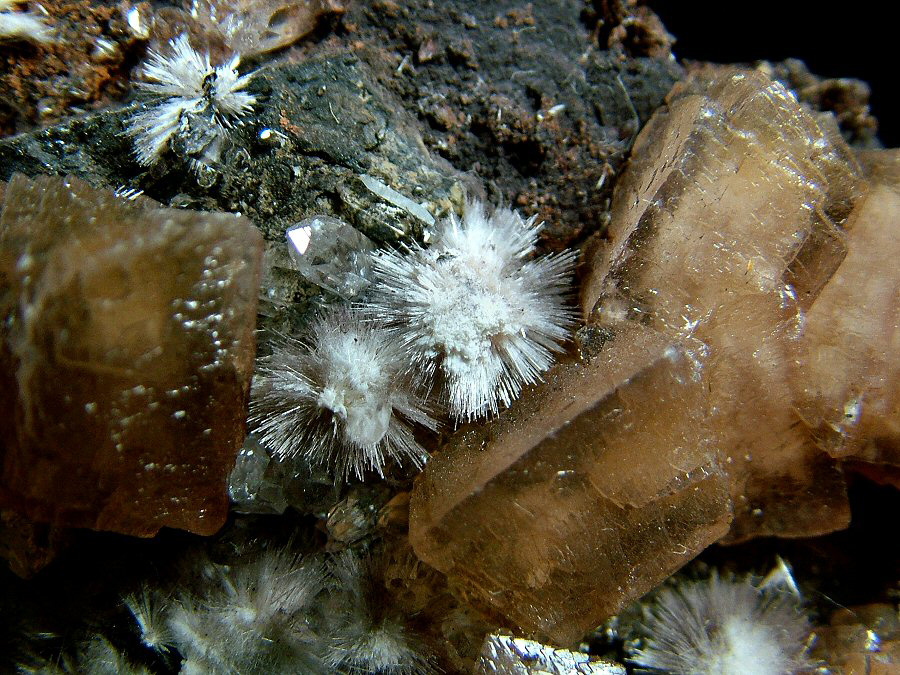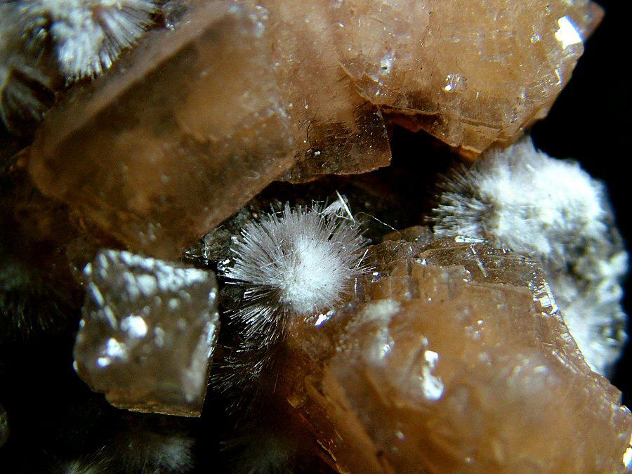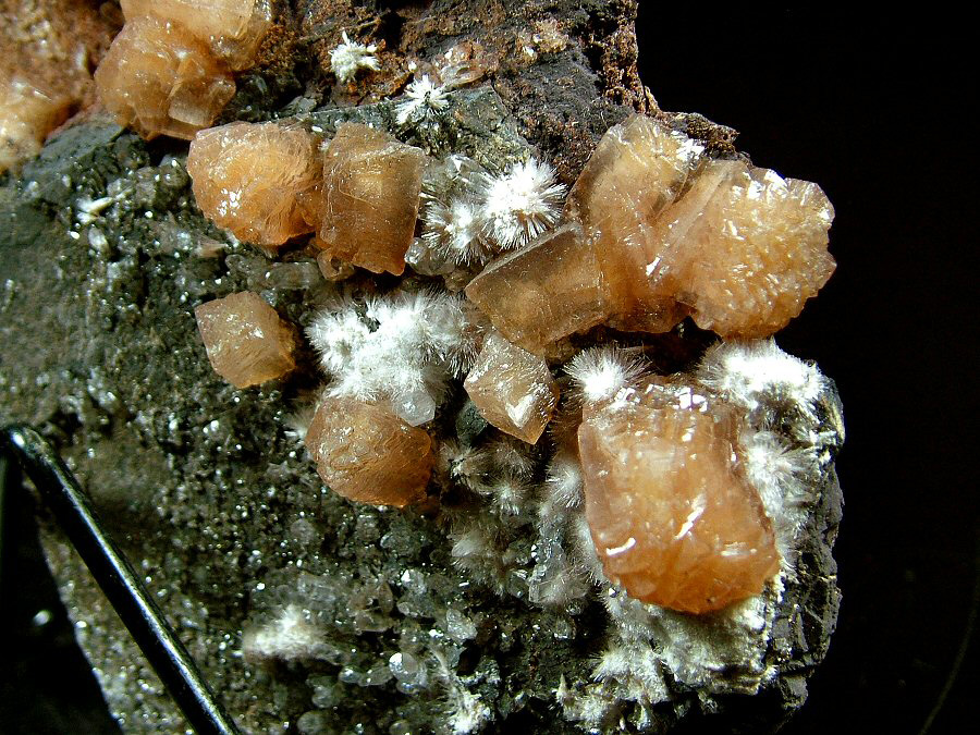 Gorgeous Olmiite's crystals up to 16 mm, with a nice amber color, well formed and glossy, are accompanied by sprays of acicular, pure white Bultfonteinite's crystals, with a nice aesthetic effect. Very aesthetic sample.