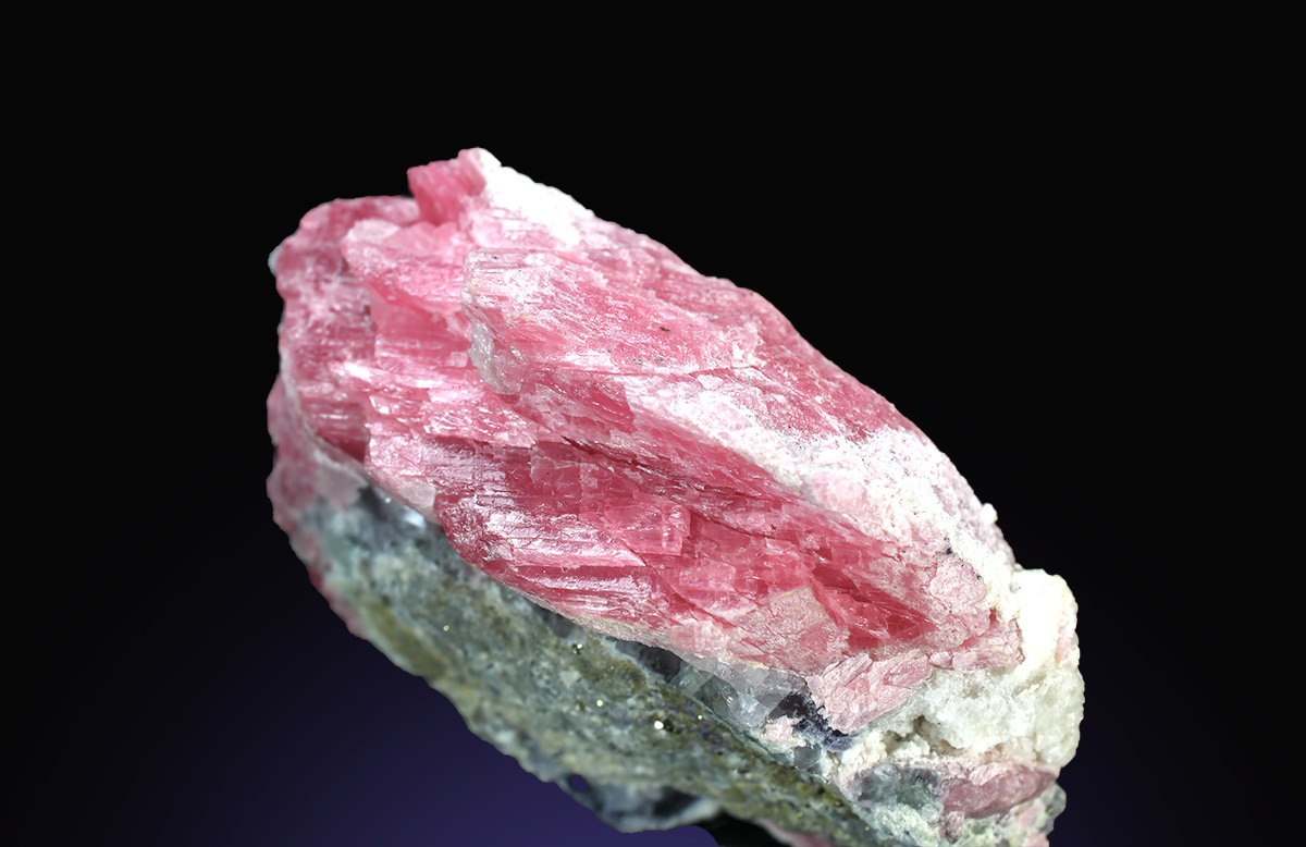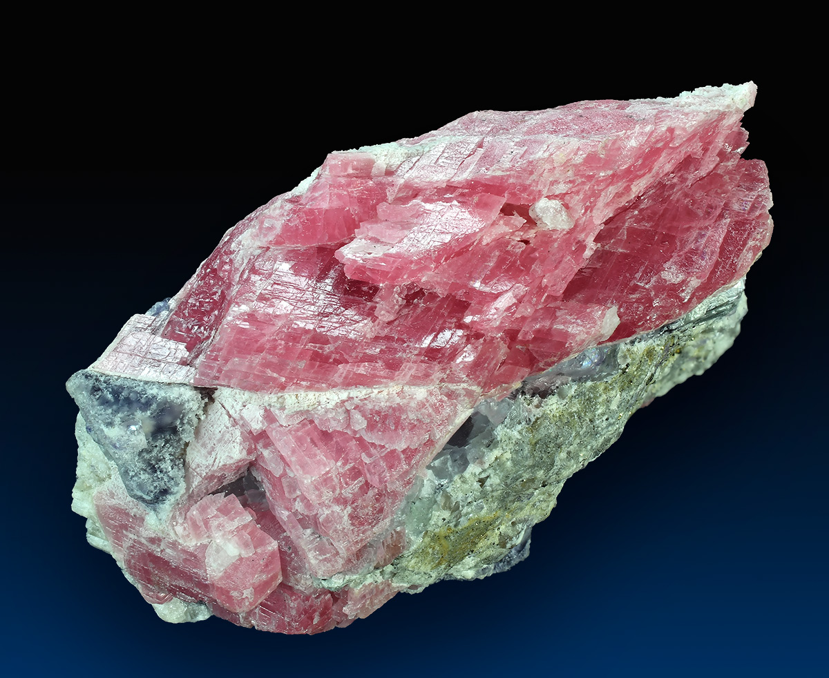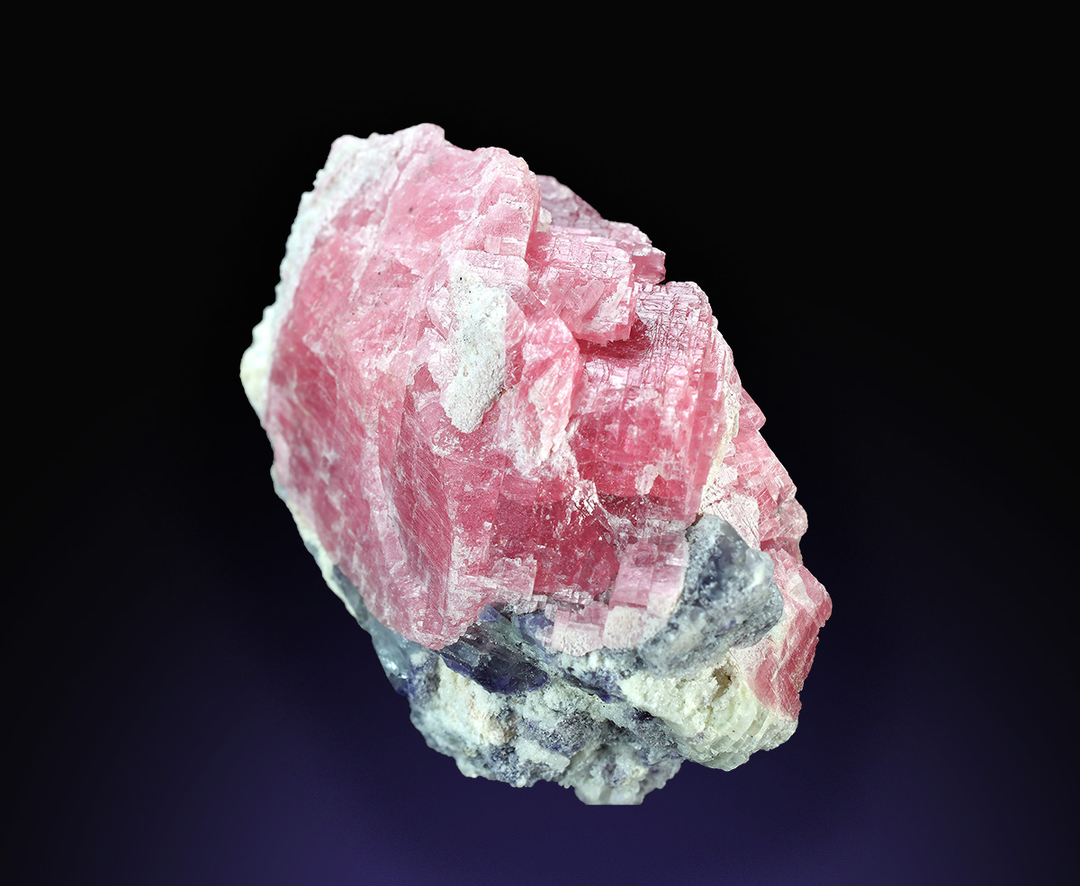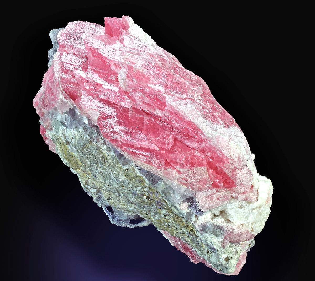 Intense red-pink Rhodocrhrosite crystals up to 3,0 cm on matrix with pale blue fluorite and pyryte in association.