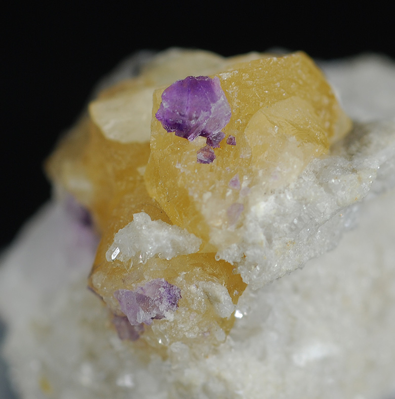 Three specimens from this famous alpine italian mine: - a cube of violet fluorite with internal 'ghost' (mm. 30 x 27 x 23) - orange calcite over quartz, with some little violet cubes of fluorite over it (mm. 27 x 18 x 26) - hyalin quartzes (mm. 45 x 36 x 32)