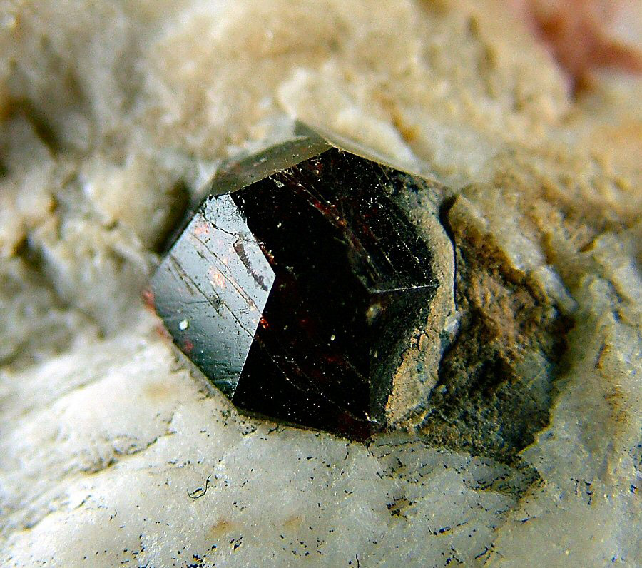 Wonderful icositetrahedric 8 mm Almandine's crystal, with a nice dark red color, well formed and shiny, on a pegmatitic matrix.