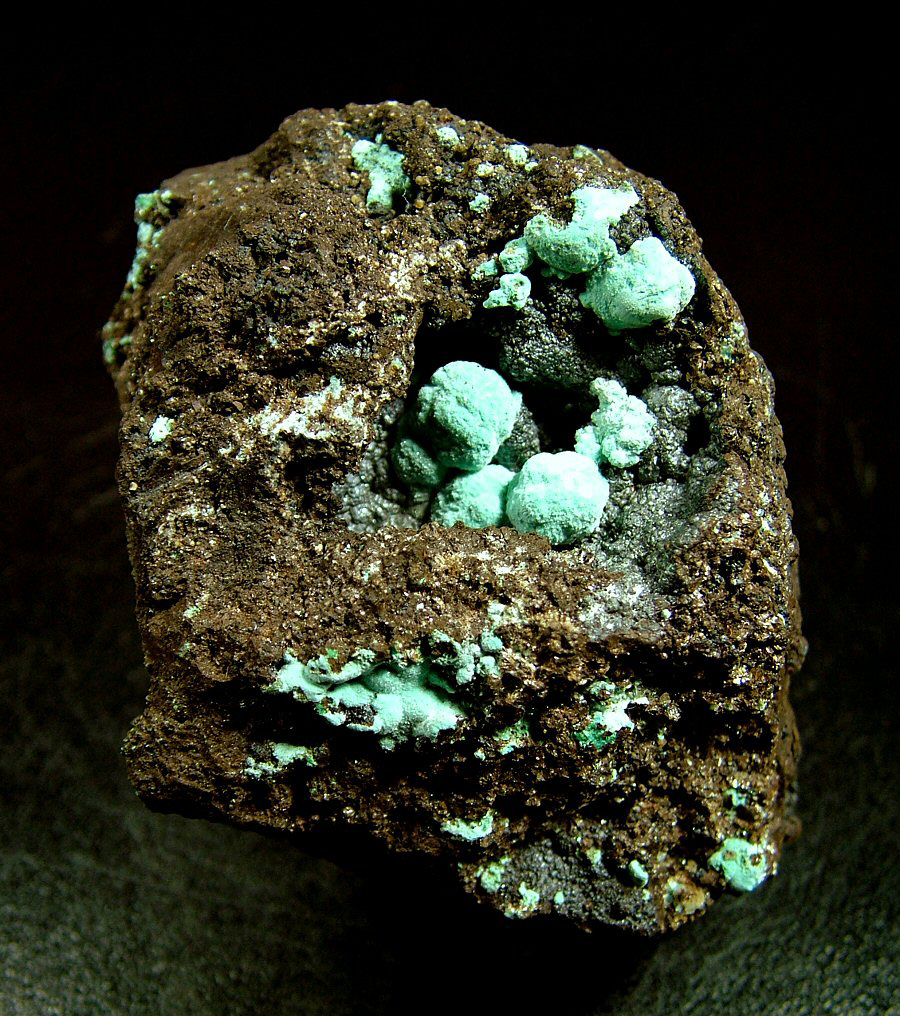 Nice Rosasite's spheres up to 10 mm, made up of countless needle-like crystals, with a pleasant turquoise-green color, cover the main geode of the sample and are present also on the rear of the sample, even if smaller. Nice the chromatic contrast with the matrix. Aesthetic sample.