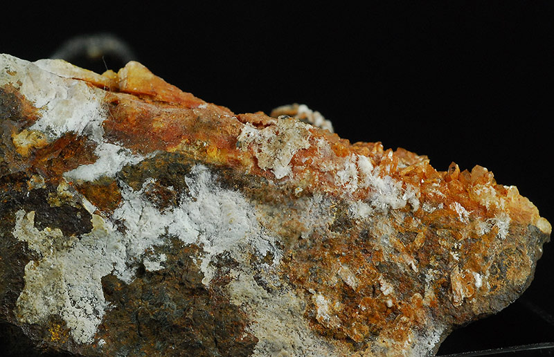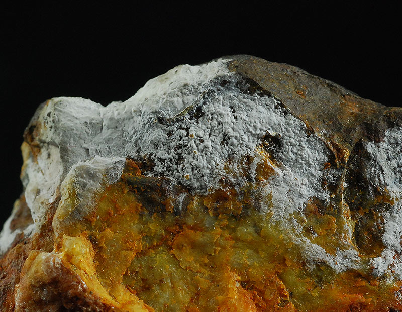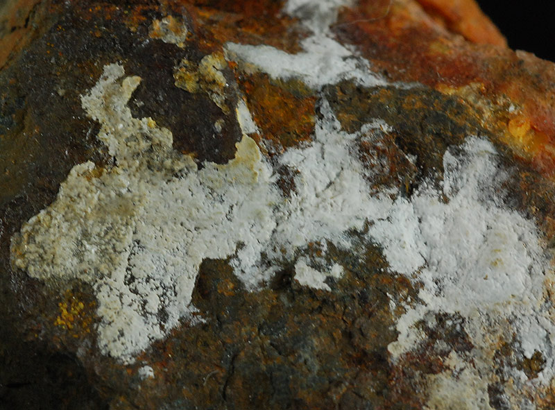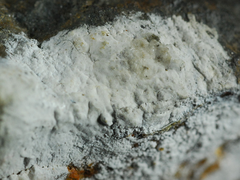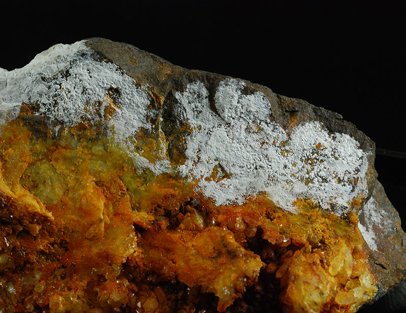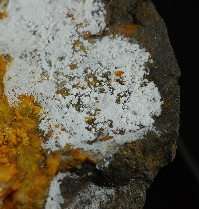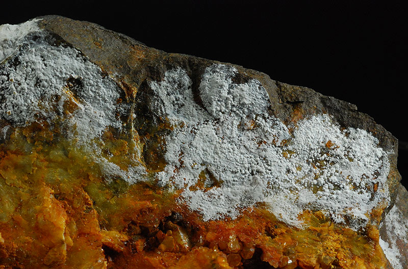This specimen is partially covered by a white patina of rapidcreekite. In an area there are some minicurls of this rare sulfate.