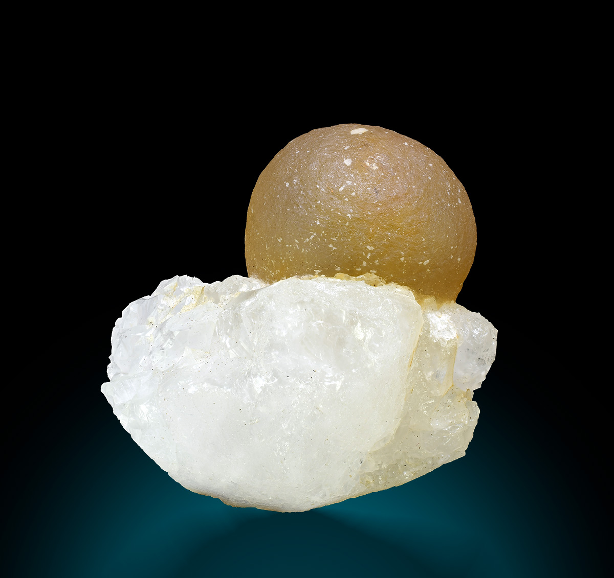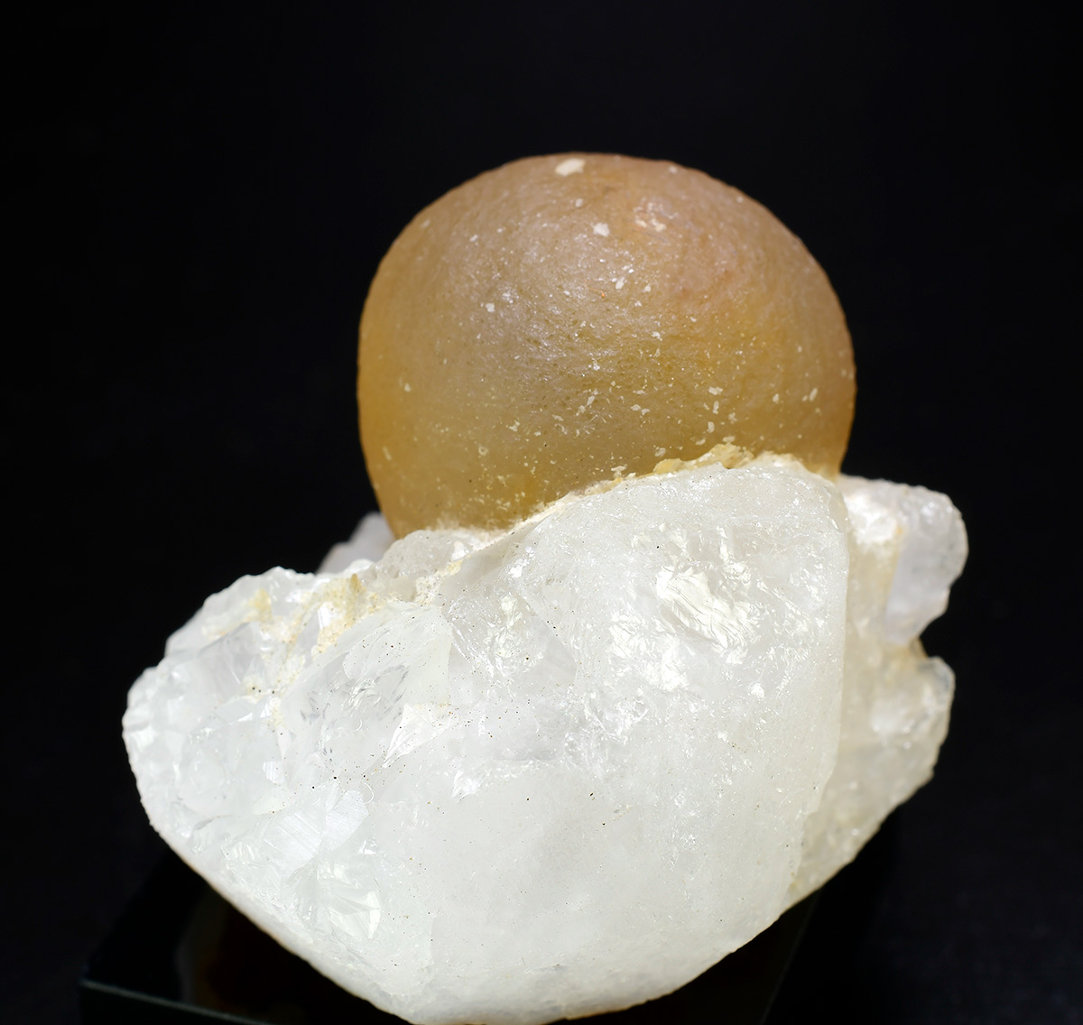 Translucent, yellow fluorite ball 2,2 cm wide aesthetically set on crust of sparkly quartz crystals.