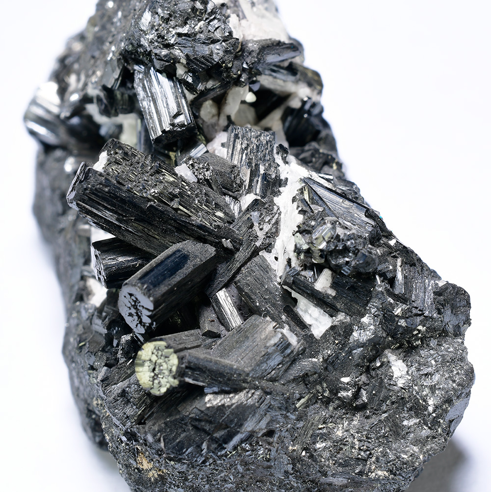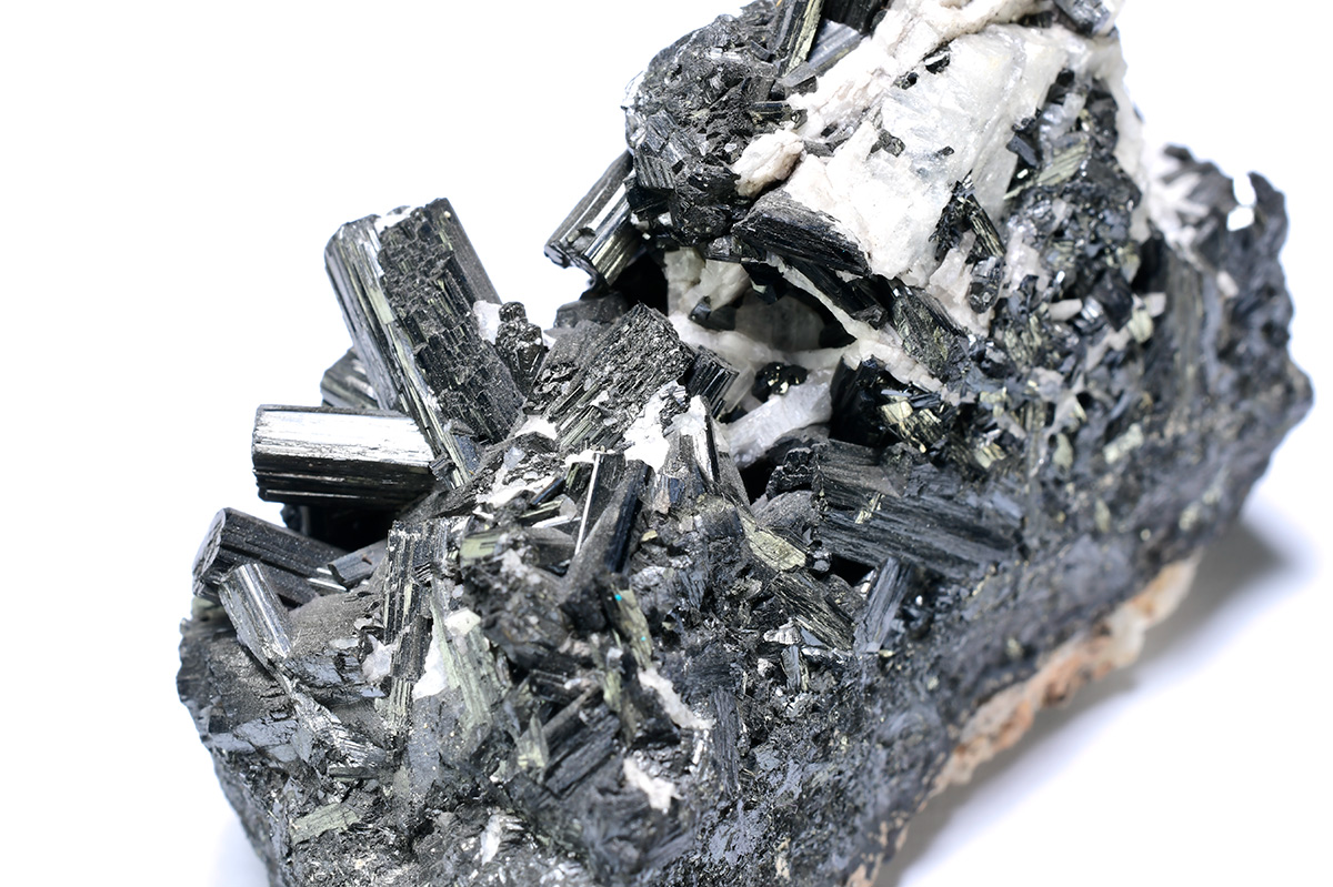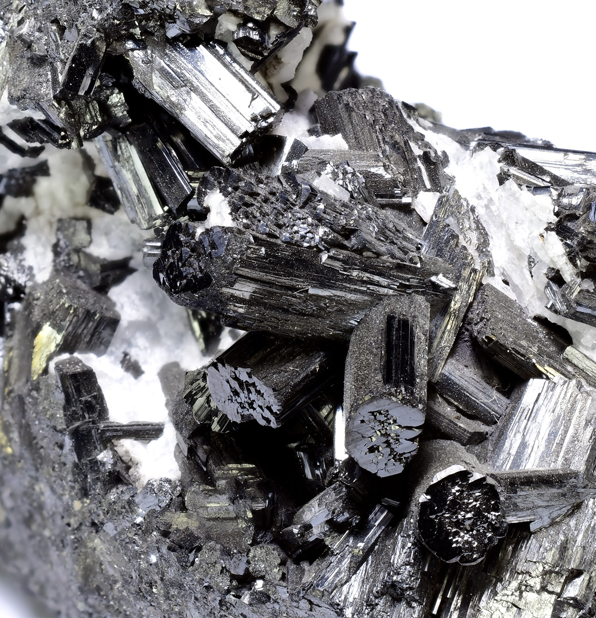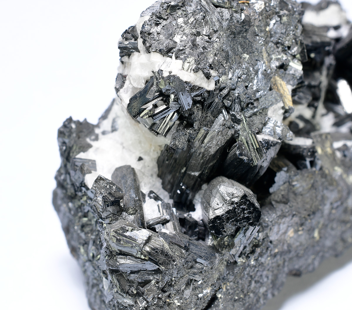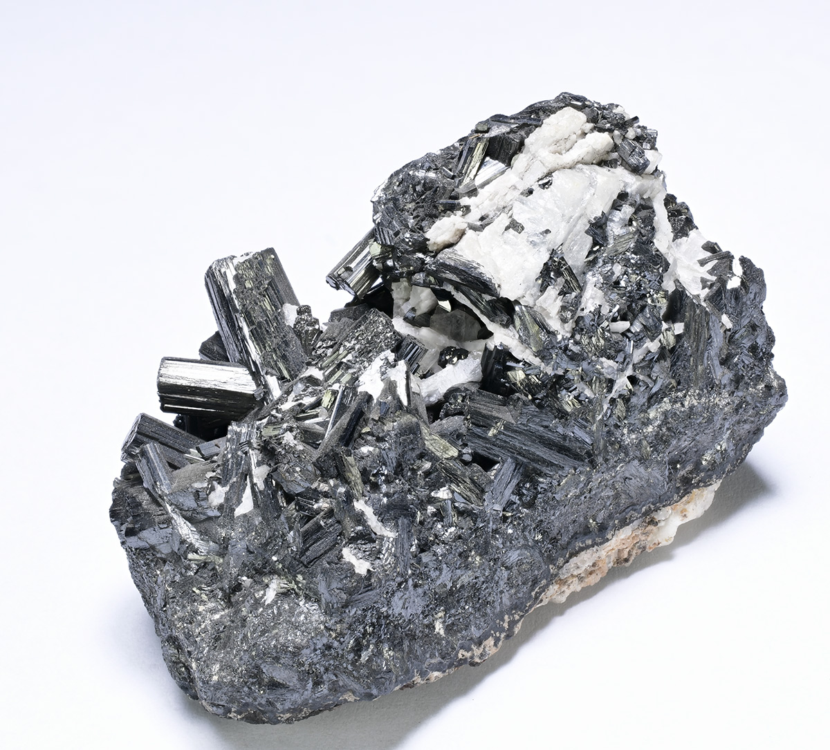 Here we see sharp and lustrous crystals of steel gray Manganite xls up to 1,2 cm contrast starkly to the white Baryte association. A nice specimen with well developed and sharp edged crystals. They are excellent striated as well, mostly superbly terminated.This is old time stuff from the important find in the mid of the 1880s..