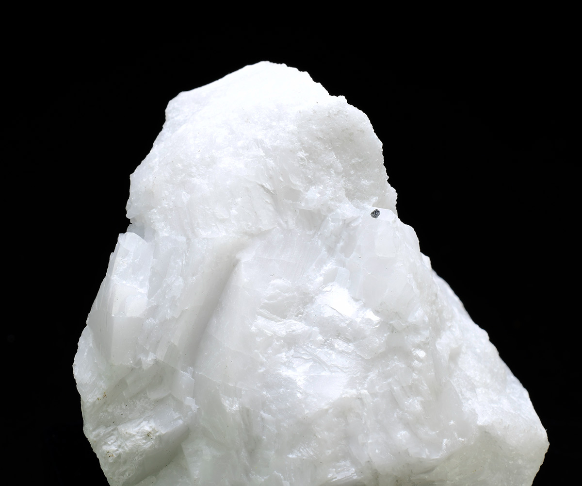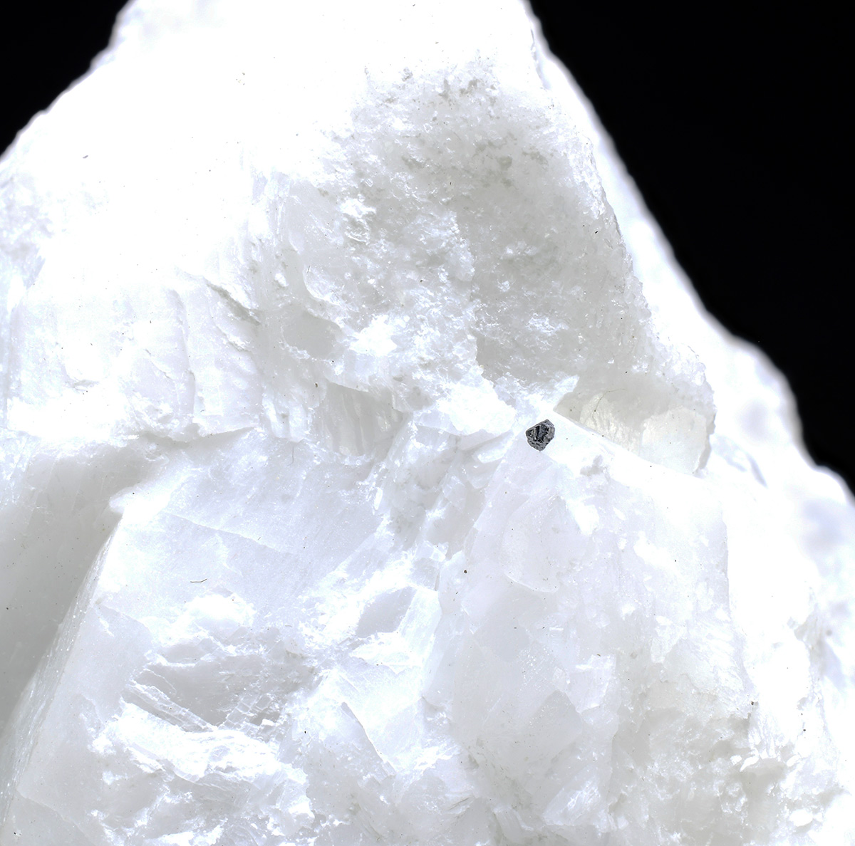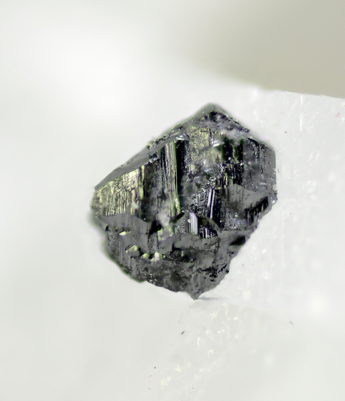 Stout dipyramidal crystal of gray metallic geocronite, up to 0.5 mm in length on marble matrix.