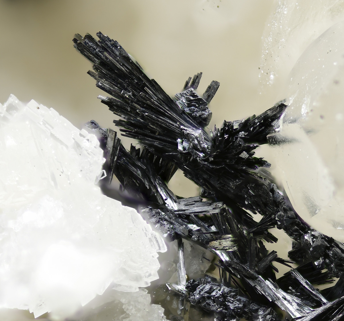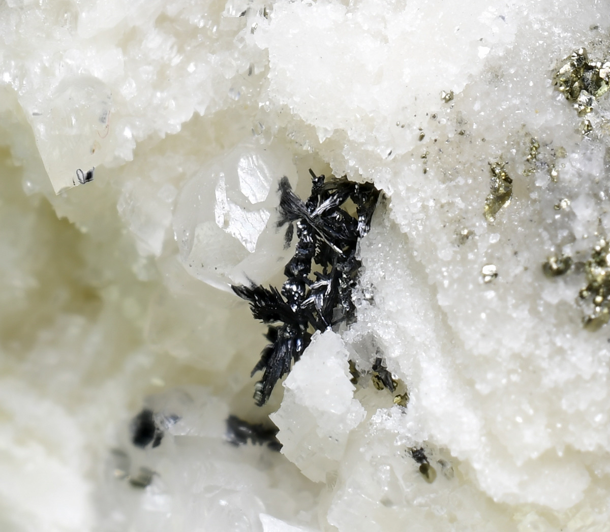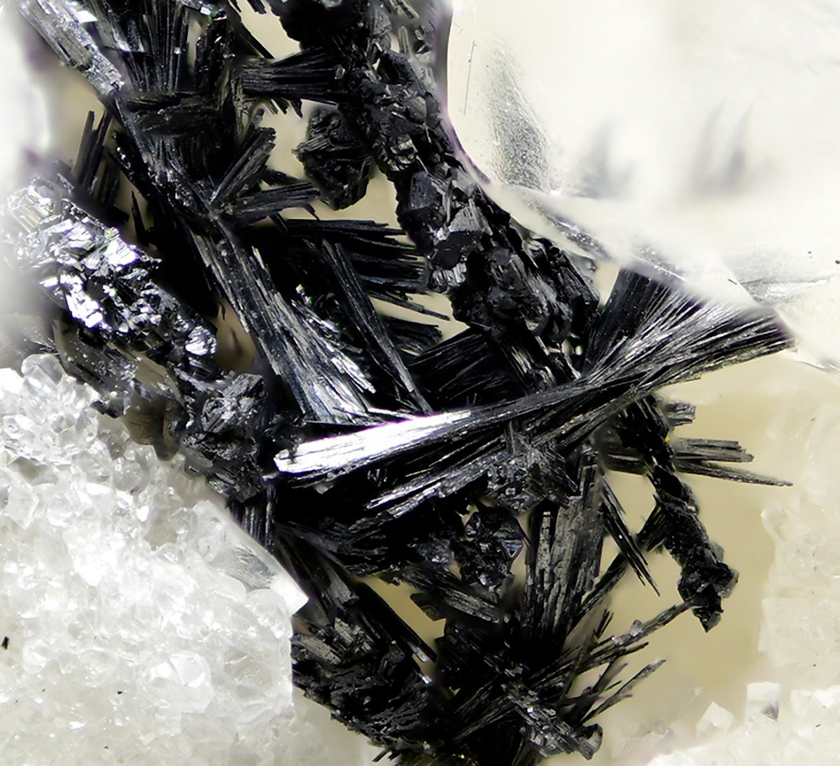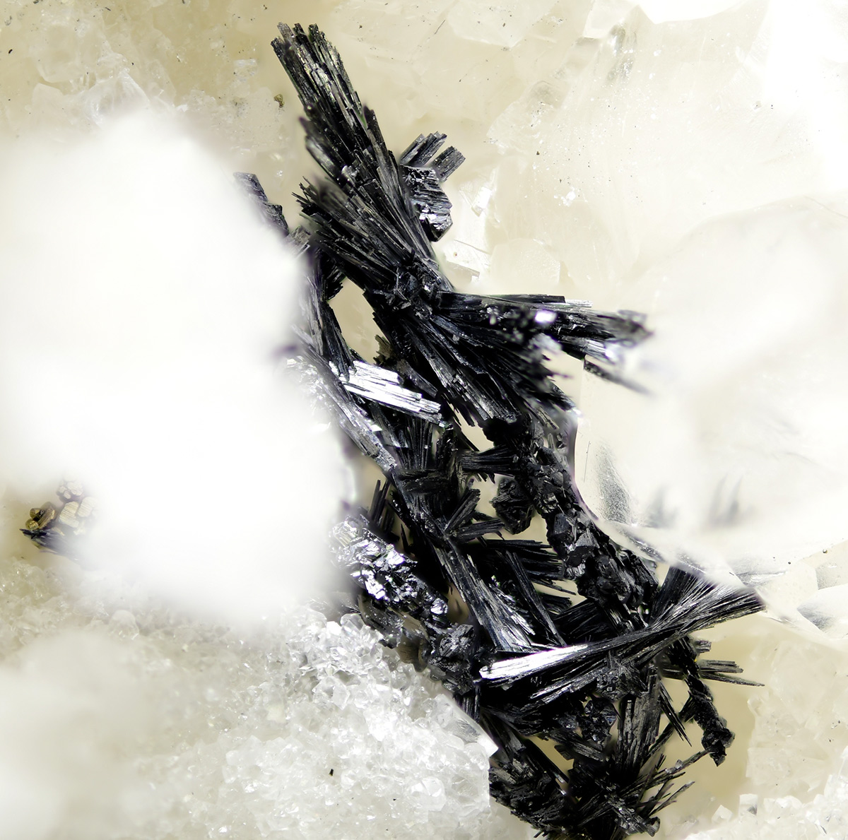 Metallic, steel-gray very rare Lengenbachite xls in needles up to 0.8 mm in a vug of white contrasting dolomia matrix from the famous Swiss and type locality. Regional Museum Binn n. L-23815.