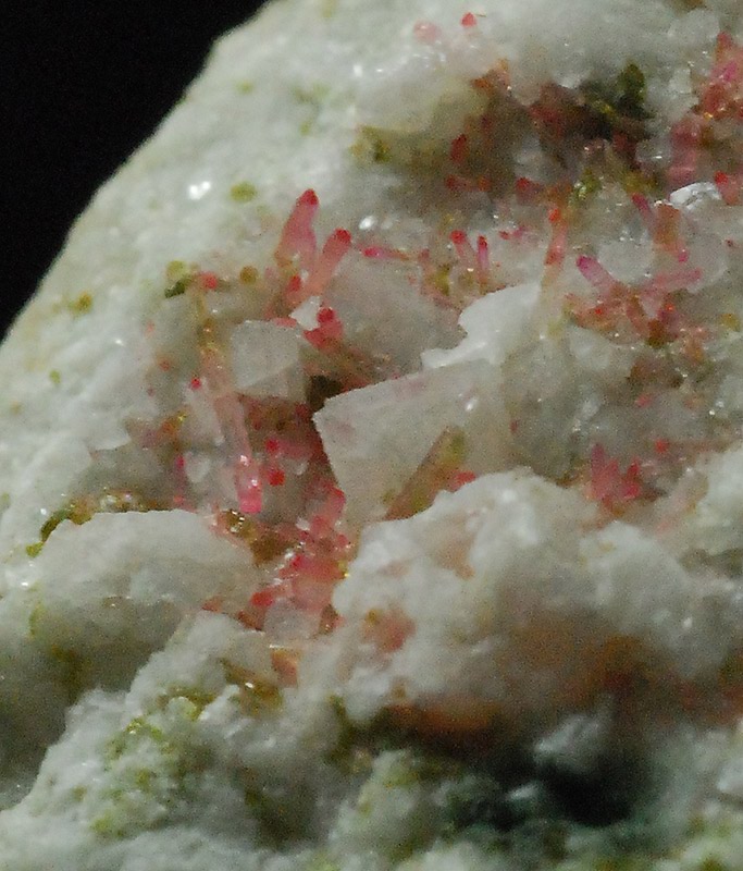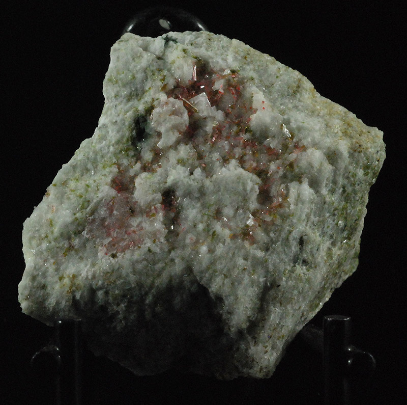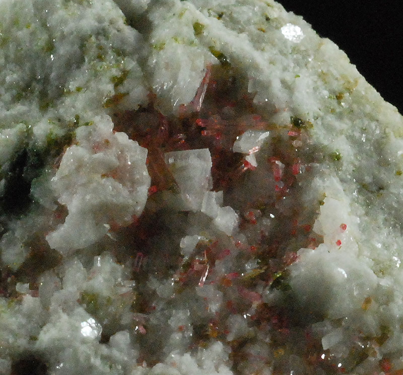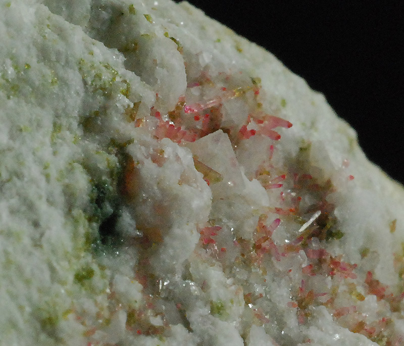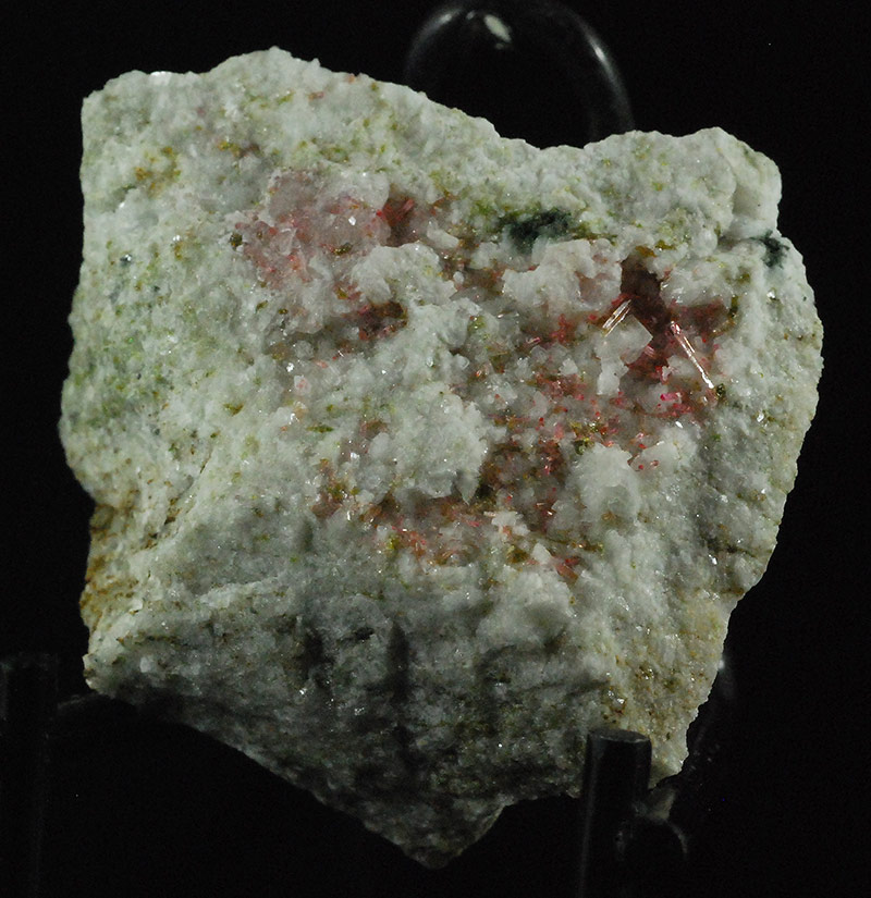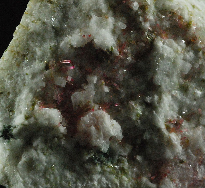 A lovely miniature dotted with small elongated crystals of piemontite: they are transparent and have a pinkish color with a red head. The dark green crystals are of zoisite: the latter is present here and there in the matrix also in massive form. Former mineralogical collection of Sandro Maggia: no. P-124.