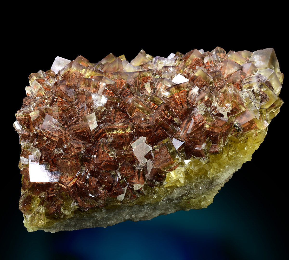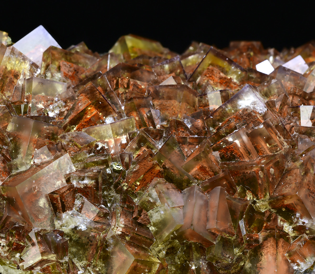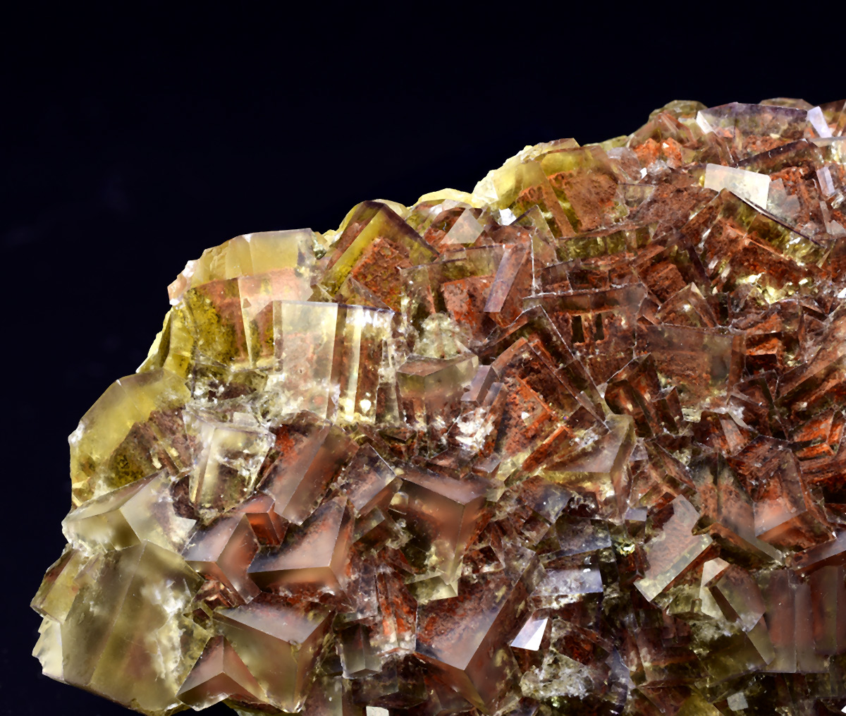 Cluster of glassy, transparent to translucent Fluorite xls up to 8 mm with color changig to green to golden brown with internal iron oxide inclusions. A classic specimen from the Marienschacht Mine in Bavaria which operated from the early 1900s until the late 1970s.