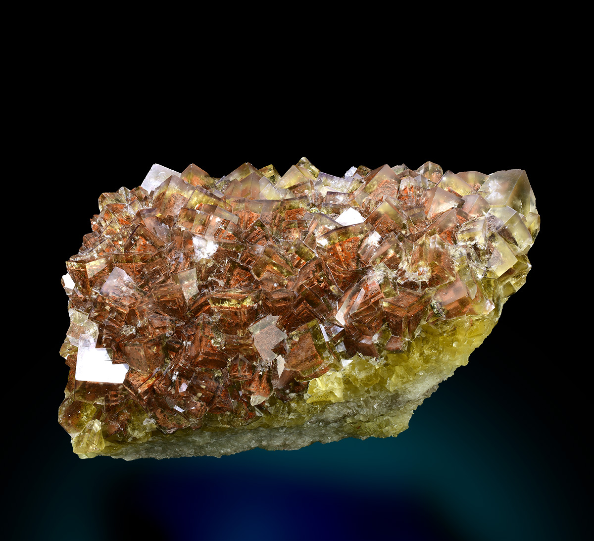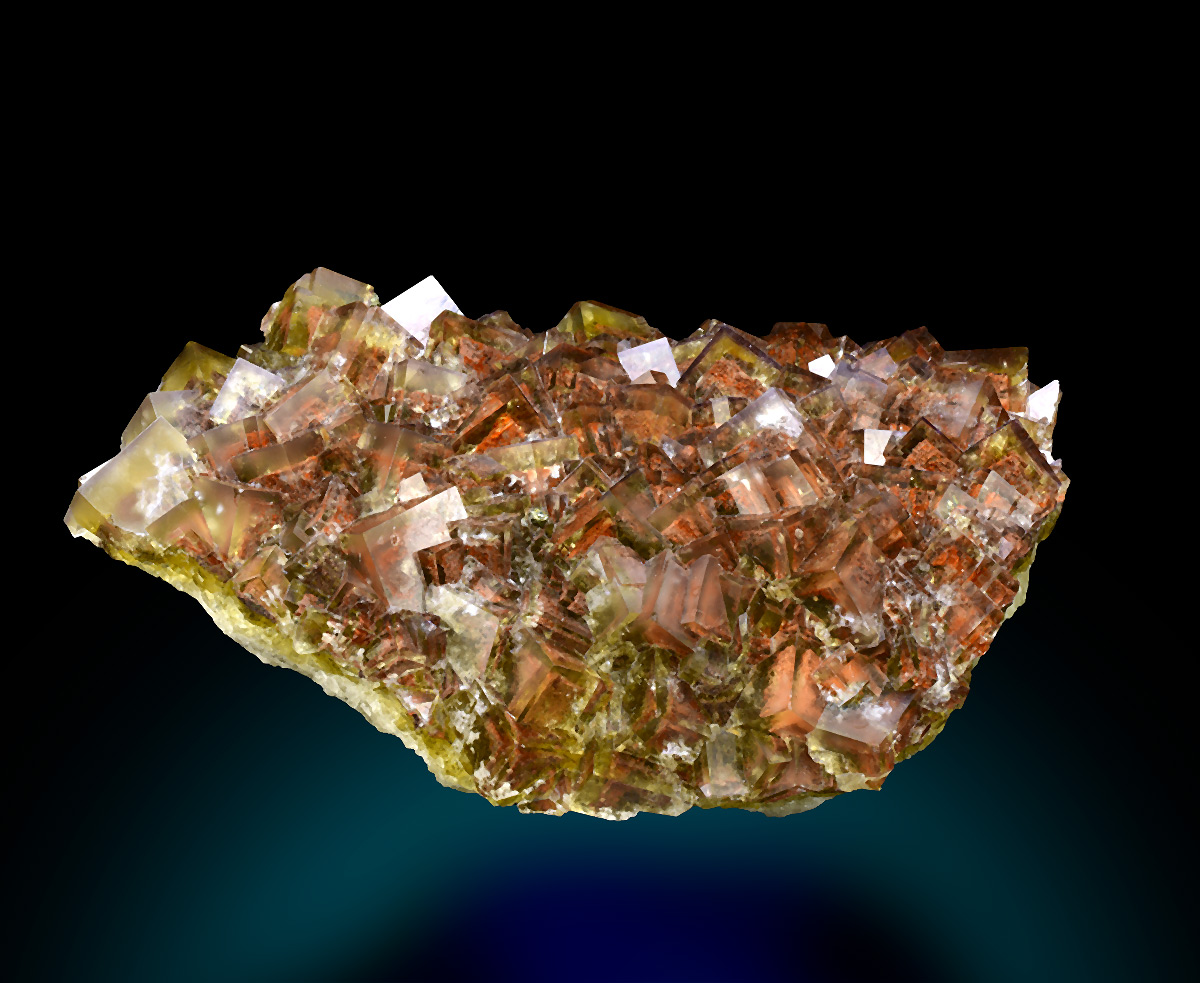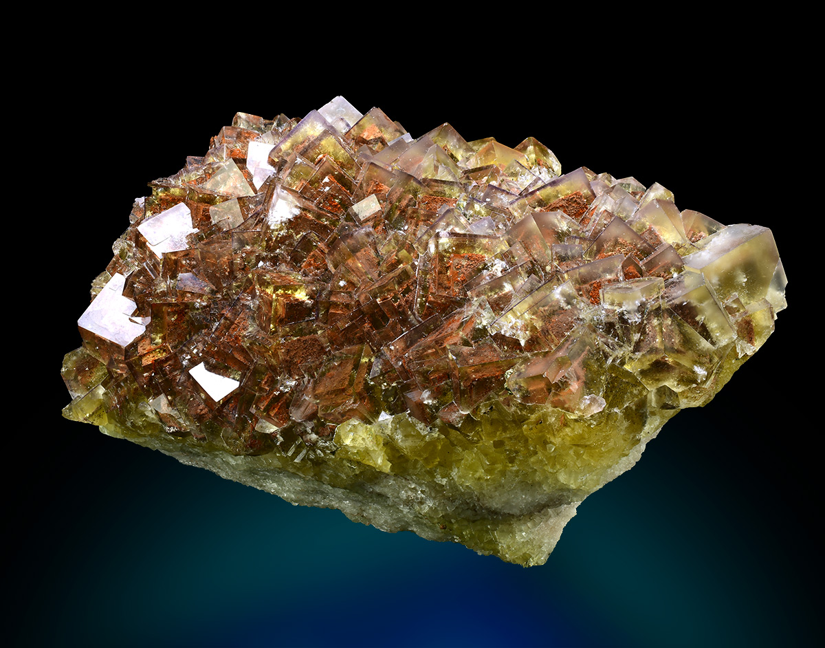 Cluster of glassy, transparent to translucent Fluorite xls up to 8 mm with color changig to green to golden brown with internal iron oxide inclusions. A classic specimen from the Marienschacht Mine in Bavaria which operated from the early 1900s until the late 1970s.