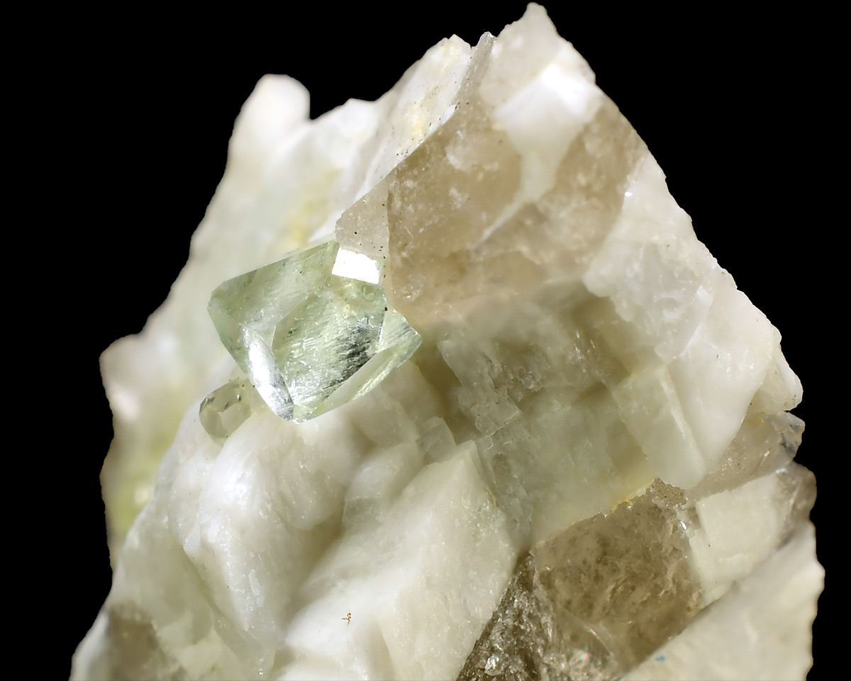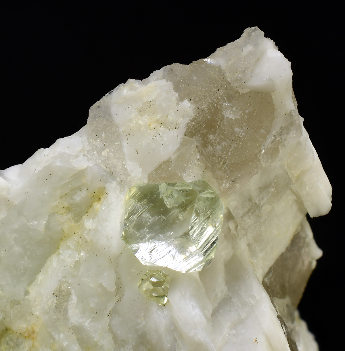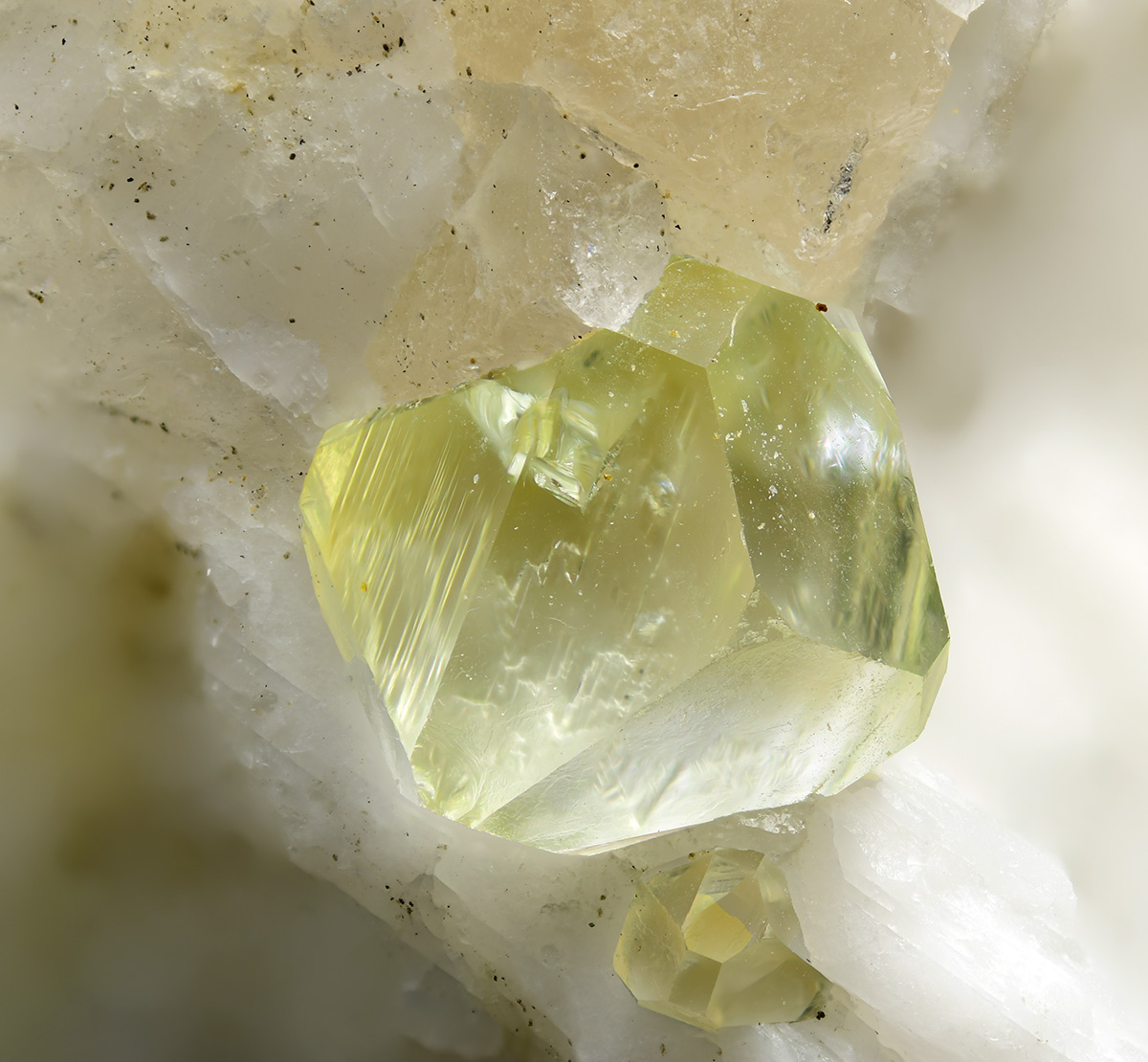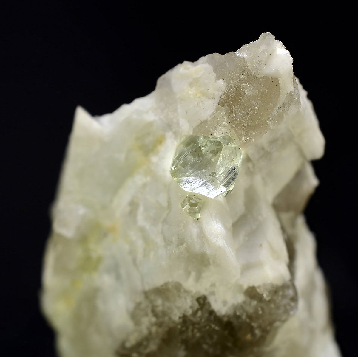 In foreground sharp, gemmy, yellow-green crystal of Rhodizite rich of Rb 3 mm wide perched on pegmatitic matrix.