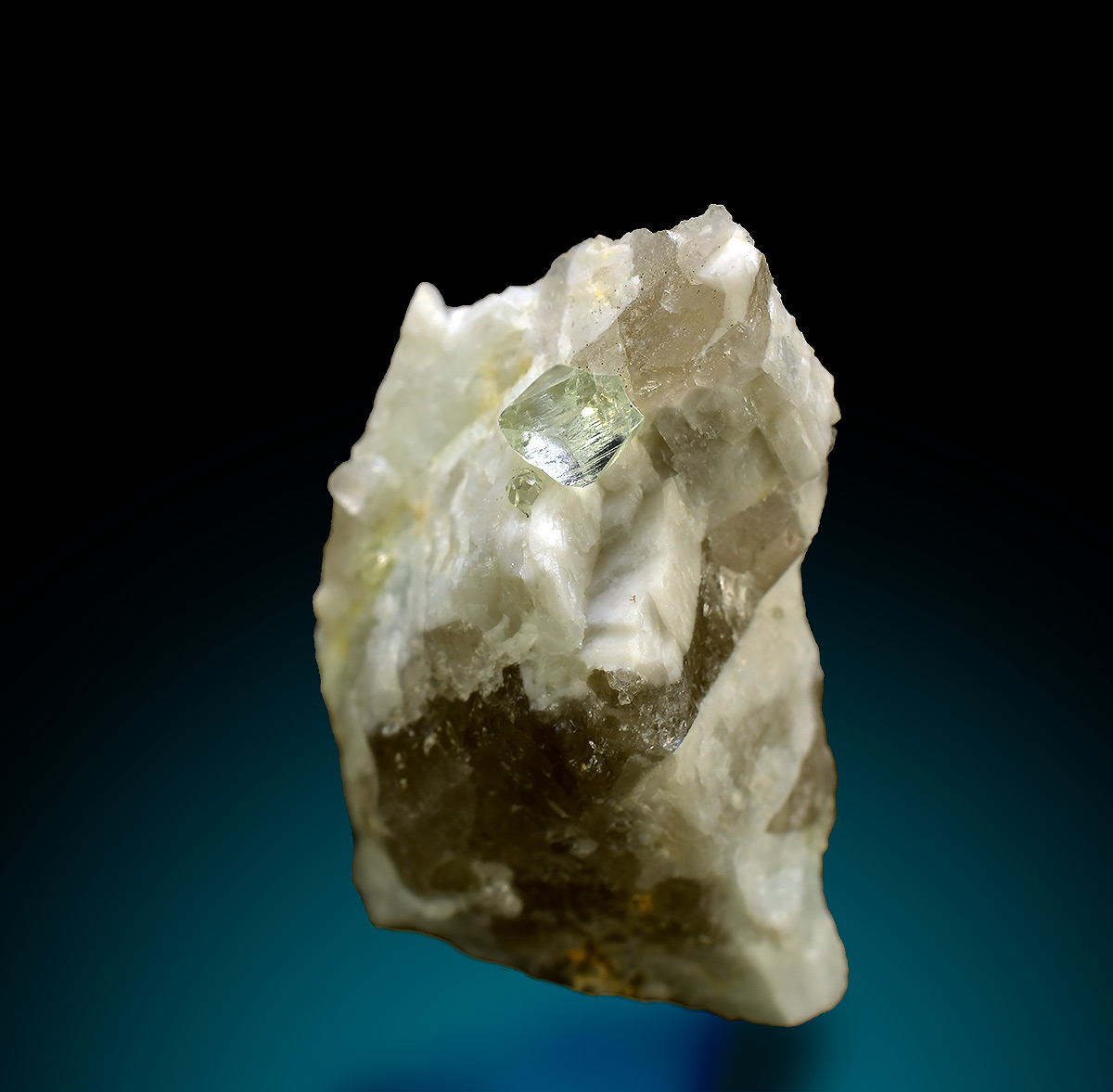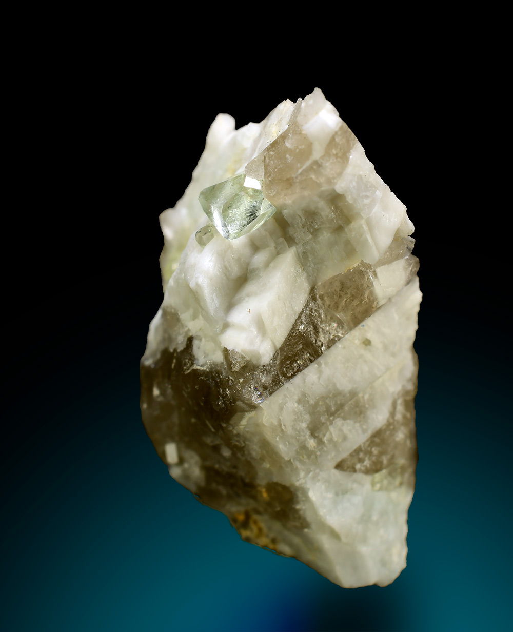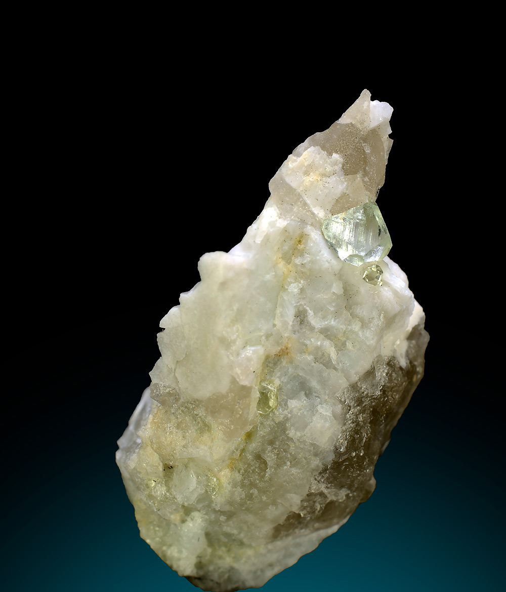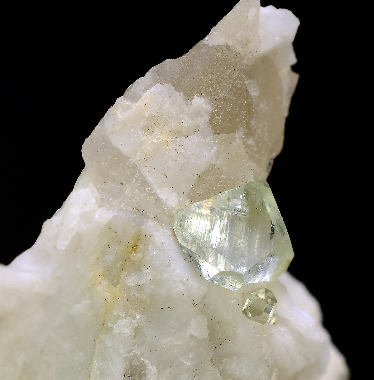 In foreground sharp, gemmy, yellow-green crystal of Rhodizite rich of Rb 3 mm wide perched on pegmatitic matrix.