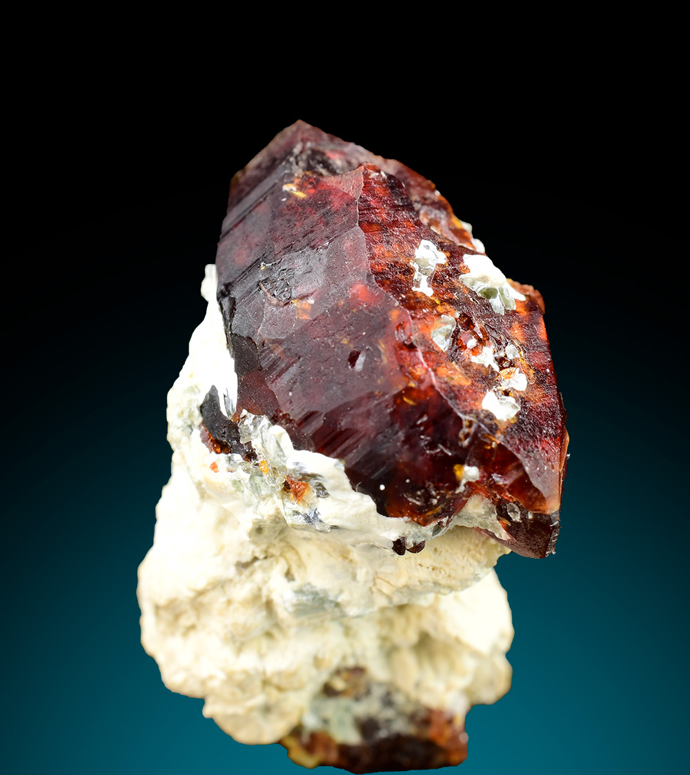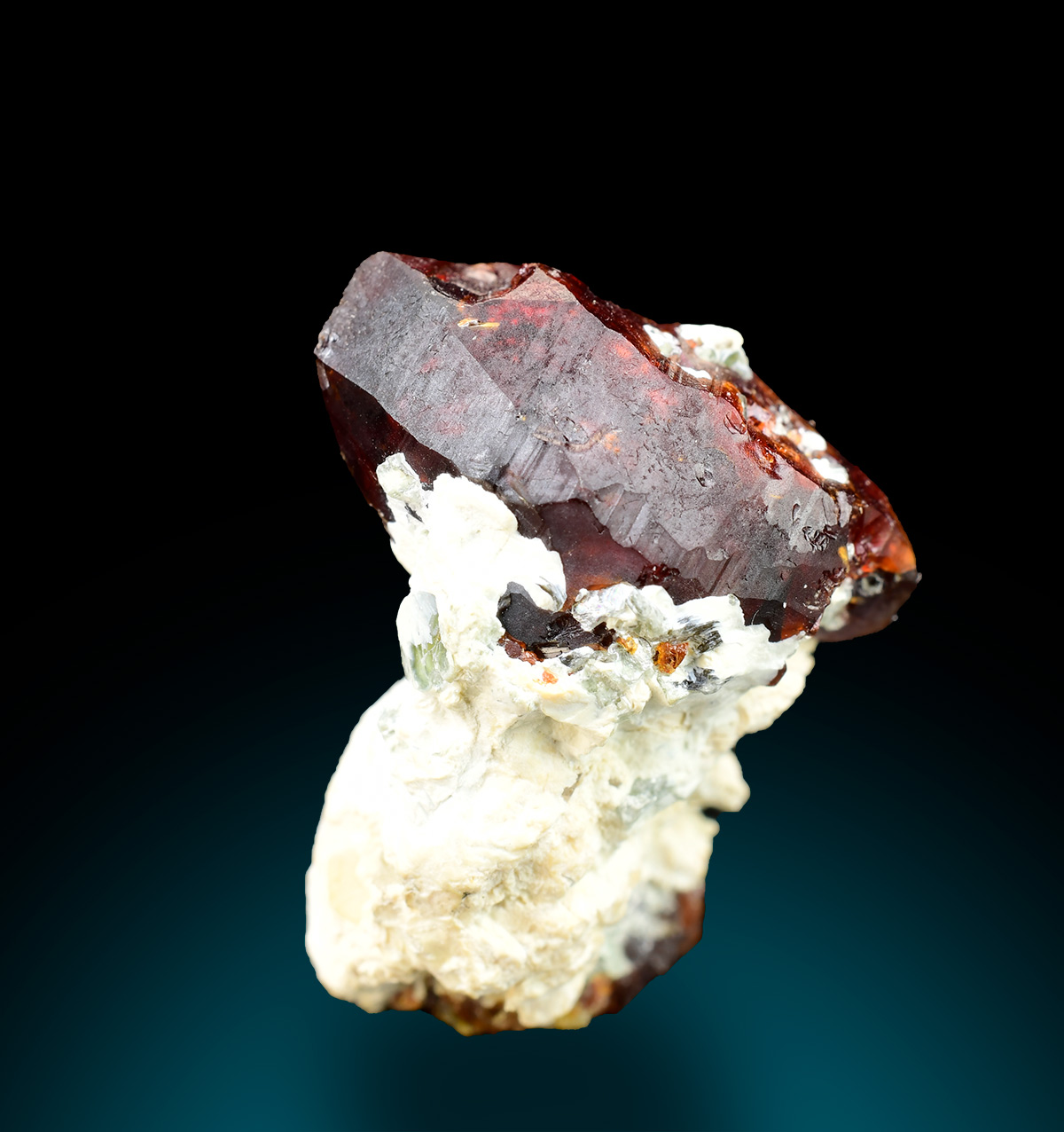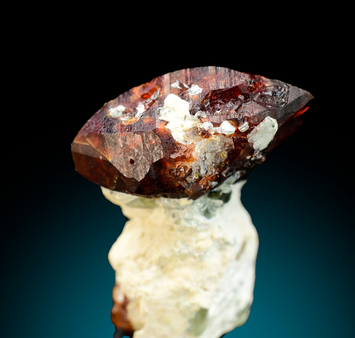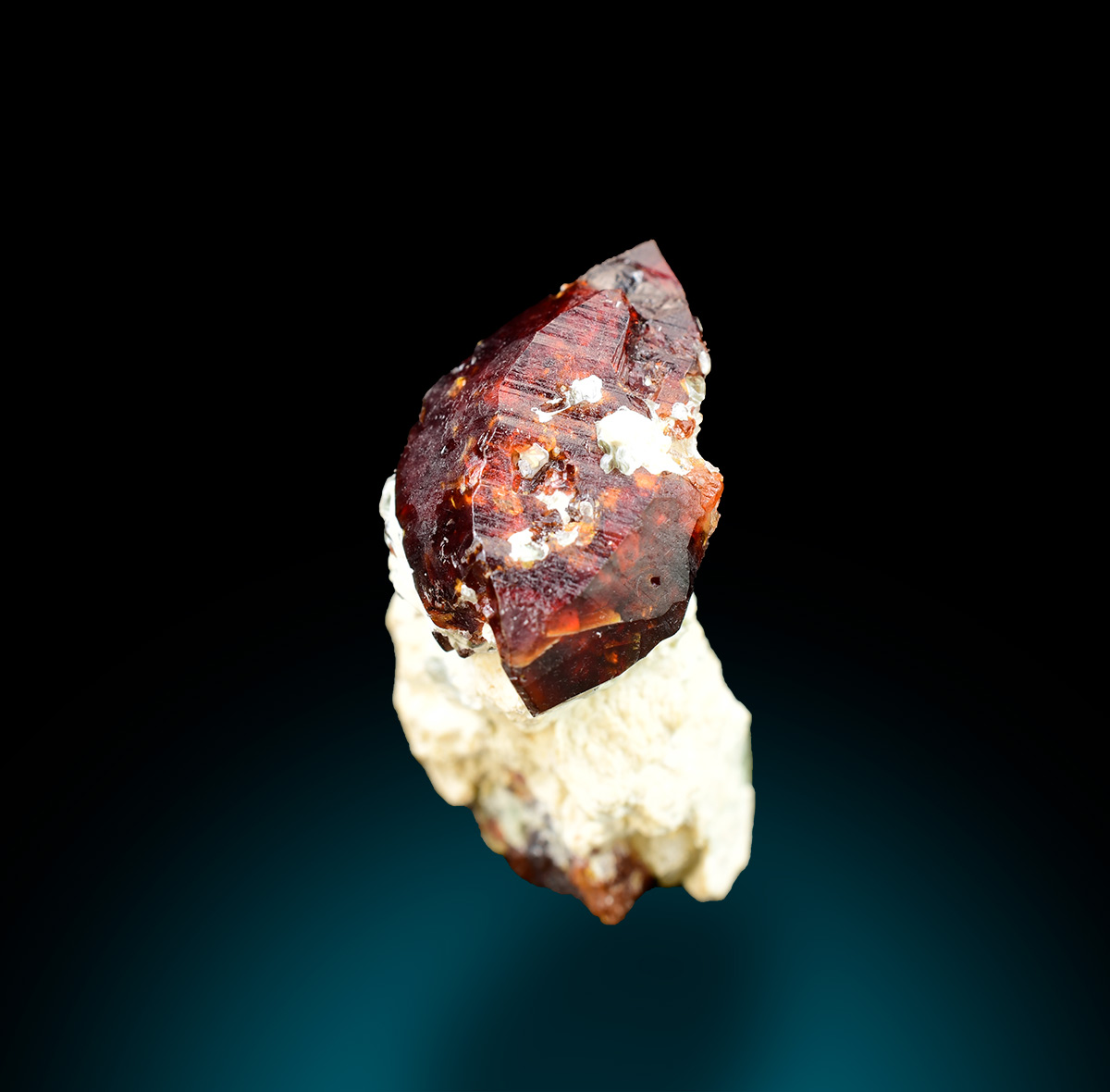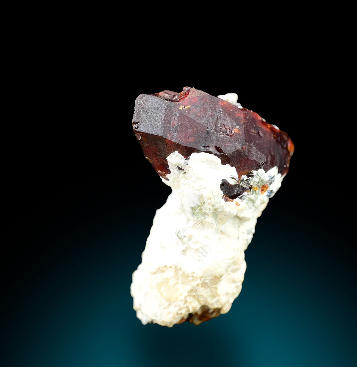 Dark red complex terminated crystal of Chondrodite 1,6 cm wide on minor matrix.