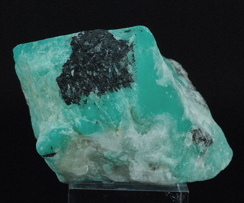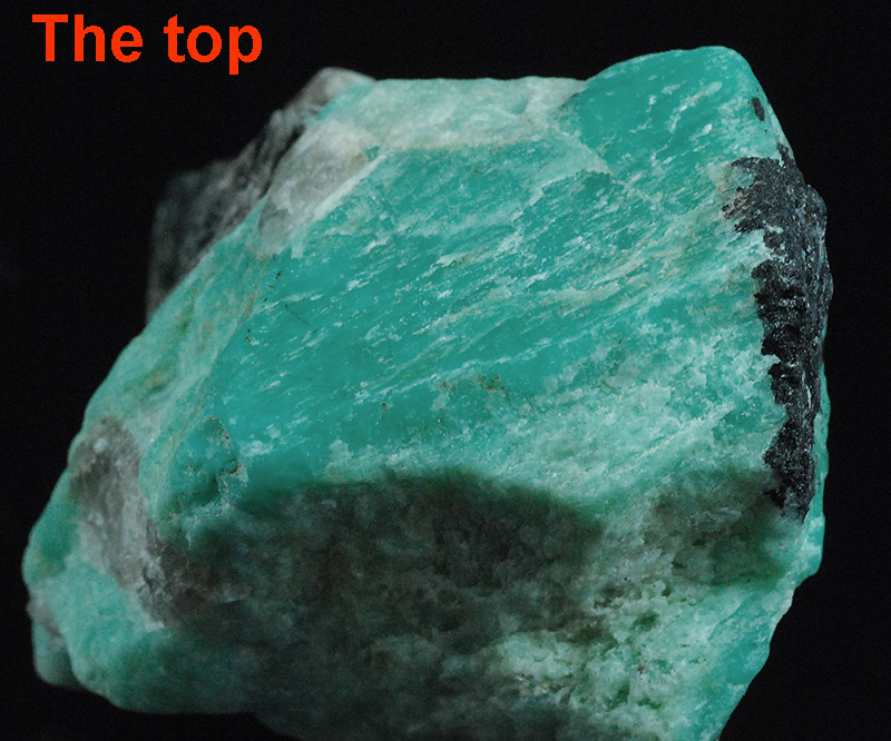 Large but not well formed green crystal of amazonite, a variety of microcline. On the crystal there are dark and massive traces of smoky quartz and schorl.