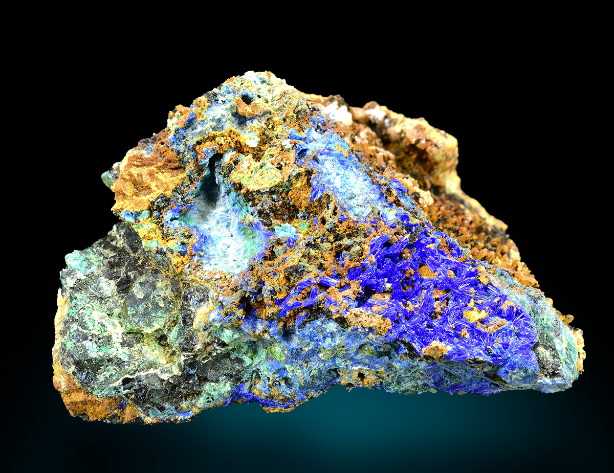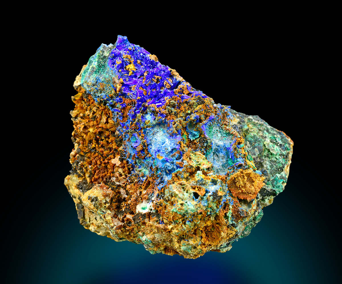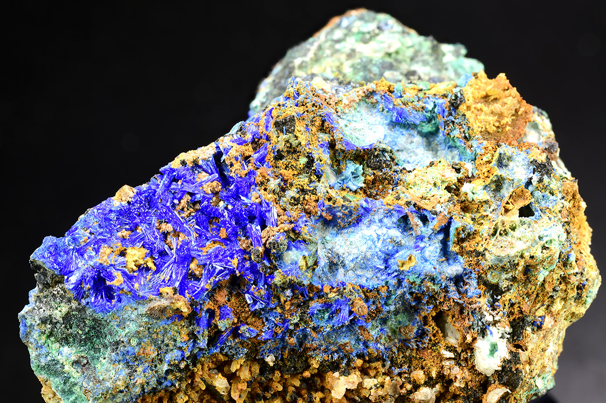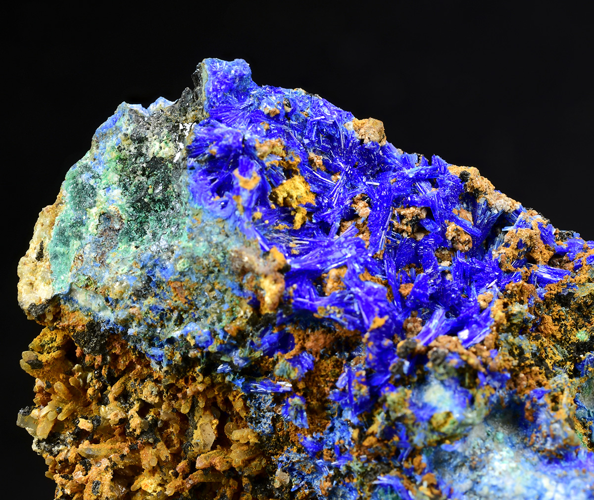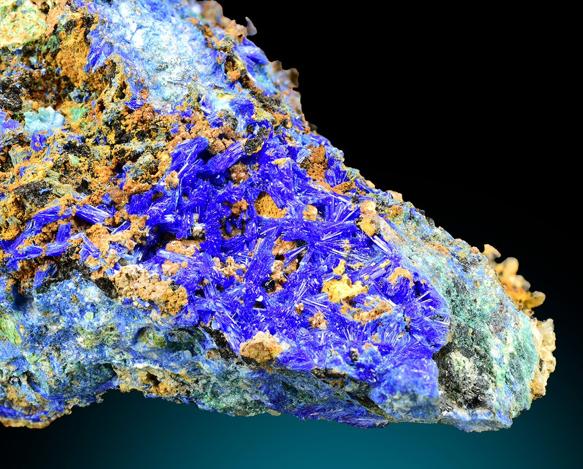 Aggregates of very sharp, brilliant, acicular Linarite crystals with very bright color. In a limonite matrix with Quartz, Brochantite growths, and an unknown light blue species, probably Caledonite.