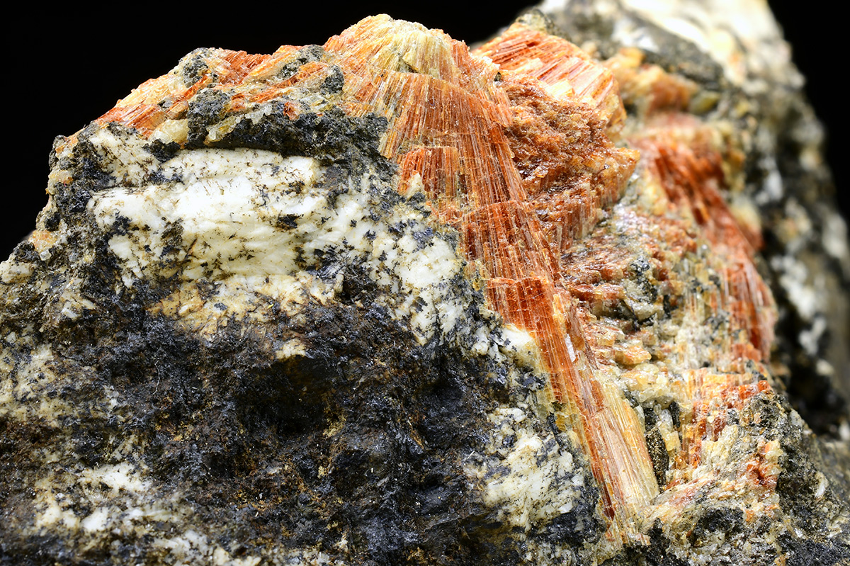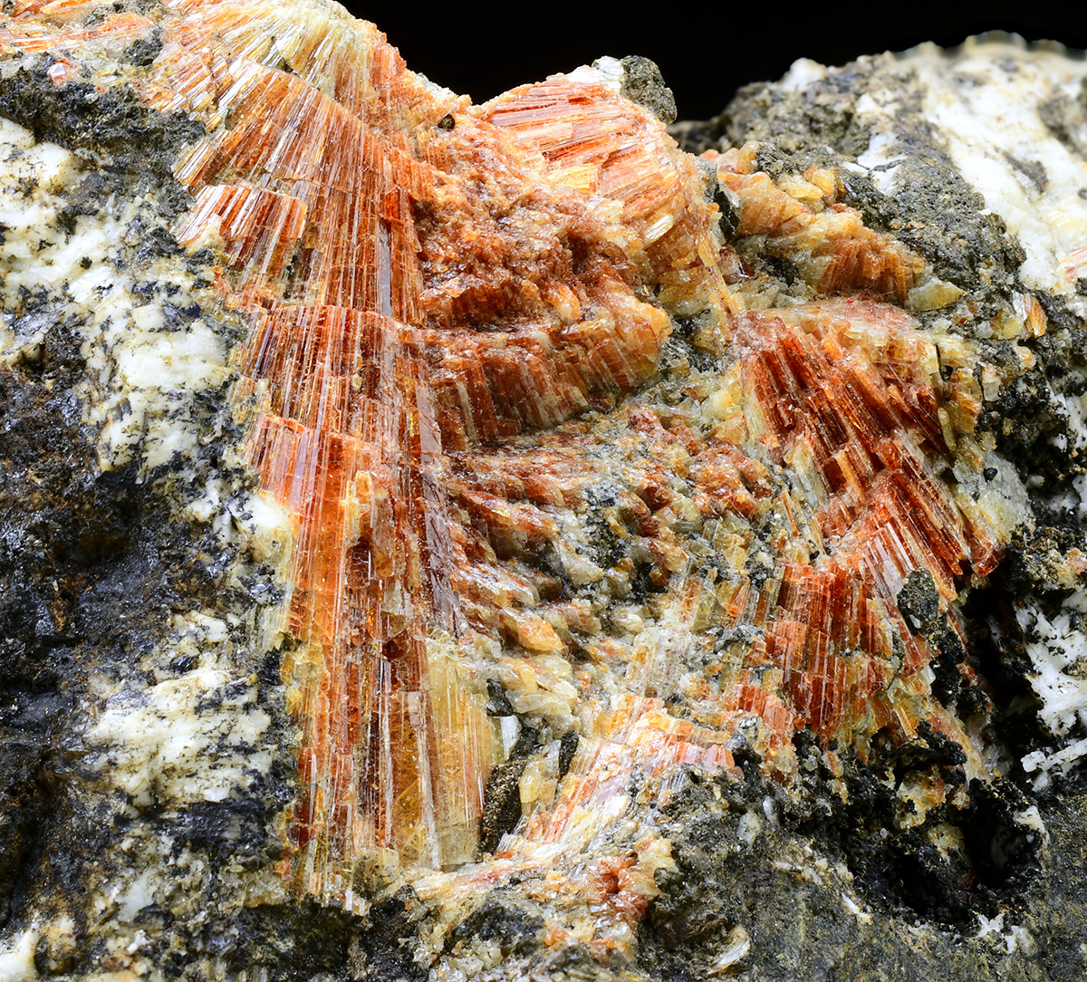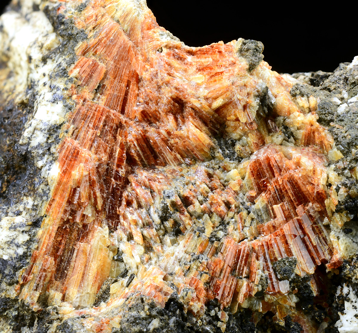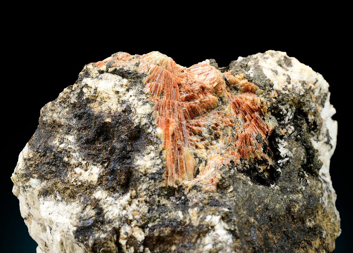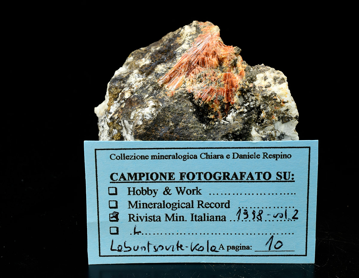 Reddish-orange sprays of labuntsovite-Fe in matrix up to 1,0 cm long from N'orkpakhk Mountain, Murmansk Oblast, Russia. This locality produces some of the world's largest labuntsovite crystals. This sample is photographed in the Italian mineralogical magazine year 1998 vol. 2 pag. 10