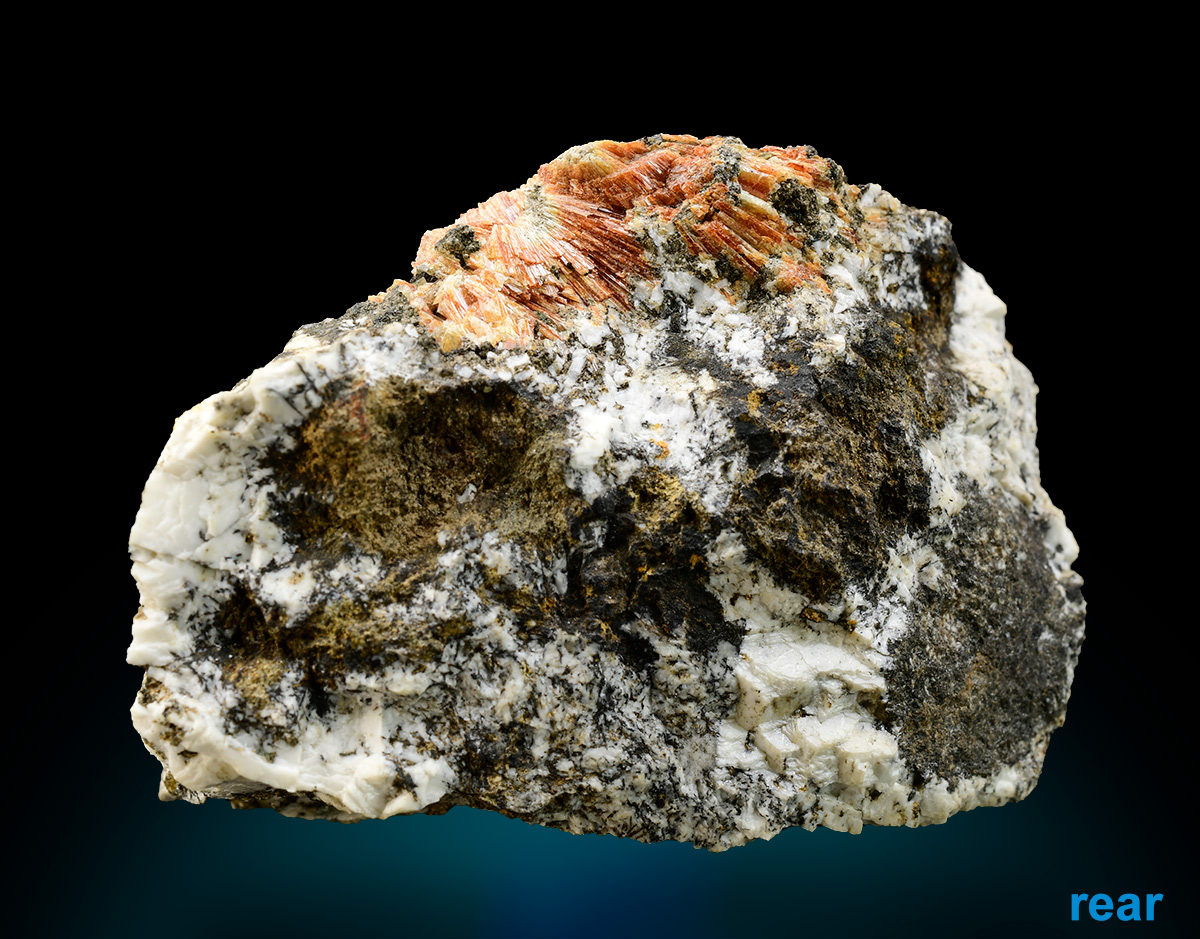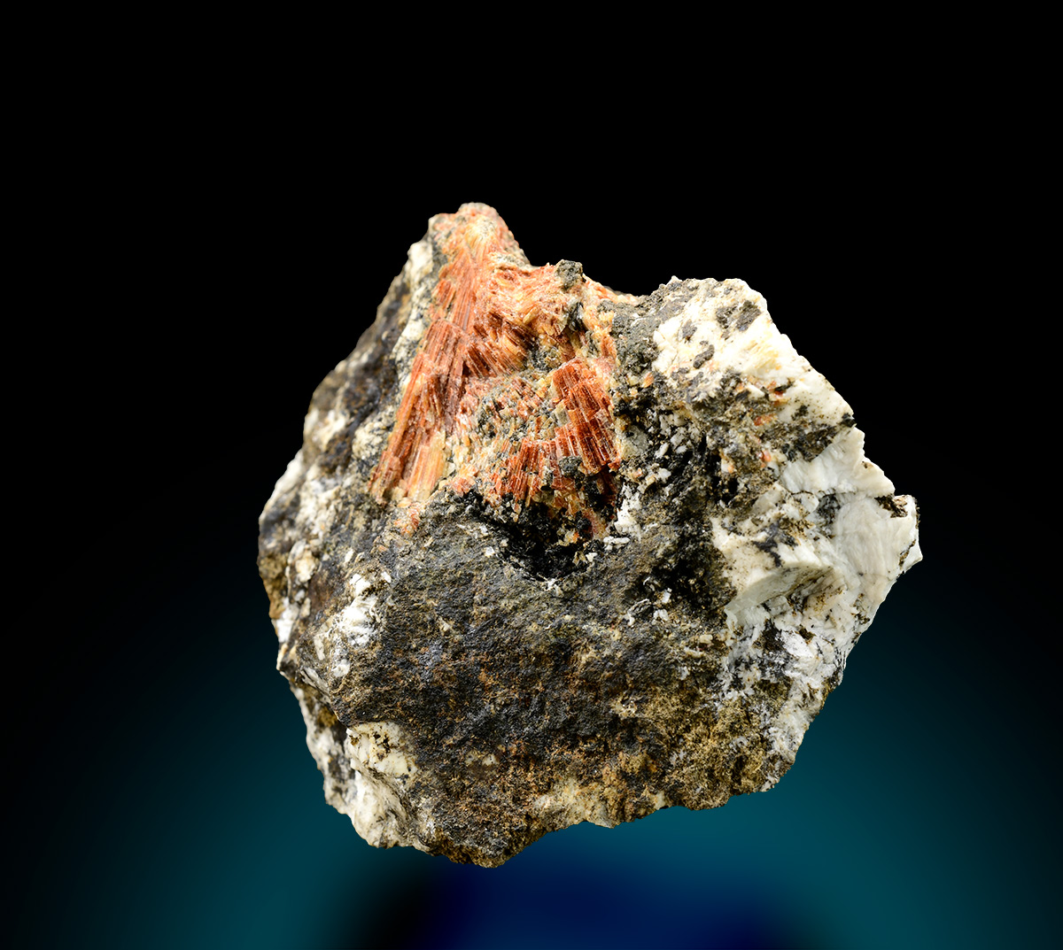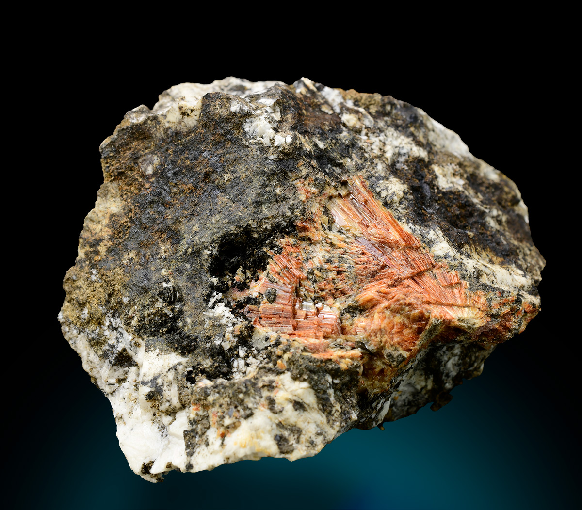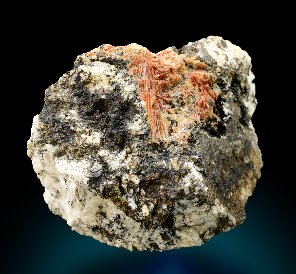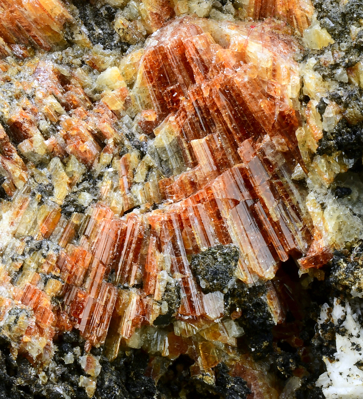 Reddish-orange sprays of labuntsovite-Fe in matrix up to 1,0 cm long from N'orkpakhk Mountain, Murmansk Oblast, Russia. This locality produces some of the world's largest labuntsovite crystals. This sample is photographed in the Italian mineralogical magazine year 1998 vol. 2 pag. 10