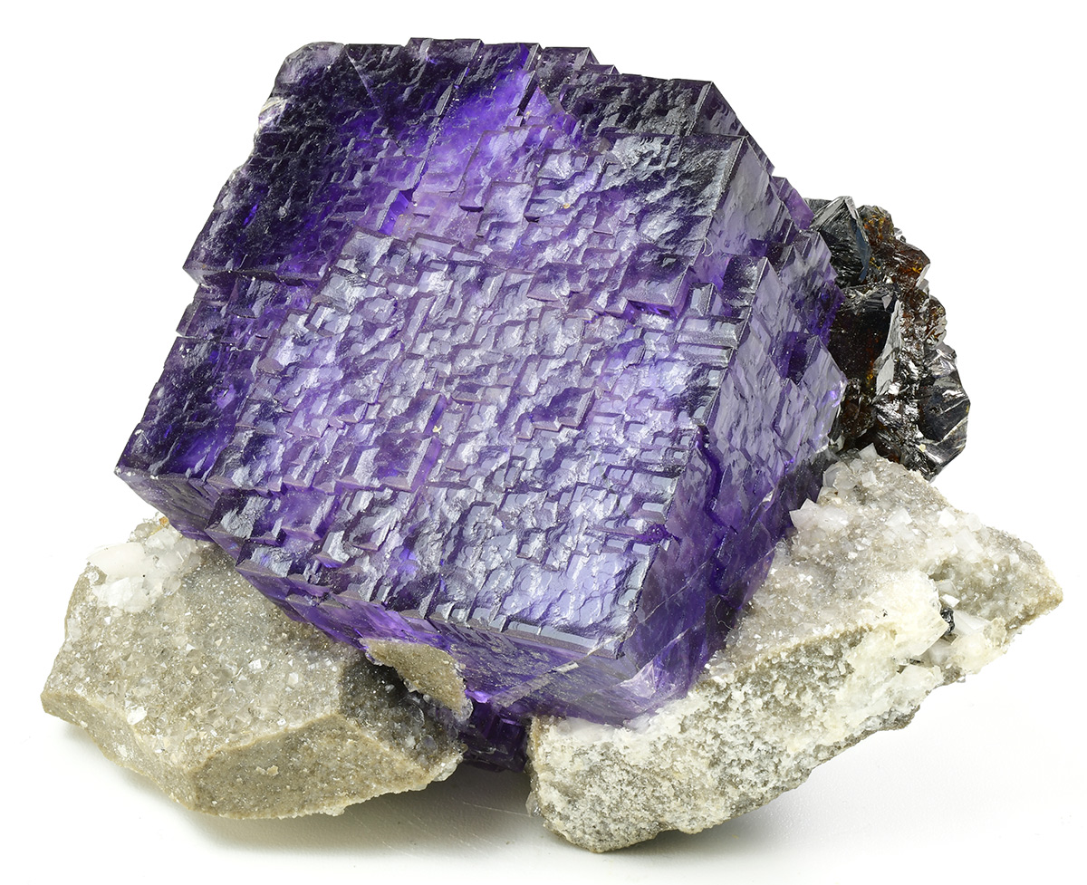 Really nice group of lustrous, translucent, dark purple Fluorite crystals measuring 44x42x30 mm with well defined deep red Sphalerite xls in association on matrix.