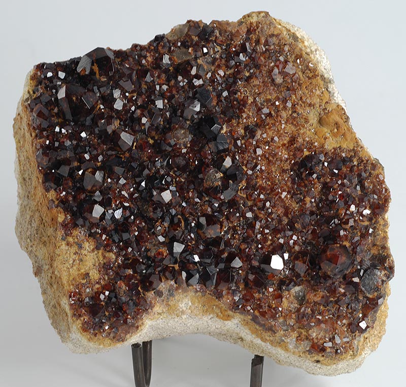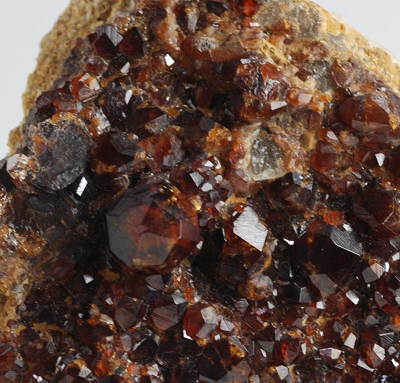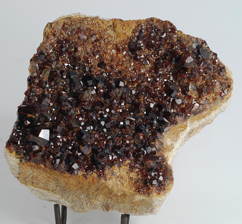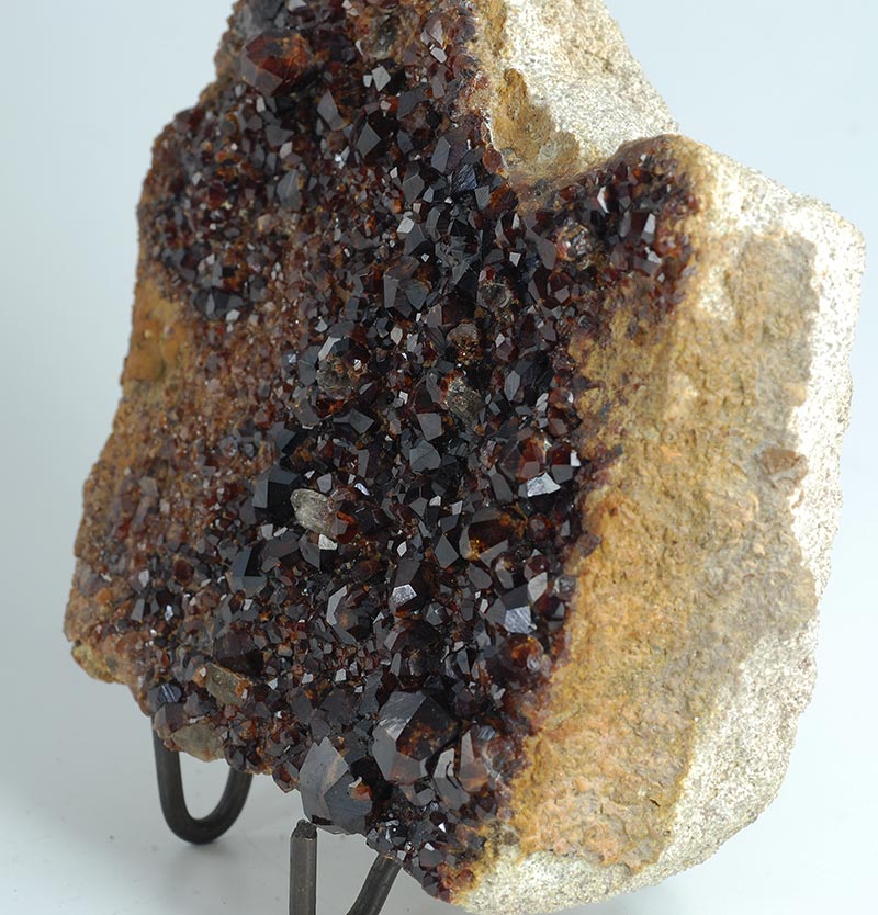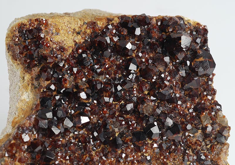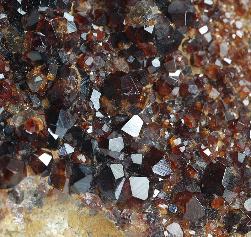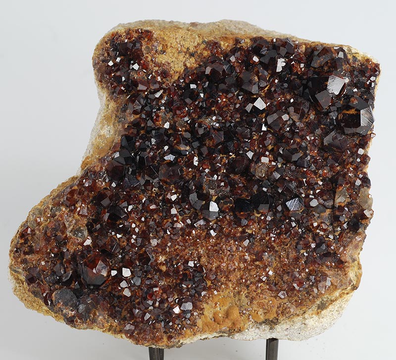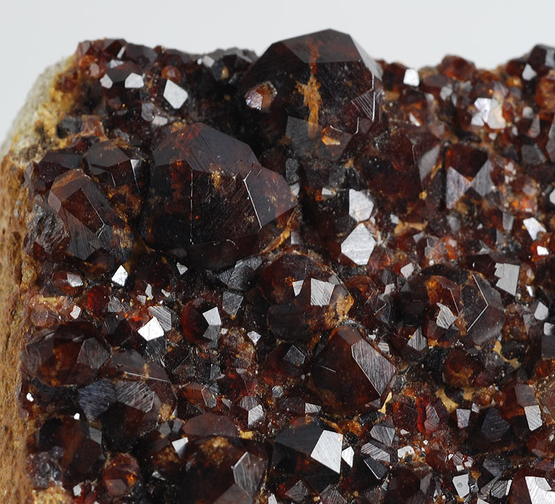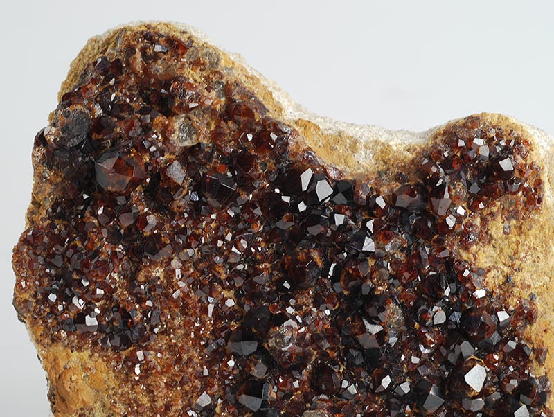 The surface of this druse is densely covered with large and small spessartine garnets, that have a very dark brown color. Some are so dark that they look like small smoky quartz. When illuminated closely they become semi-transparent and turn red in color.