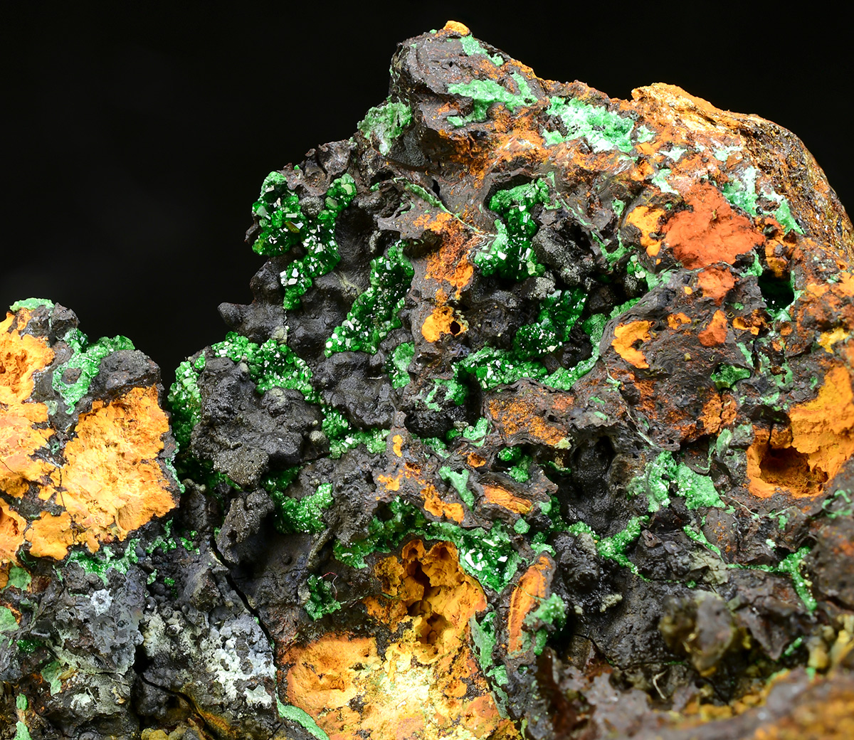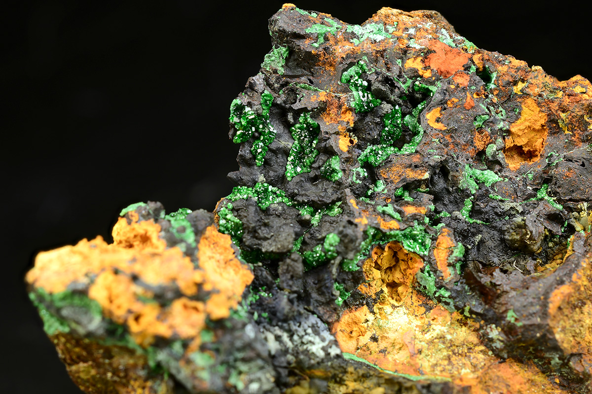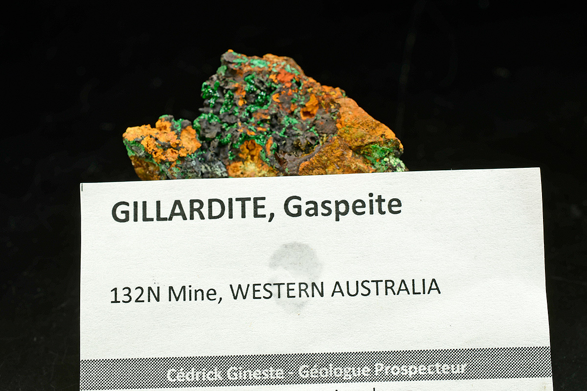 This is a very rare attractive specimen with emerald green crystalline Gillardite richly set on matrix with Gaspeite in association. Is an extremely rare copper nickel chlorine halide, found only at this locality to date. This mineral seldom crystallizes and although small, these crystals are discrete and eye-visible.
