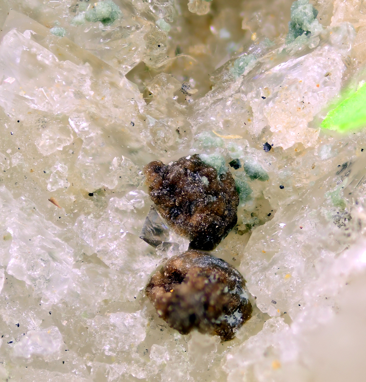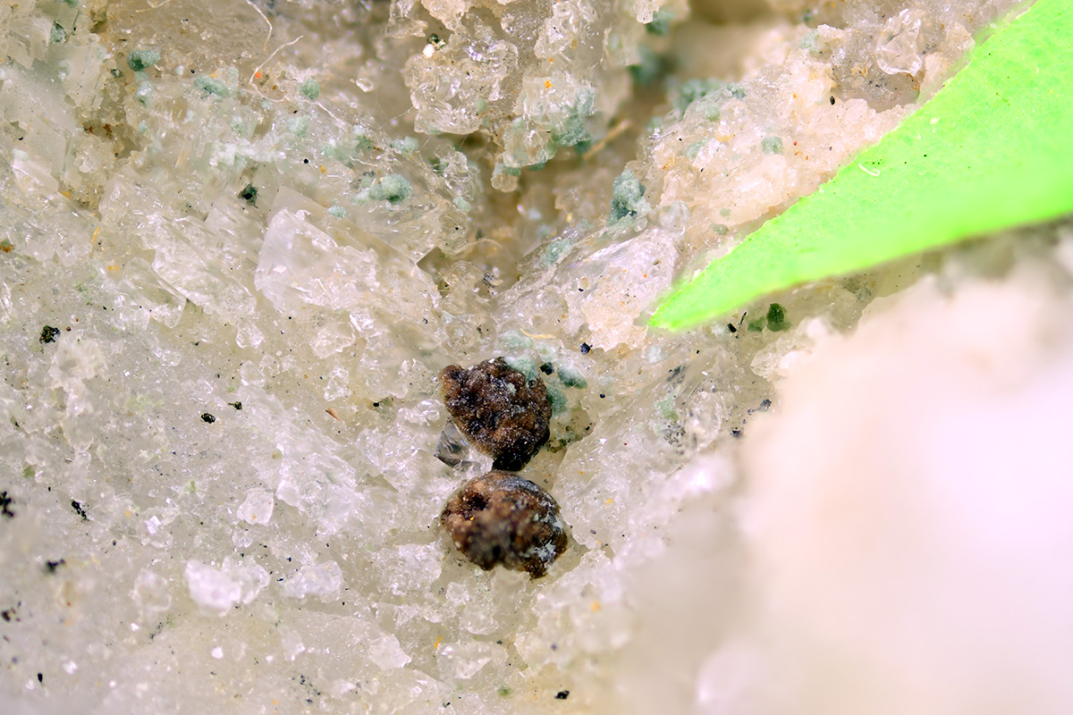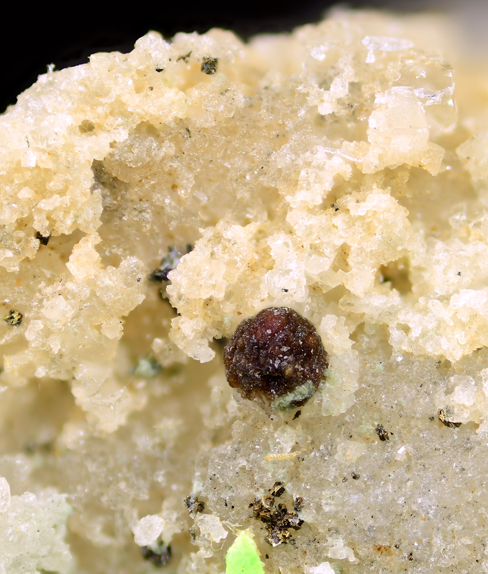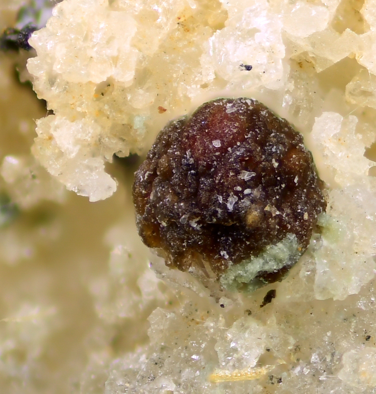 Extremely rare minute brownish colored spherical Juonnite xls up to 0.5 mm, in dolomite vugs from the type locality.