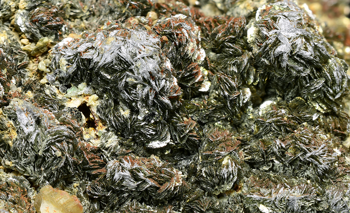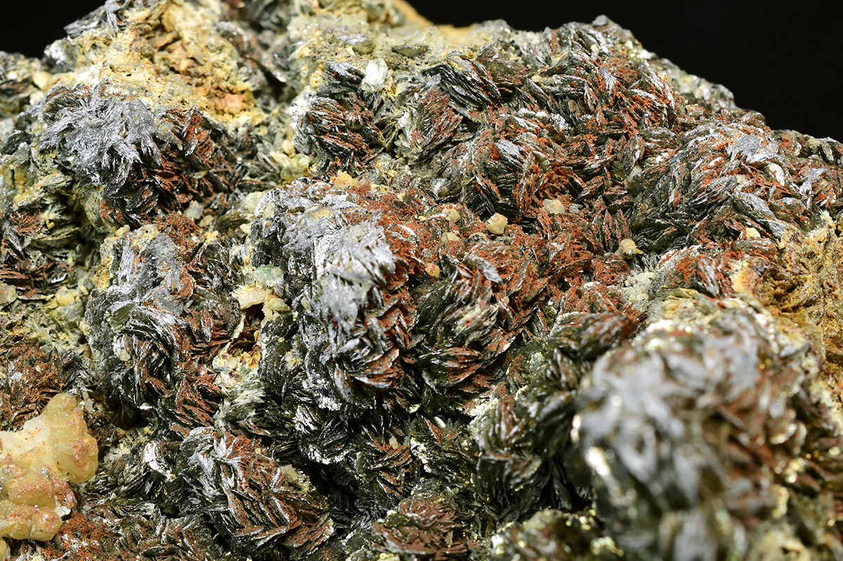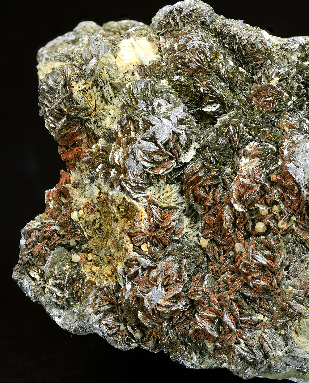 Cluster of metallic lead grey Lollingite crystals up to 1.2 mm n rosettes richly cover the matrix. Well-crystallized Alpine löllingite is very rare in the first place. In Italy, the best specimens came from this Piedmont locality, two small mine adits. Only a handful of specimens were recovered across the years, and the locality is practically defunct. This specimen is a very good representation of what the mine once provided.