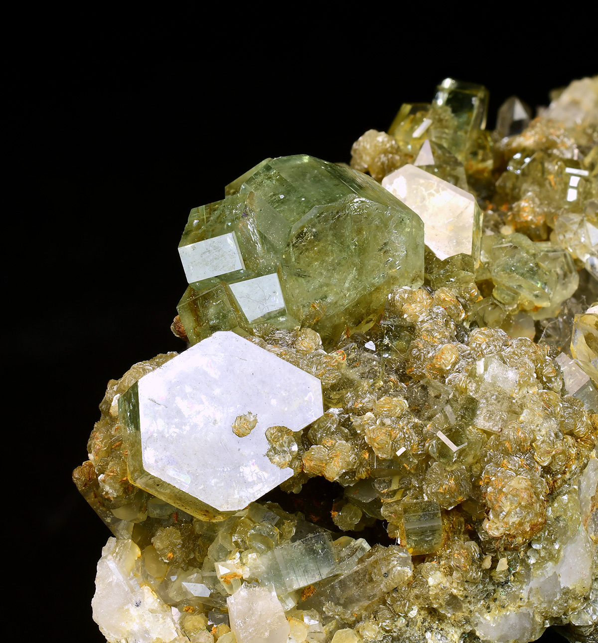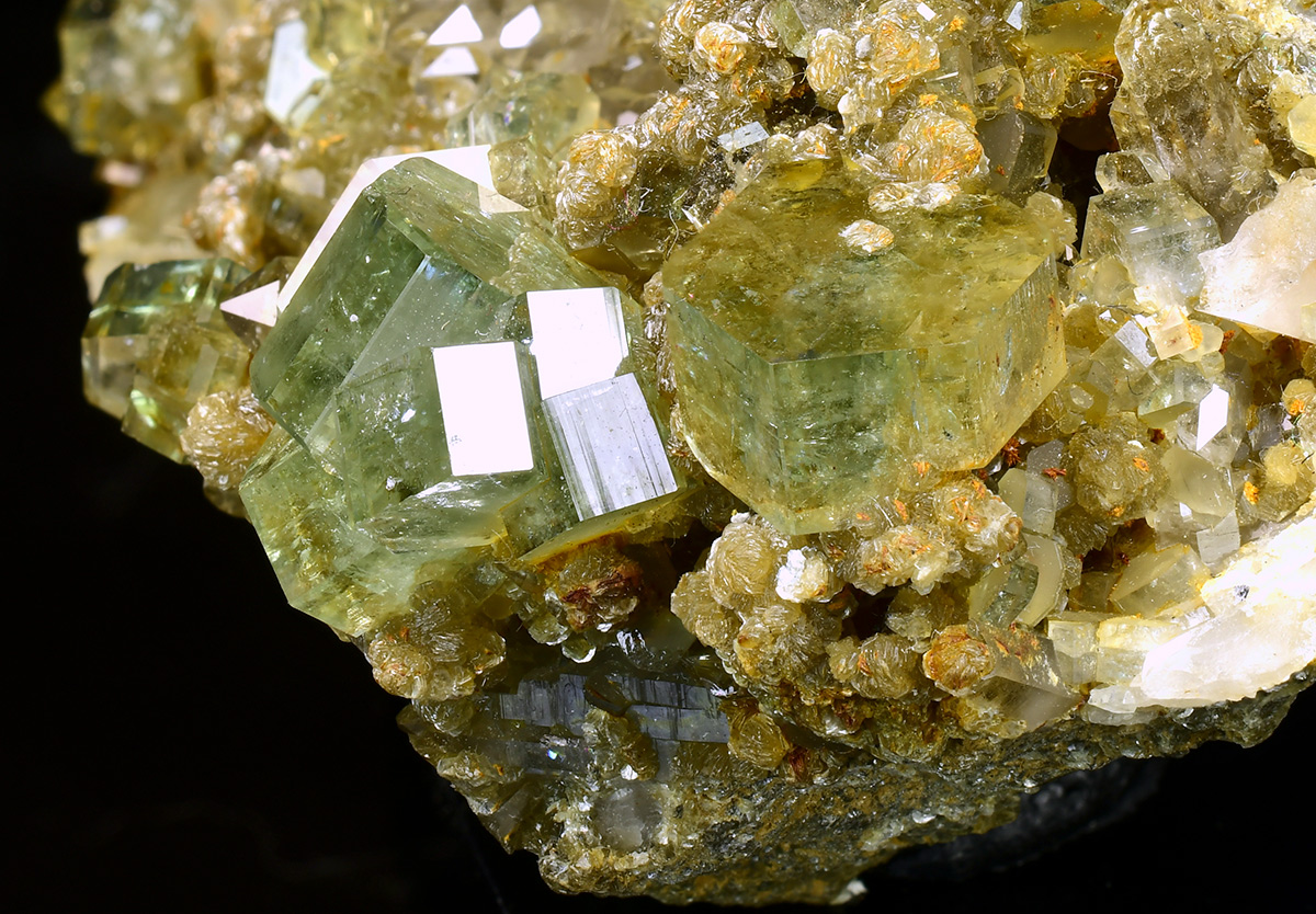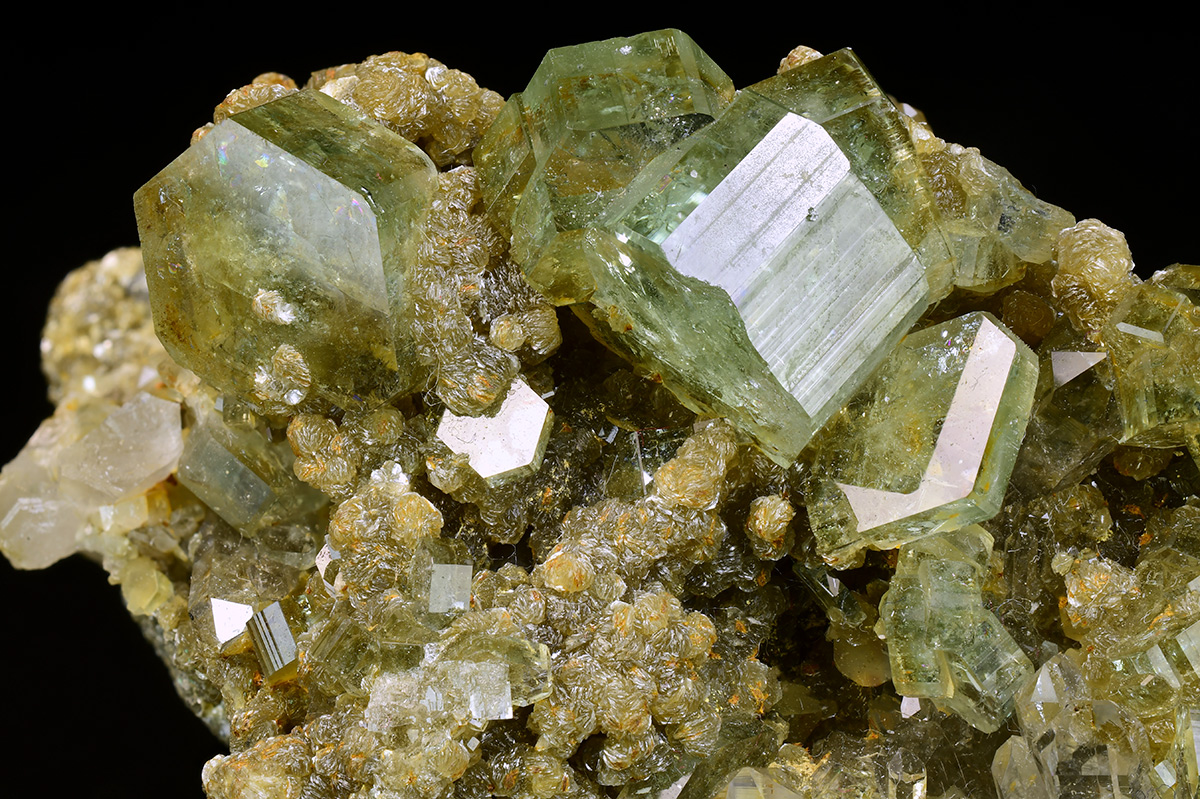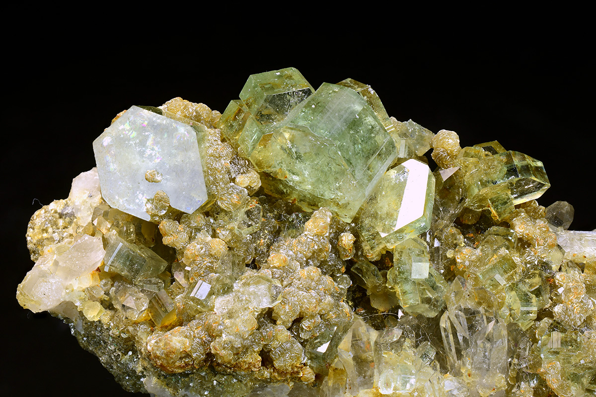 Sample with well-exposed hexagonal crystals of fluorapatite on matrix with muscovite and quartz xls in association. The crystals has a very good luster and a green color.