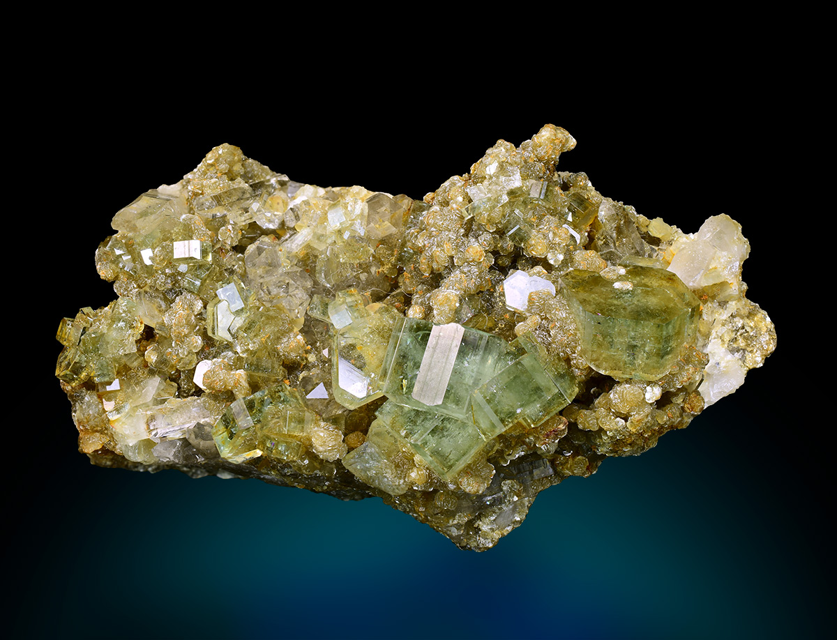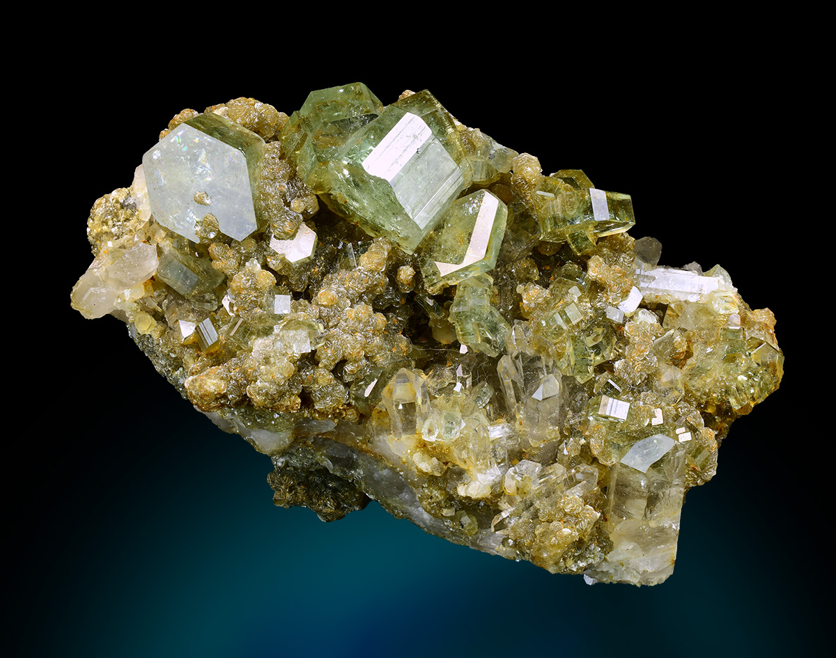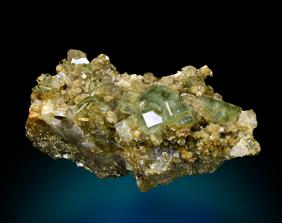 Sample with well-exposed hexagonal crystals of fluorapatite on matrix with muscovite and quartz xls in association. The crystals has a very good luster and a green color.