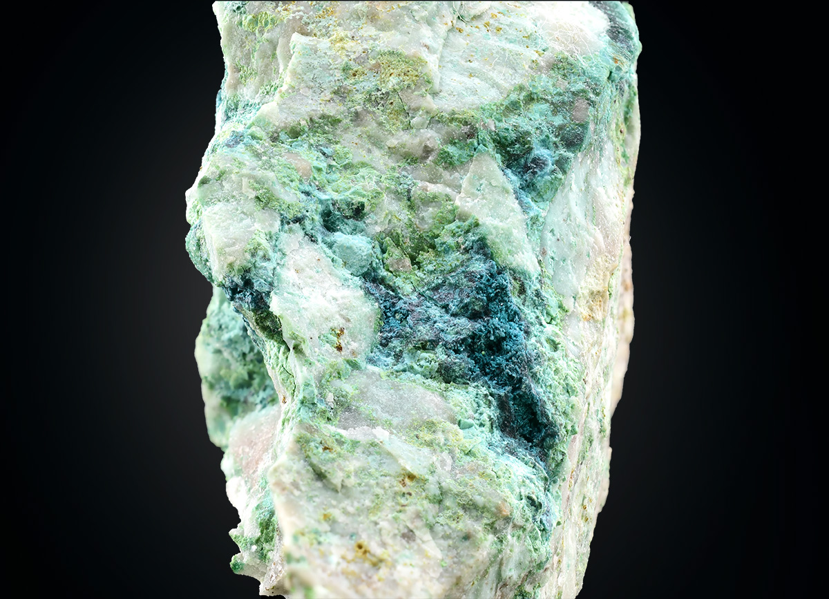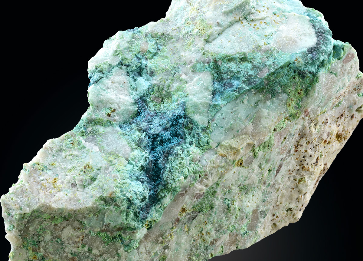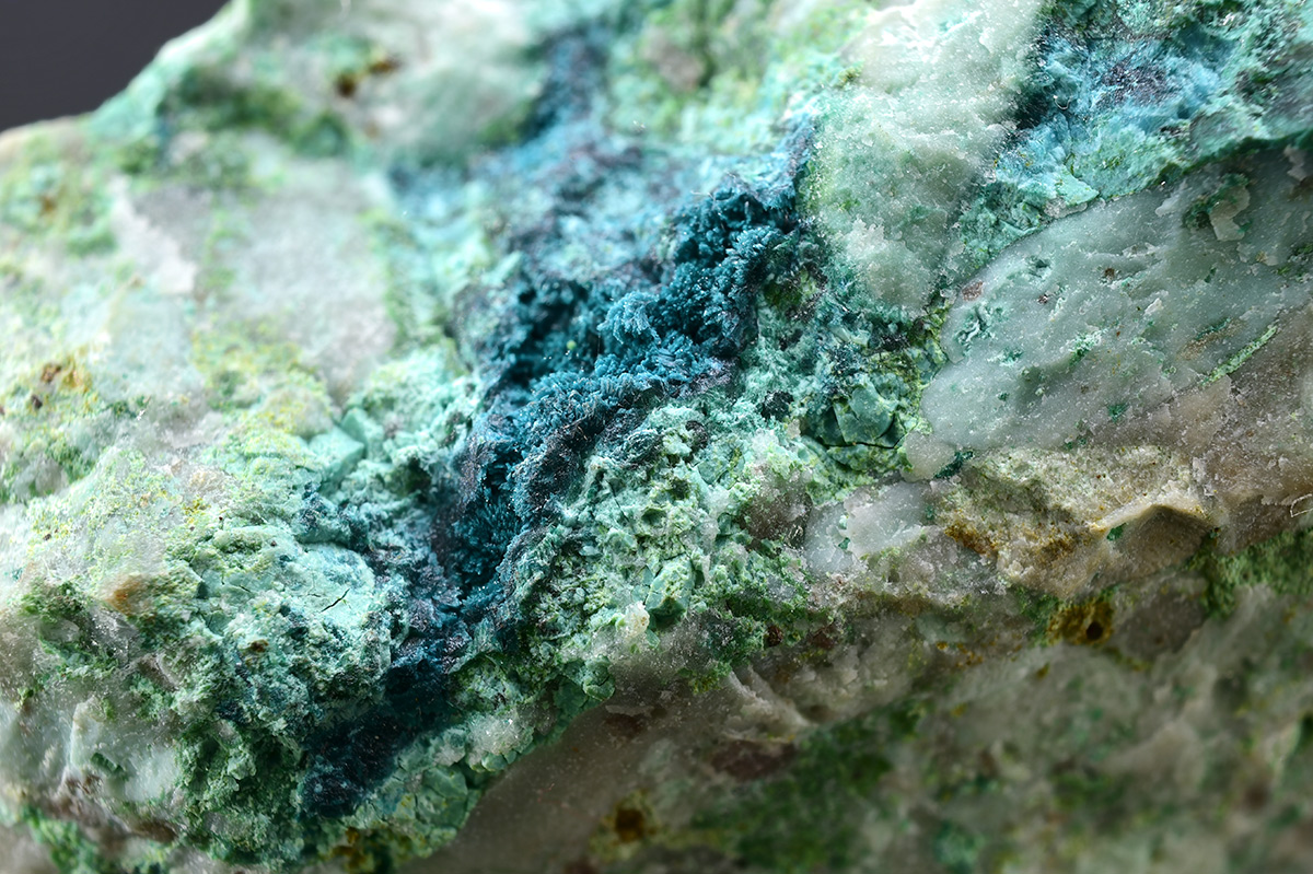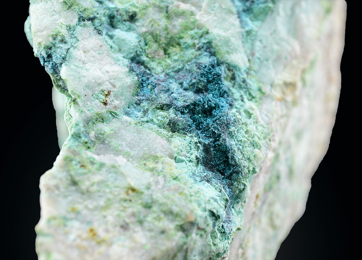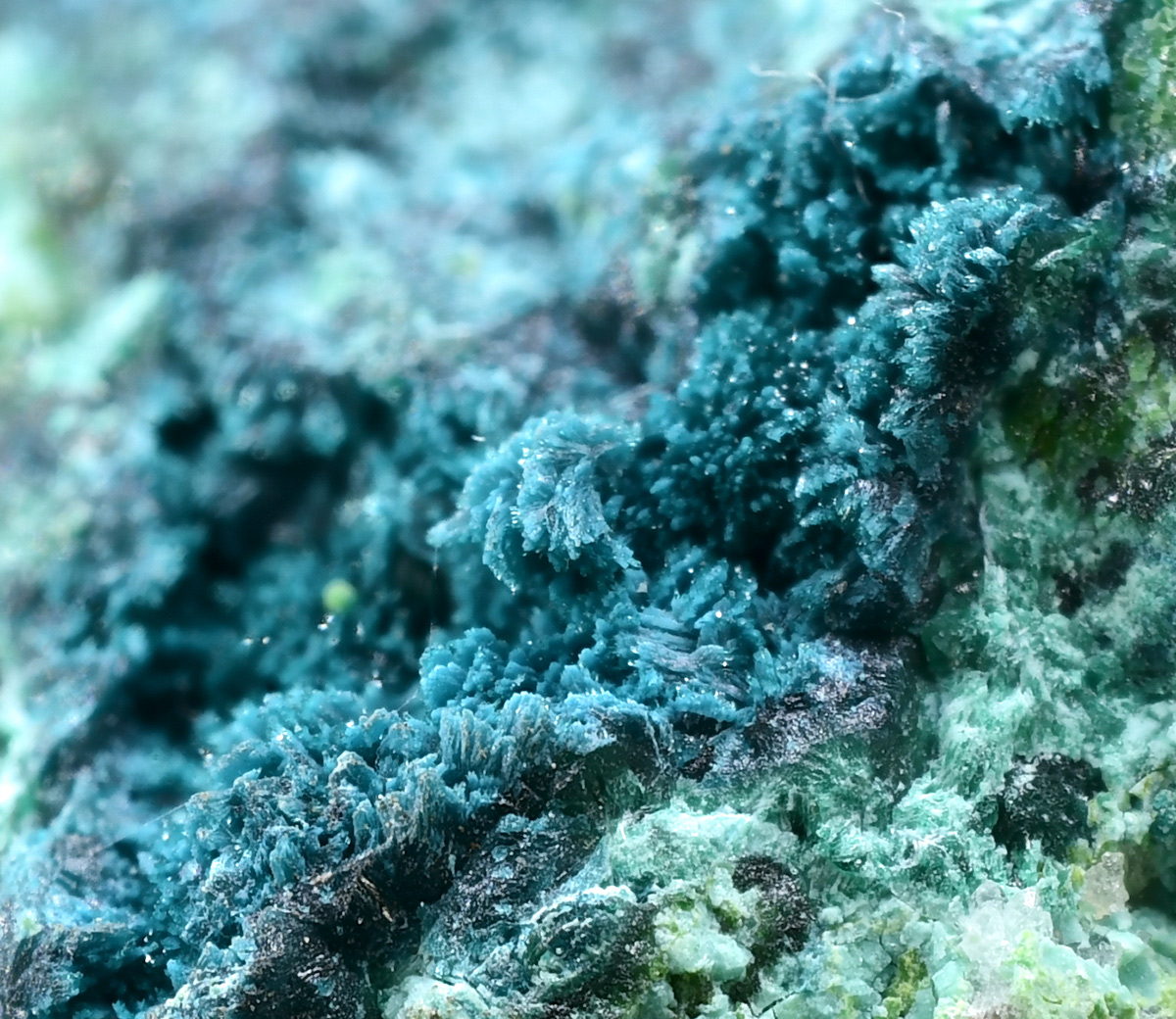 Gilmarite in blue rosettes xls up to 1 mm scattered in vugs of matrix with green Conicalcite in association .A rare copper arsenate. Ex Sandro Maggia coll.