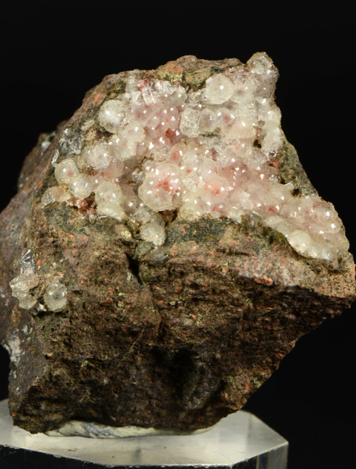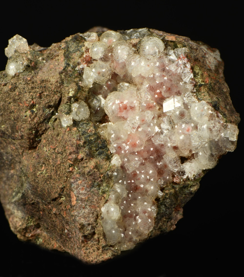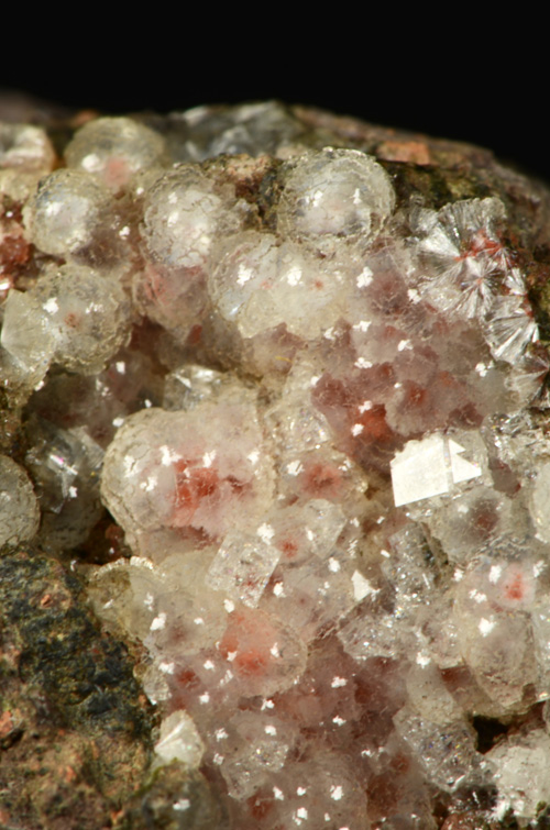 Stilbite (puflerite var.) in lustruous spheric aggregates of crystals associated with colourless chabazite pseudocubic crystals.