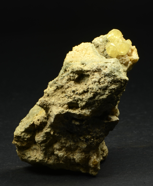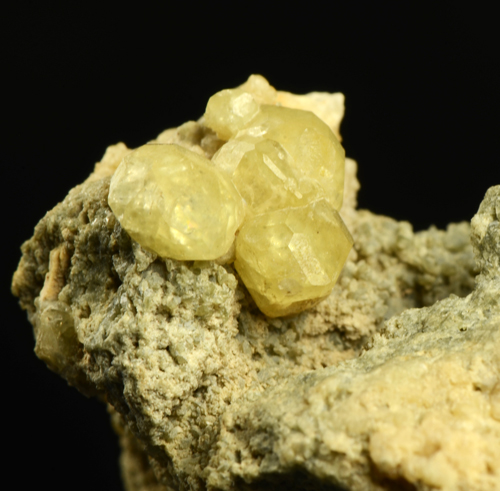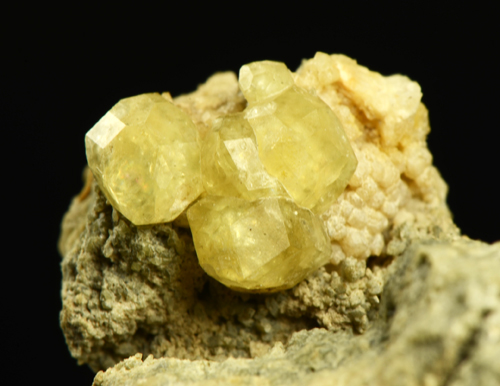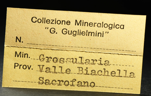 Specimen hosting three well defined, yellow xls of Grossular, well exposed on matrix from the classic occurences in the central Italy. Former Guglielmini collection, with label.
