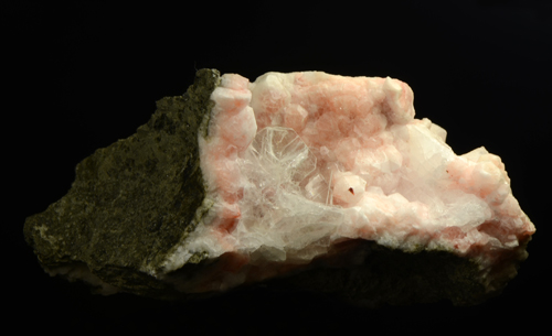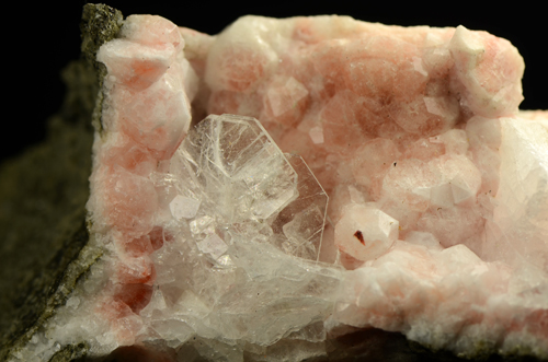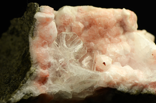 Fine, lustruous and transparent xls of Apophyllite on matrix. Nice contrast with the surrounding pink analcime. Perfect damage wise. Very good sample from a classic italian locale.