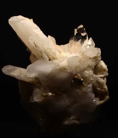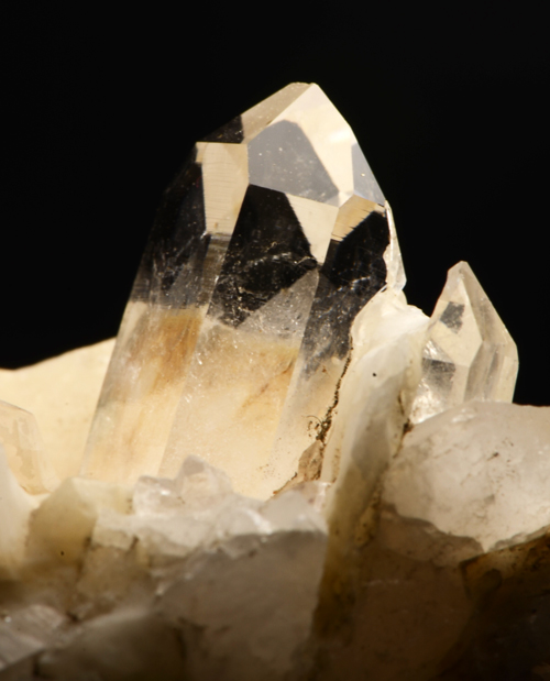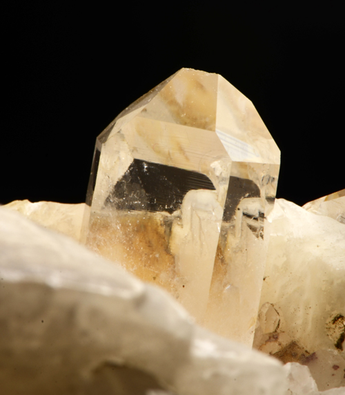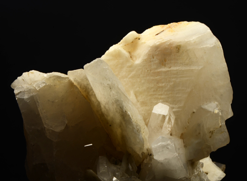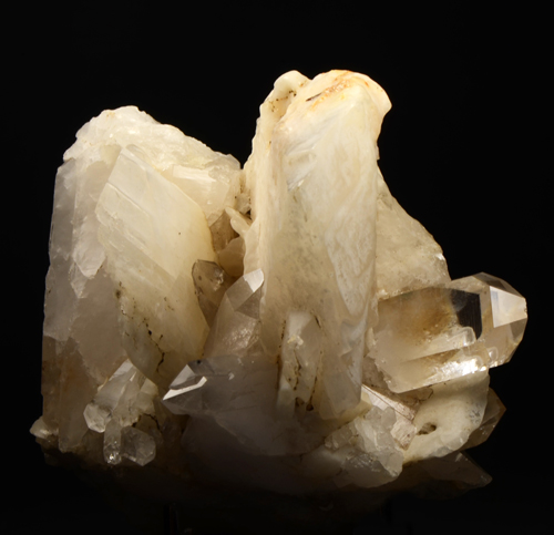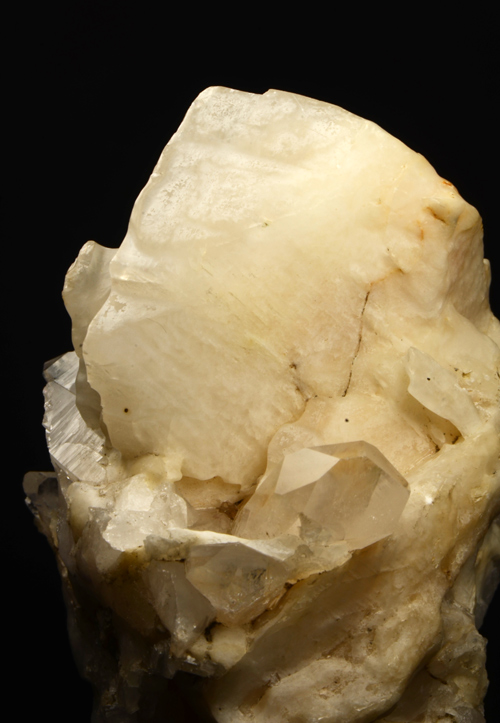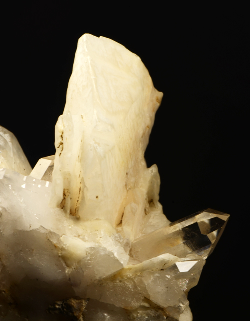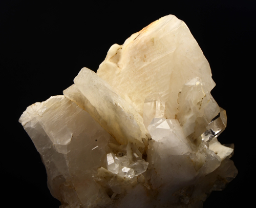 Estetic specimen featuring colourless Quartz crystals grown on flat pearl white rombohedra of Calcite.