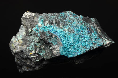 Tuffs of thin xls of Serpierite set on the display side of the matrix. Showy light blue colour, very brilliant. Uncommon specie from a very interesting italian locale for selenium minerals.
