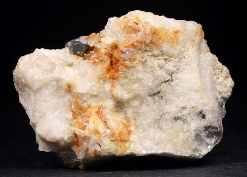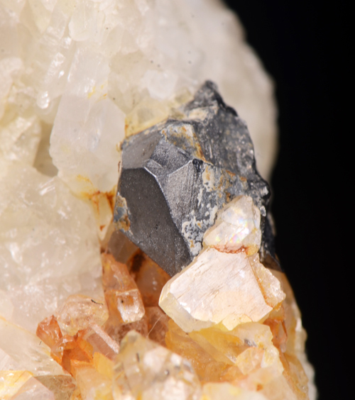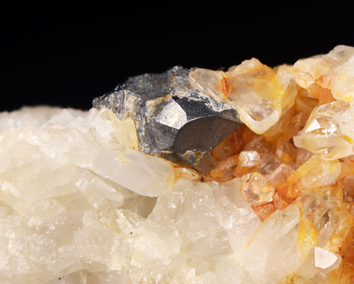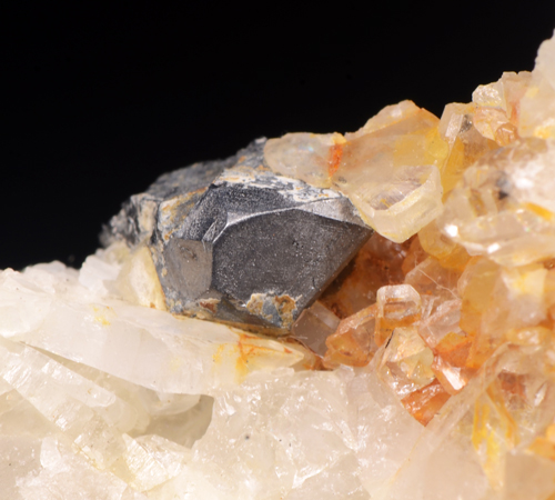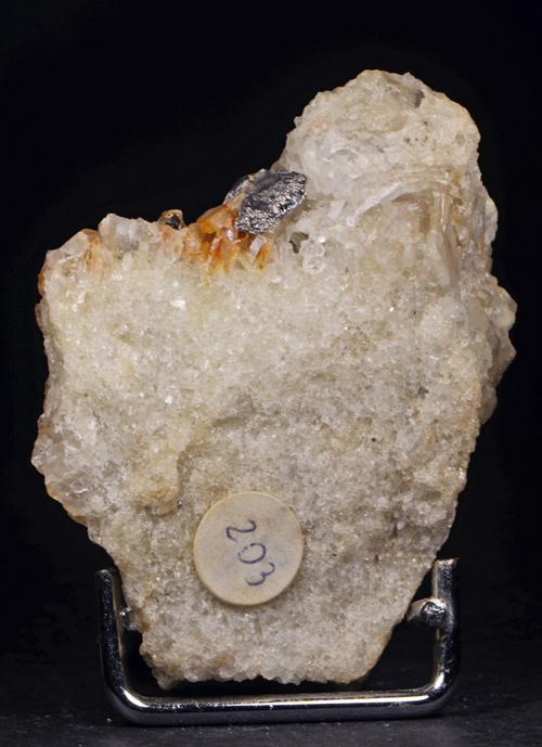 A mass of lead grey Geocronite is set in a vug among clear Quartz xls. In the front side of the specimen, The Geocronite is well shaped showing the faces of the Xl. Extremely rare!