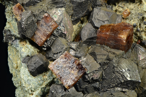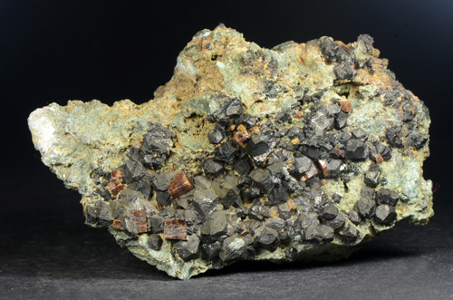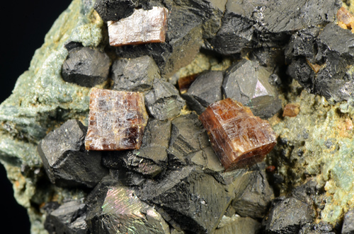 Fine druse lined with black metallic xls of Magnetite, among which there are clean, brilliant cubes of brown Perowskite to 0,4 cm on edge. Oldtimer from a classic italian locale, now gone.