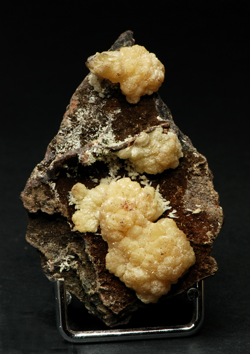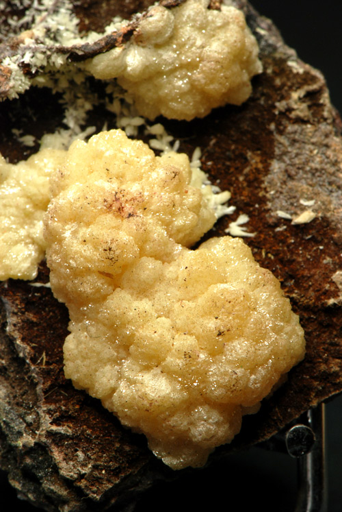 Plate of gossan matrix hosting several aggregates of yellowish Mimetite xls, aesthetically scattered on it. Classic stuff from Tsumeb.