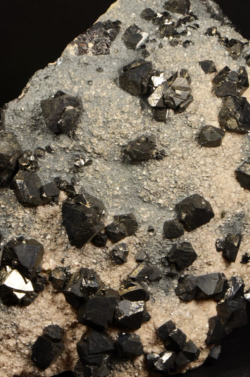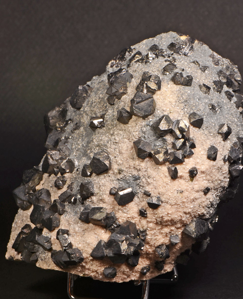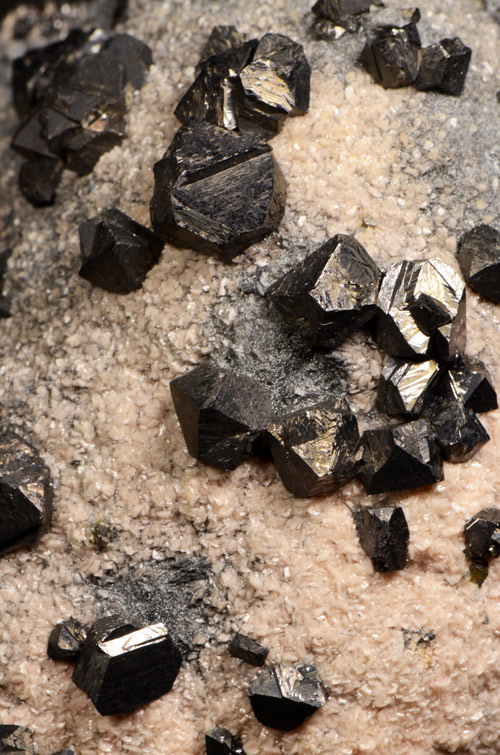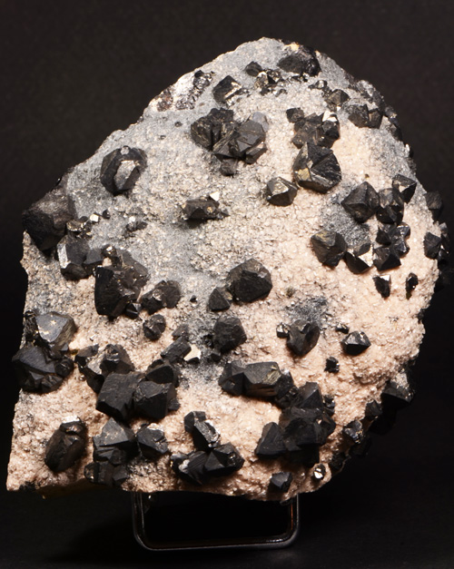Fine cluster featuring lots of black tetrahedra of Sphalerite scattered on a bed of pinkish rhodochrosite, from one of the most famous european locale, now definitely closed. Showy!
