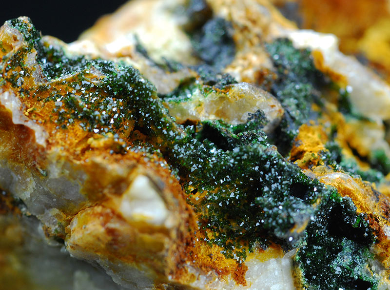 A specimen where several little, brilliant, green dark colored crystals of Liebethenite are in strong contrast with the whitish matrix. The pictures are a little overligthened to show the details, the real color is darker.