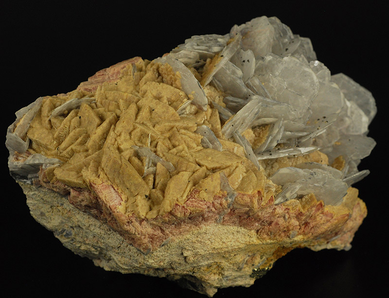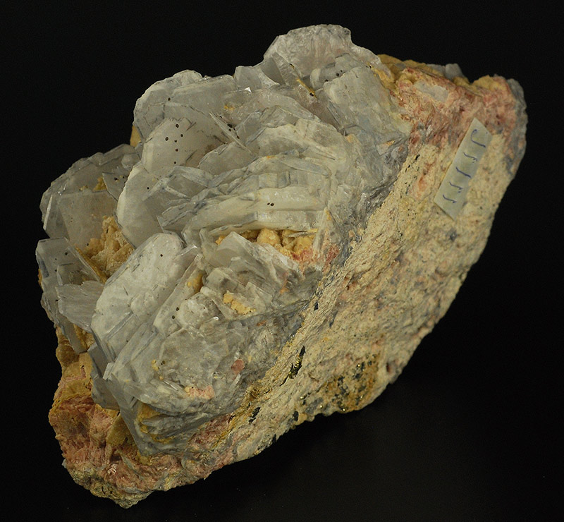 The cluster is covered by pink rhodochrosite: some blades, pale grey-blue colored barytes are grown over it.