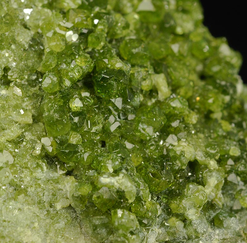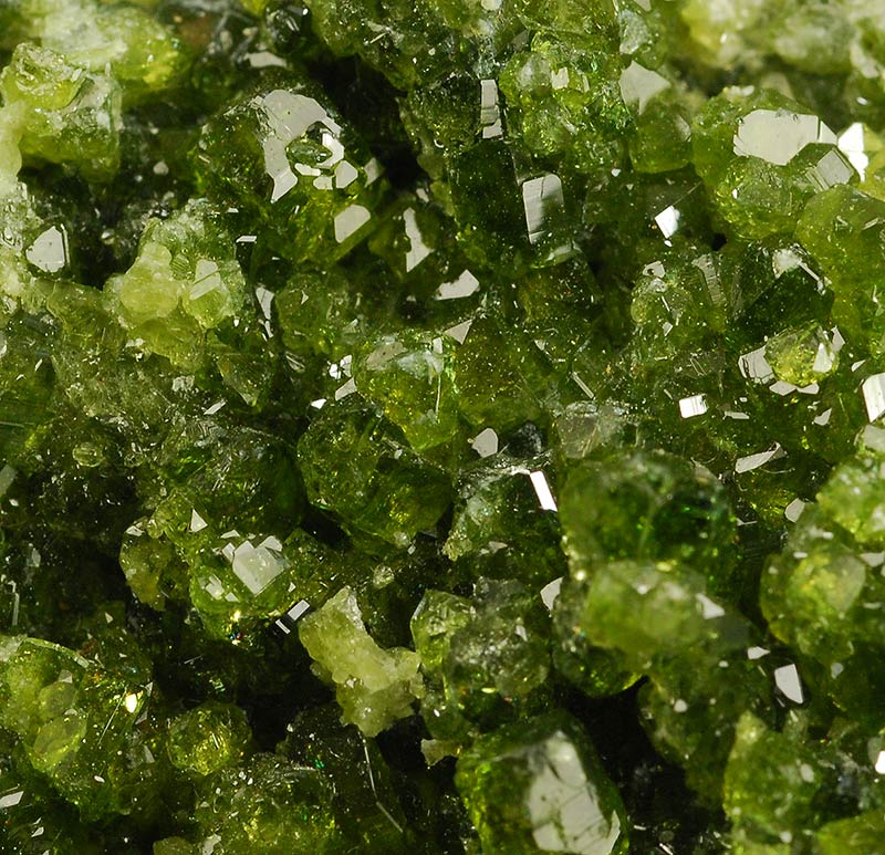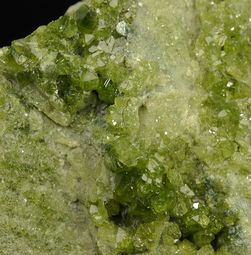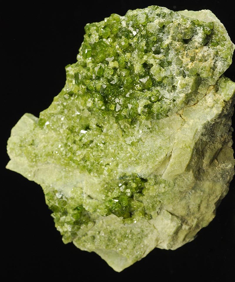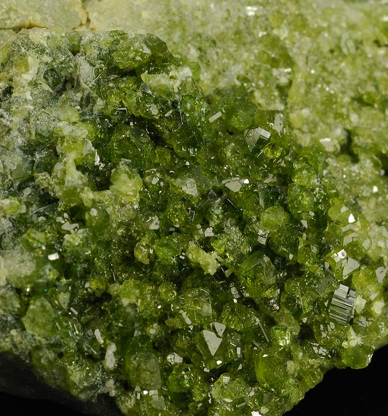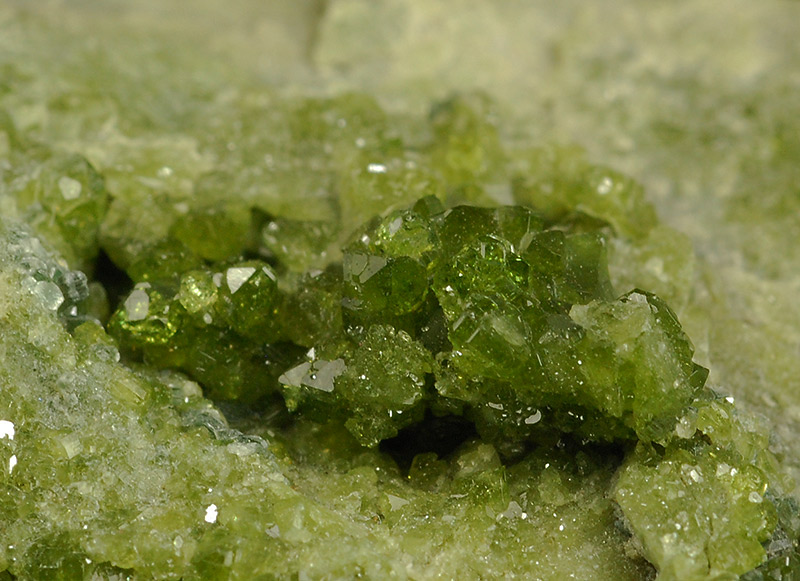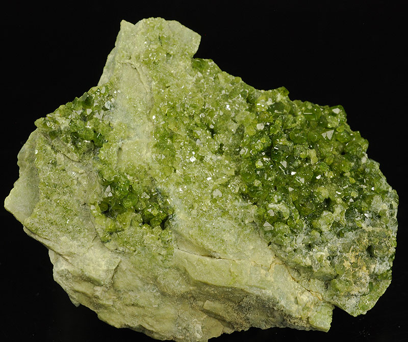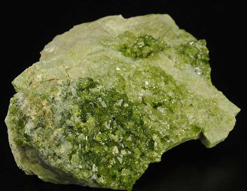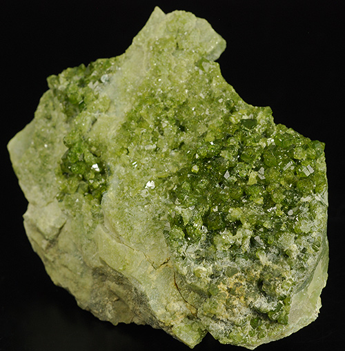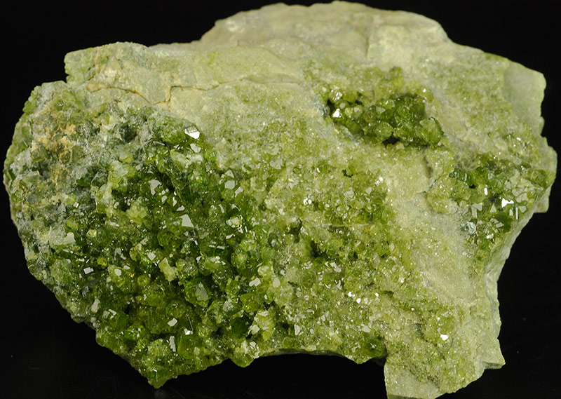 Several small and brilliant crystals of vesuvianite are seeded over the surface of this specimen. The green color is due because they are rich in chromium. From a found of almost 30 years ago.