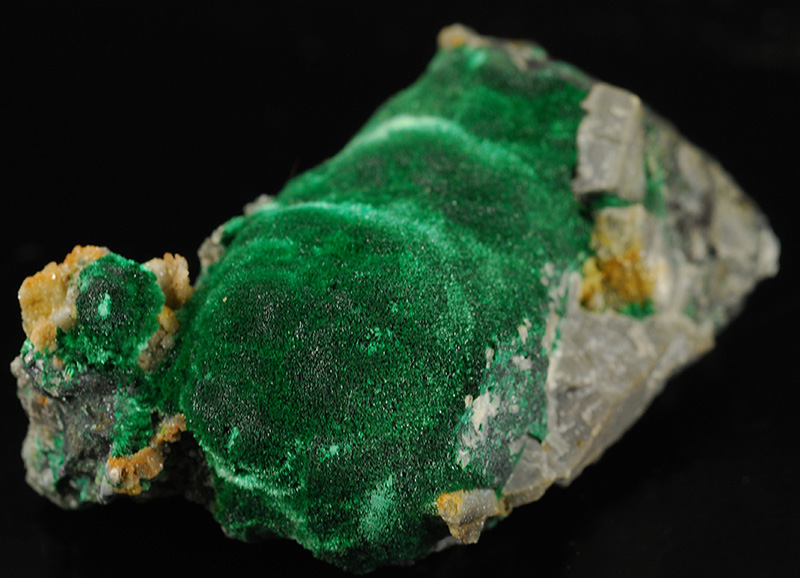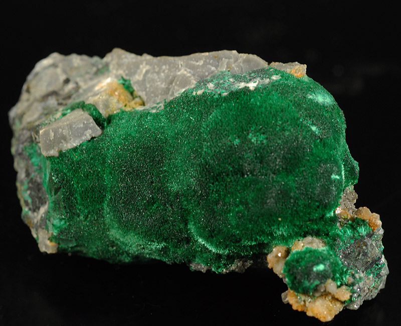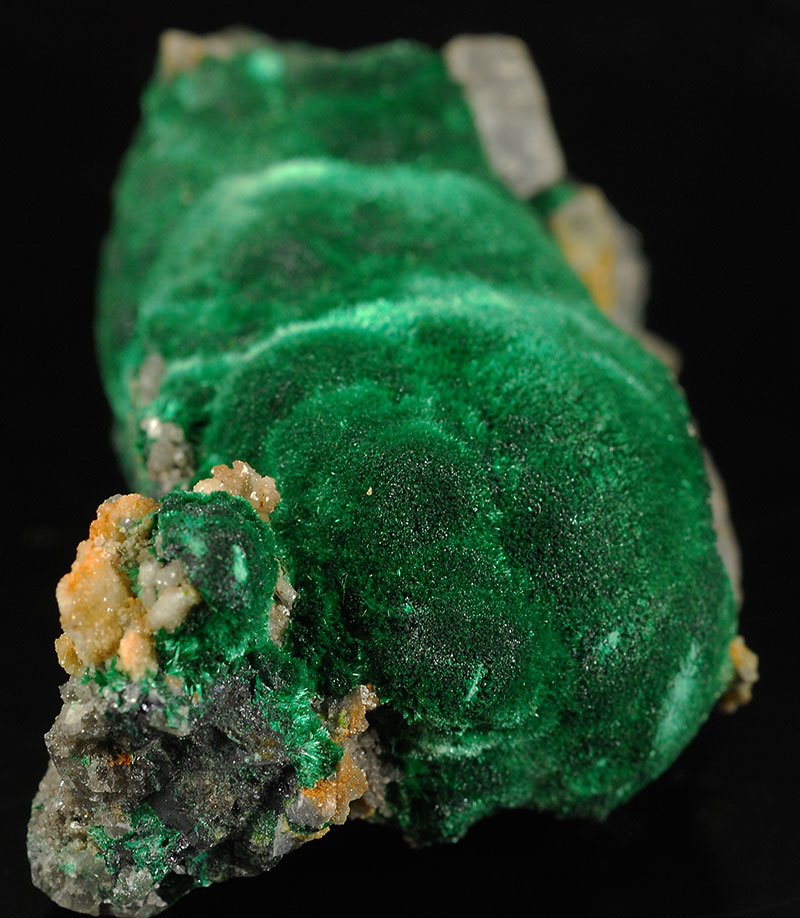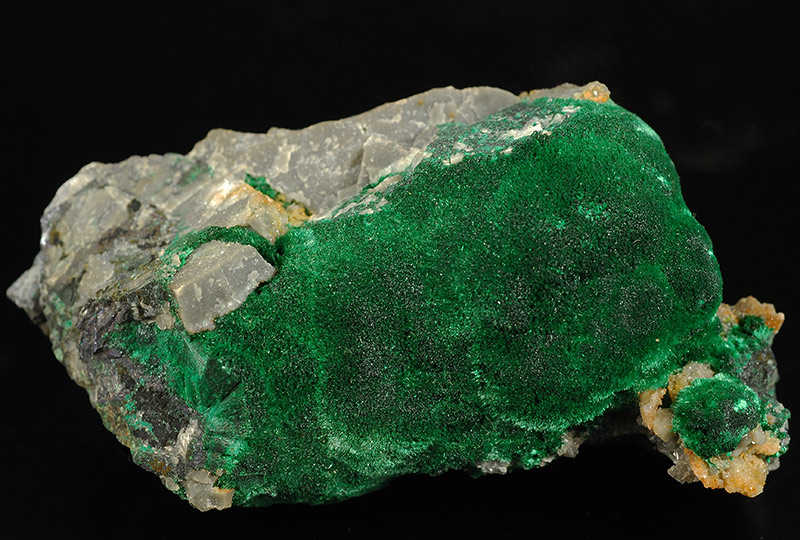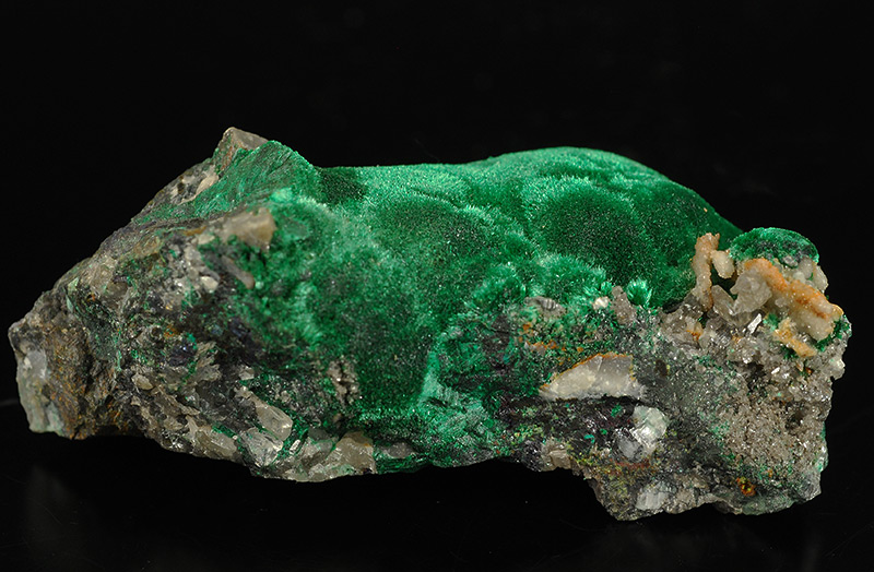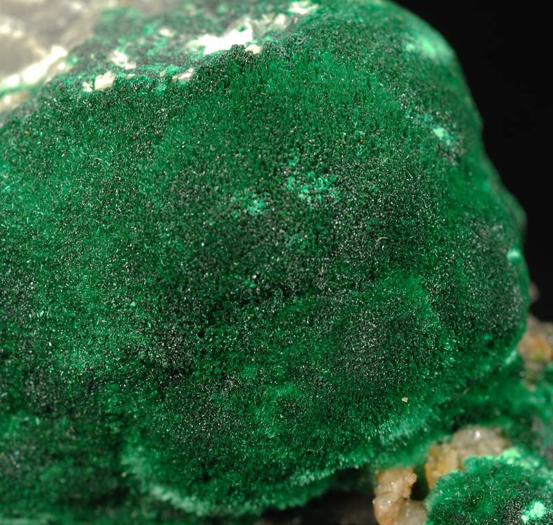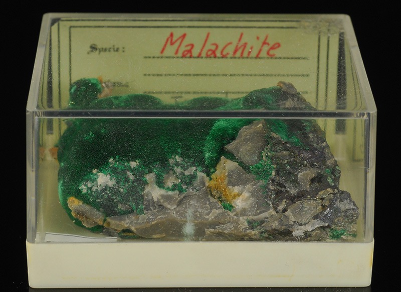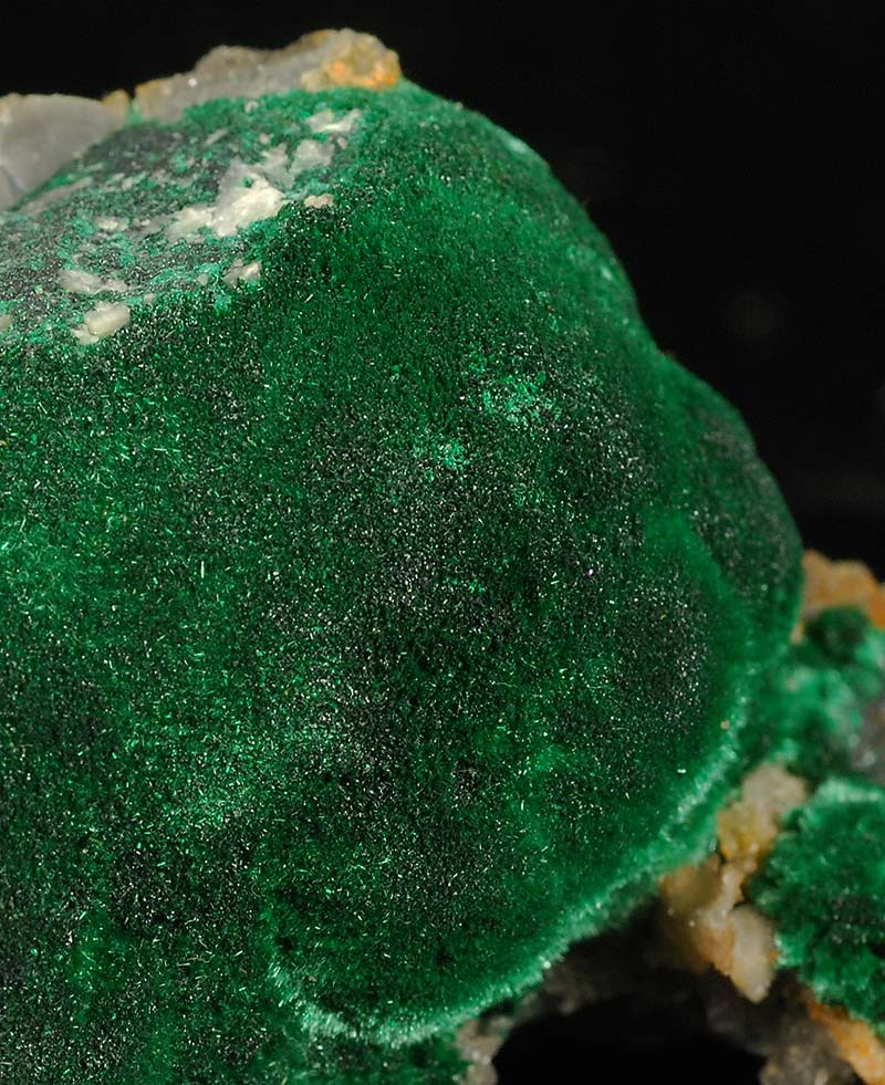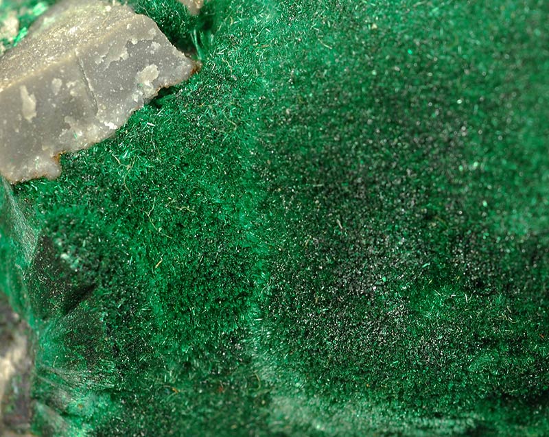 A carpet of soft felted thin crystals of malachite covers the surface of this specimen. The color is dark green: when you move the specimen under a light, it changes to pale, it seems a meadow of grass stirred by the wind. The pictures are a little overlightened to show the details. Ex Sandro Maggia Collection with the original label.