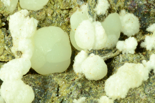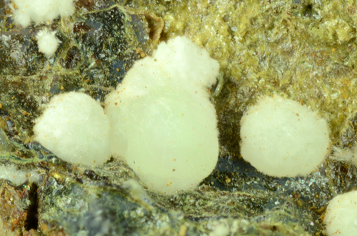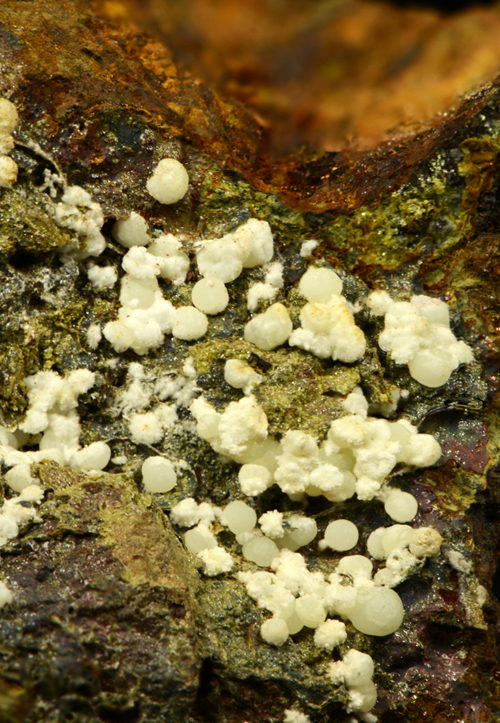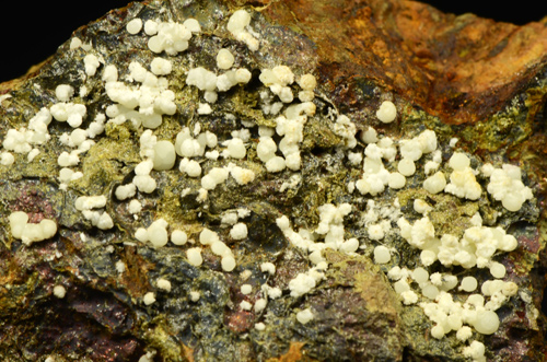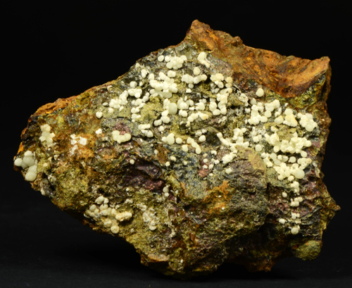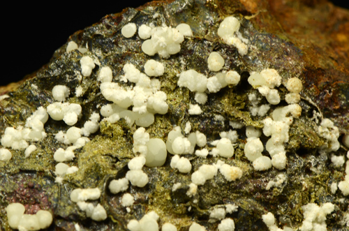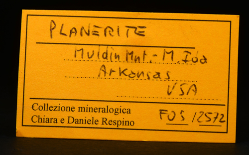 A rich array of Planerite in white-greenish spheres is scattered atop this piece. Planerite is a quite rare Al bearing phosphate, known only in very few locales in the world. The Planerite spheres are associated to another mineral, in white tuffs as you can see from the pics, that I was not able to identify. Former D. Respino collection, with label. The piece also retains a previous anonimous label, handwritten.
