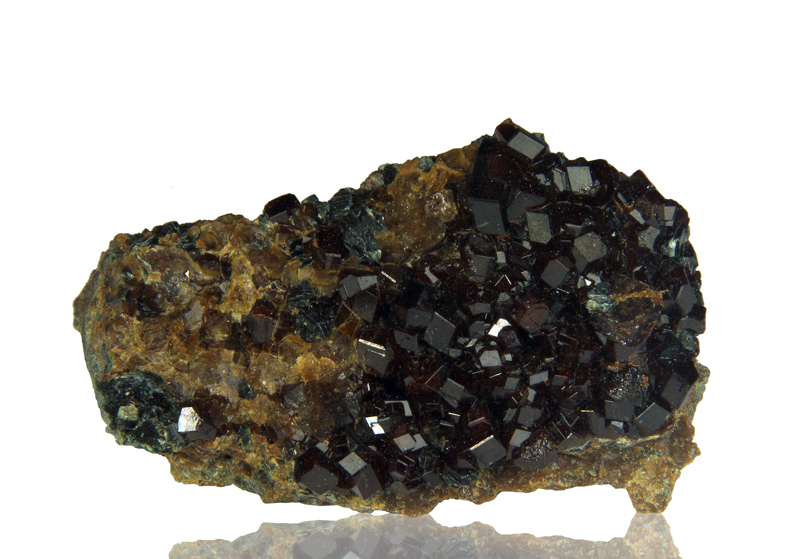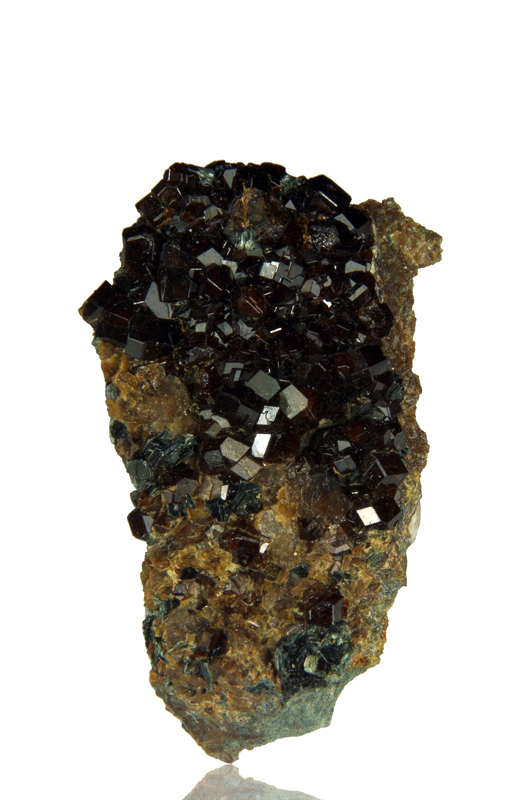 This specimen offer many dark red hessonite crystals of text book shape with minor clinochlore.