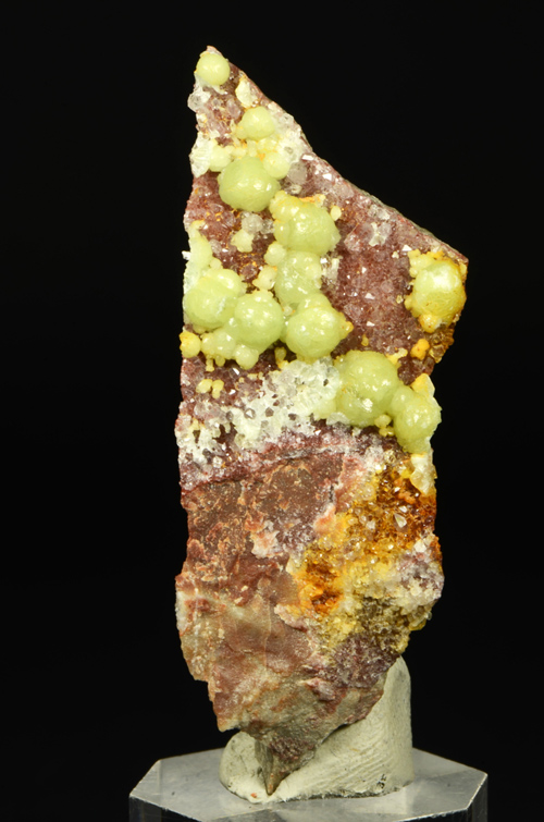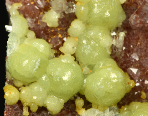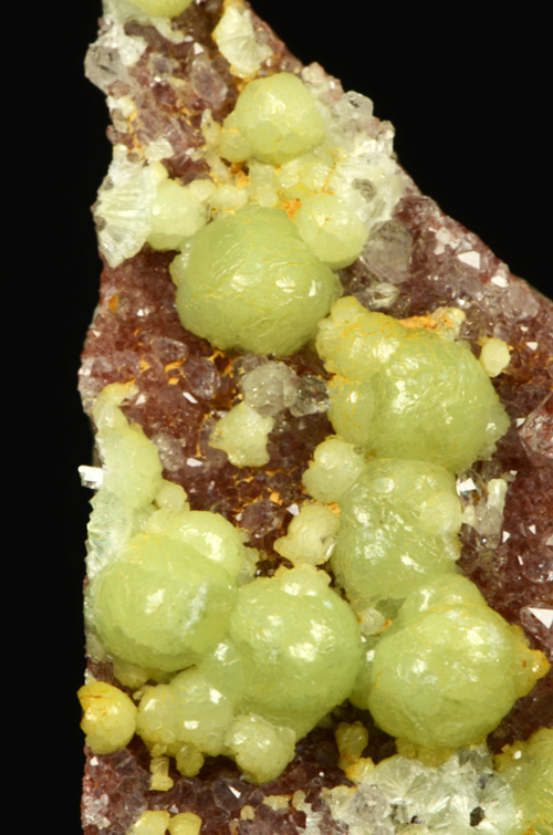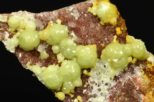 Several apple green globular aggregates of Variscite are scattered on matrix.