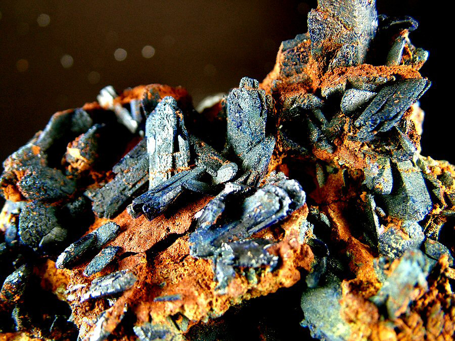 Numerous Azurite's crystals, up to 15 mm, cover the matrix. The color is a very intense blue, with waxy shine. Photographed under strong light.