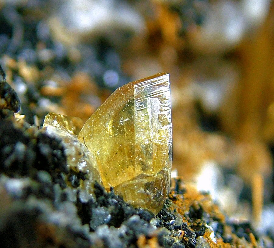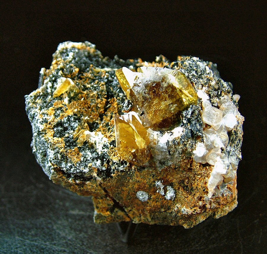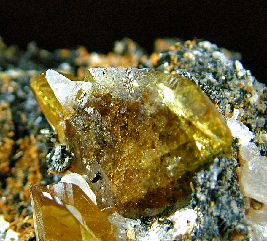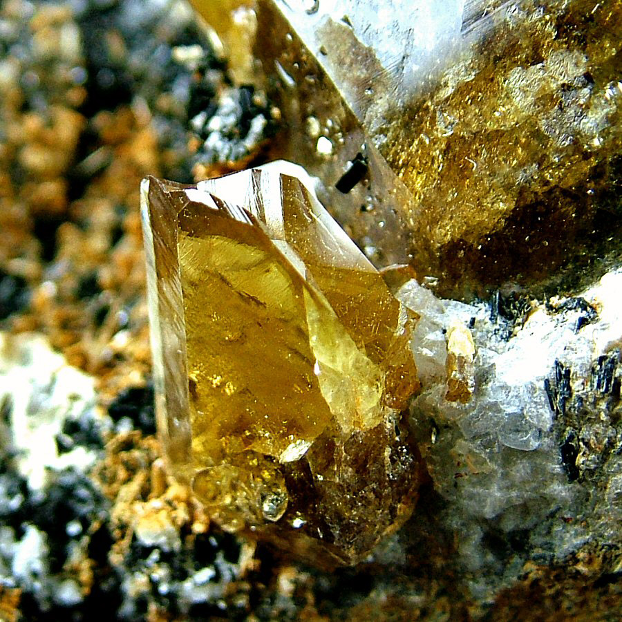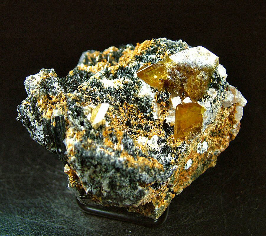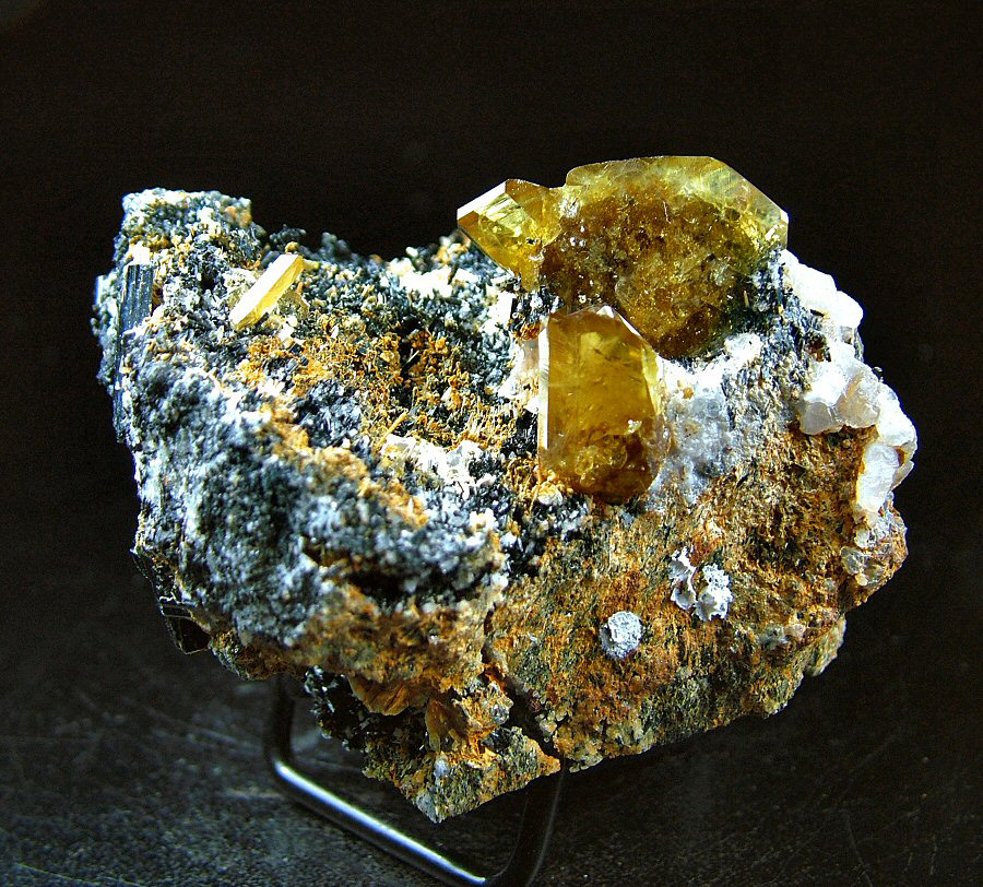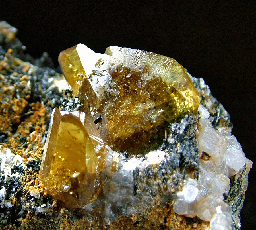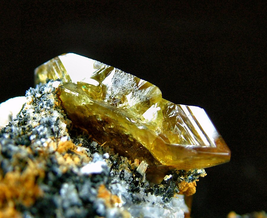 Wonderful Titanite's crystals, the biggest is 28 mm, gemmy, very glossy and well formed, with a marvelous intense yellow color and well evident on the matrix, are accompanied by a carpet of dark Ferro-Actinolite's crystals. Very nice sample, in very good conditions, a definitive piece. With a cut on the base, photographed under strong light.