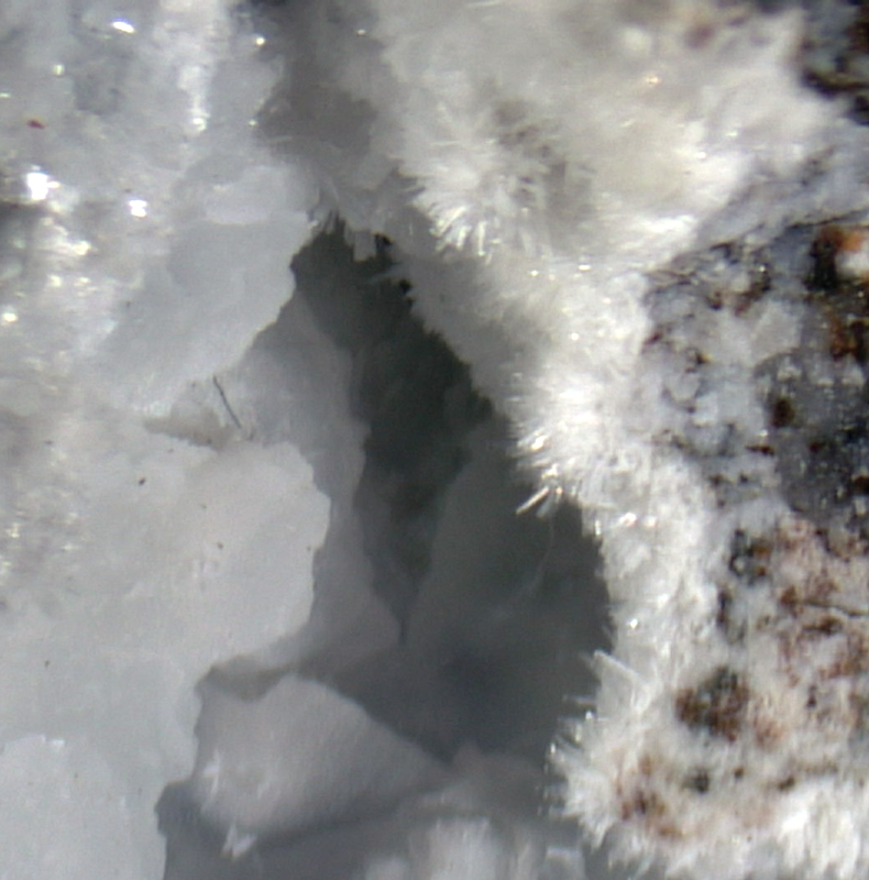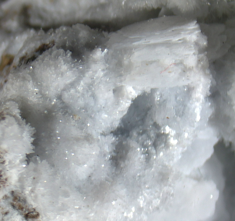 Colorless to white acicular portlandite xx on matrix.